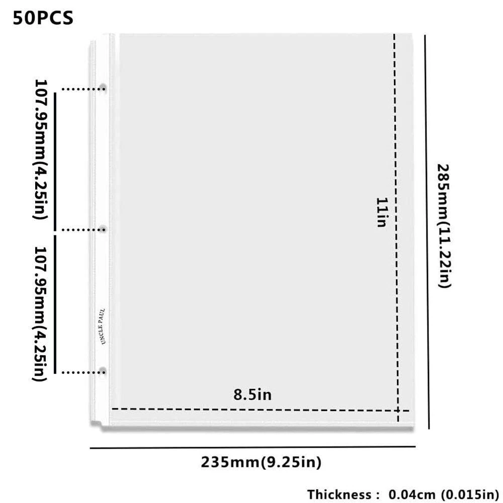 HIGH QUALITY - A pack of 50 sheets, made of durable PP material, acid free, odor free, safe and eco-friendly HIGHLIGHT TRANSPARENT - Clear finish reduces glare and makes the viewing archiving documents, papers, photo etc super easy EASY TO USE - Easy top loading sheet protectors feature makes it quick and easy to insert letter size(8.5" x 11")sheets 3 RING DESIGN - 3 holes perfect for filing in 3 ring binders and folders, keep your important documents safe WIDE USAGES - Storage for documents, copy papers, photo papers, records, recipes, business documents, and reference material at home, school or office etc