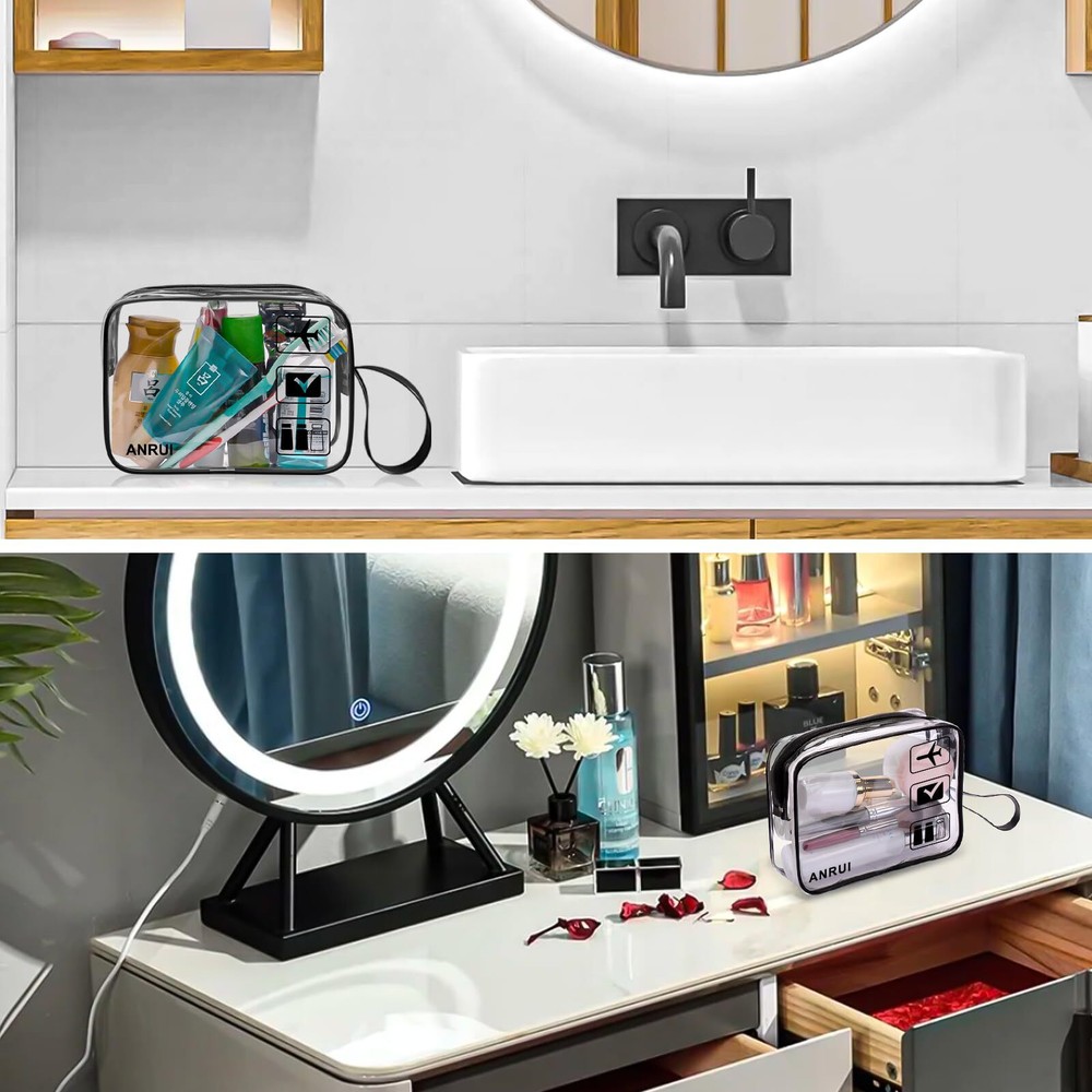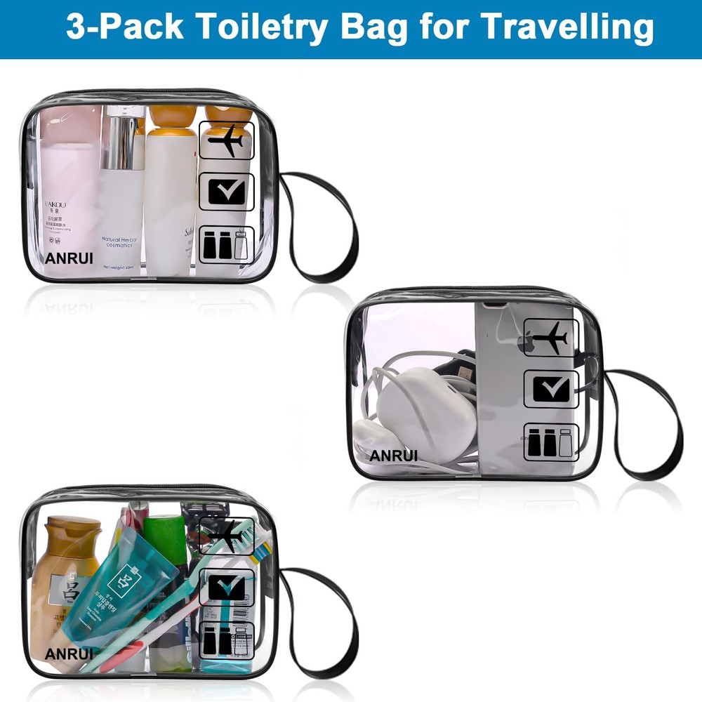 ANRUI 3pcs TSA-Approved Clear Travel Toiletry Bag With Handle Strap, Airline Kit 3-1-1 Clear Liquids Toiletries & Cosmetics Organizer Carry-On Luggage for Women and Men - Black TSA Approved:TSA approved toiletry bag/quart size bags are fully compliant with TSA 3-1-1 rules and regulations of all airlines. Get through airport security easy and fast. Save your time and no more hold ups or hassles at the airport See Through and Waterproof Secure: TSA airline toiletry bags are made of transparent PVC material, eco-friendly to see and get items quickly. Advanced seamless crimping process are waterproof to to hold all your items included Liquids, at least resistant to leaks. Enjoy your travel without worries Improved Zipper and Handle Strape: Sturdy smooth zipper, large zipper opening and luxurious zipper puller make it easy open and pack. And it is corrosion-resistant. Zipper bag is more durable than those inferior zip-top bags. With all research on toiletry bags, we add handle strape to make it more convenience Carry-on Size Stay Organized: Quart travel bag measure is 7.7 x 5.5 x 2.5 inches, convenient to carry on when you are travelling or go out. Ideal for liquids, shampoo, liquid soap, lotion, perfume, cosmetics, toothpaste, toothbrush, comb and so on Lightweight & Satisfactory Customer Service: The clear toiletry bag is less than 1 lb., perfect size to fit in your carry-on luggage for travel or vacations Description 1 Quart Standard Size TSA Approved Toiletry Bag 3 pack (Same Size), qualified 3-1-1 Rules in all the airports. Dimensions : 7*5.5*1.8 inch / 18*14*4.5 cm, about 1 Quart (1130ML) (If you want bigger size clear toiletry bags, please find another style in our store.) More Advantages: With this TSA approved toiletry bags, you will pass airport security quicker and easier. With better quality zipper, no stuck when you are using the toiletry bags. With these clear bags, you will easy organize travel essentials or daily stuff, such as toys, makeups, USB cables. With extra hand strap, easy to hold up the bags when you are organizing makeups. SHIPPING Domestic Buyers - We have confidence in our products, but if you are not fully satisfied please contact us within 30 days of purchase and you will get full refund. - We ship within 3 business days of payment, usually sooner - We offer FREE shipping on all orders! - We only ship to the lower 48 states, no APO/FPO addresses or PO Boxes allowed International buyers – please note: Import duties, taxes, and charges aren't included in the item price or postage cost. These charges are the buyer's responsibility. - Please check with your country's customs office to determine what these additional costs will be prior to bidding or buying. * Order Cancellation Policy ** You can return a product for up to 30 days from the date you purchased it. 1. The seller reserves the right to cancel the special case only due to eBay cancellation fee. 2. The decision of seller is the final. 3. The seller will respond to the cancellation request within 2 business days. Please wait for the result of cancellation. 4. In case the cancellation is not completed by some reasons, the buyer can follow the options below to get the refund. 4.1 The buyer can reject the item when it arrives. 4.2 The buyer can send the item back to the seller within 30 days If the buyer receives item (USA Shipment ONLY). The seller will provide the FREE return label to the buyer when the buyer opens " Return Item" case on eBay by using the reason as "Change my mind" ONLY. 5. When buyer has placed the order. The order will be processed and completed by automatic warehouse system within 5 minutes. In case that buyer sends the cancellation request after 5 minutes of placing the order, the request will be rejected. **Sending direct message to cancel the order is not allowed for every case.* Return Policy For the return case - If buyer would like to return the items for refund or replacement, please CONTACT SELLER to receive the free return label from seller. The refund or replacement will be processed with the tracking number of return label which is provided by seller only. The other ways of return which are not approved by seller will not be processed for the refund or replacement.