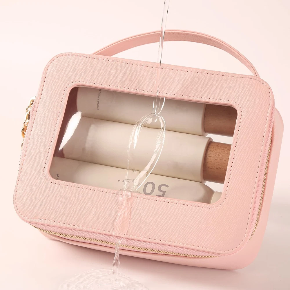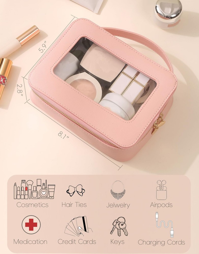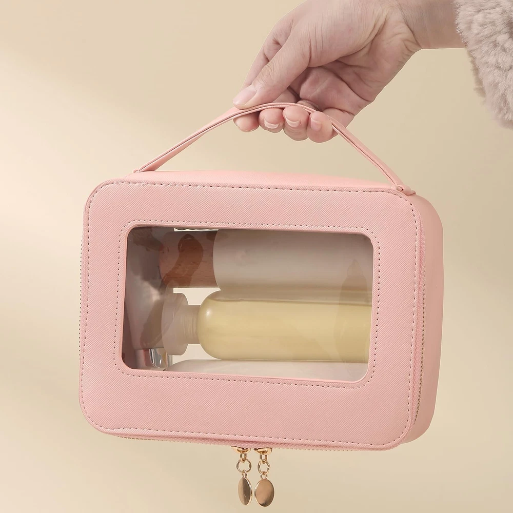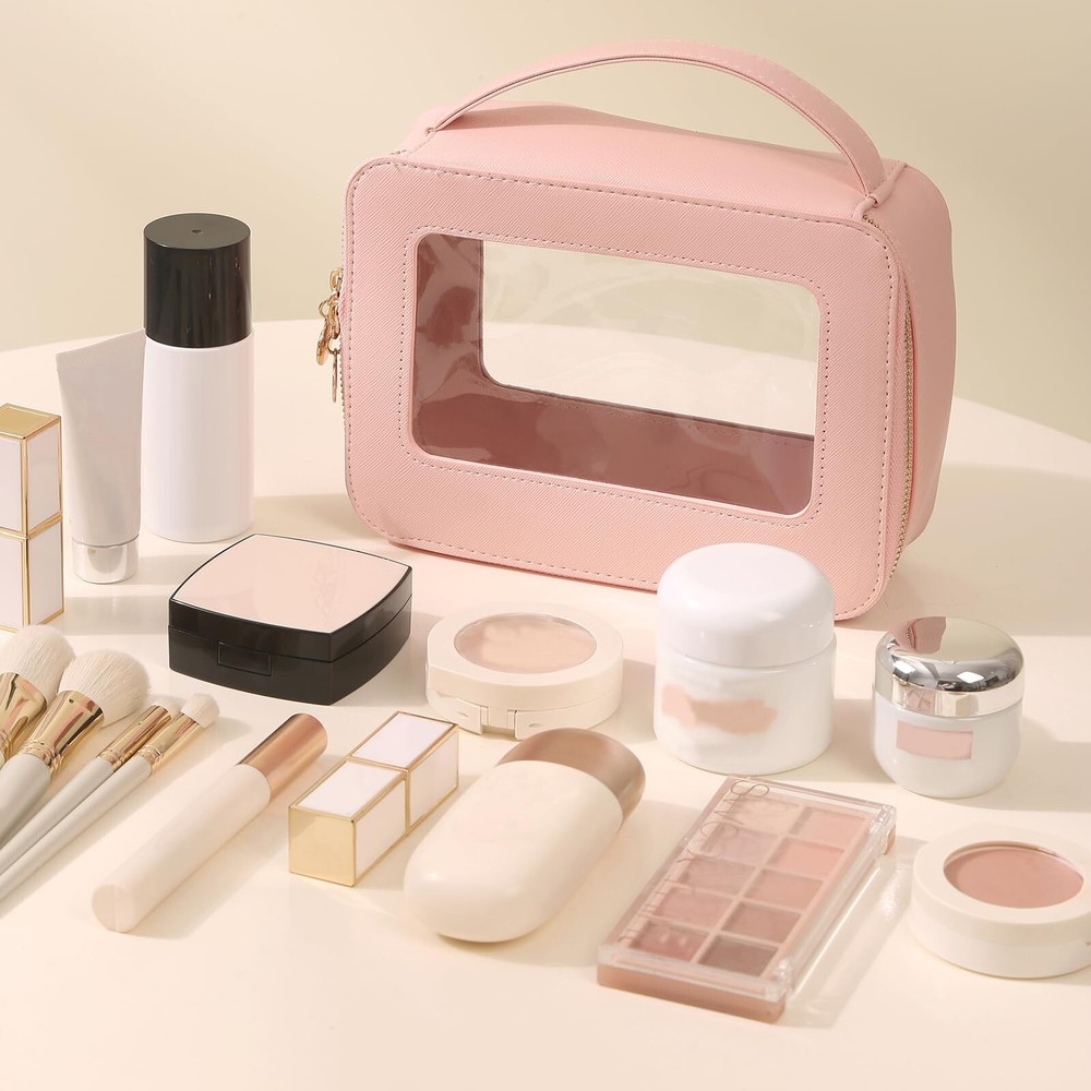 Clear Makeup Bag Transparent Cosmetic Bag Large Toiletry Bag With Zipper Double Sided Travel Makeup Bag For Women Waterproof Pink Product Details Color: Pink Brand: Meiyuuo MPN: Does not apply UPC: Does not apply EAN: Does not apply Product Dimensions : 8.07 x 2.76 x 5.9 inches; 5 ounces Department : Women Manufacturer : Meiyuuo Country of Origin : China CLEAR VISIBLE WINDOWThis transparent makeup bag comes with one big compartment that open from the top, large capacity. No need to dig your items all time! This large makeup case is designed to keep all of your beauty essentials organized. It holds it's structure and shape ROOMY & STYLISH Measuring 8.07'' x 5.9'' x 2.76'', this makeup travel organizer embodies luxury sleek and style. The PU leather is waterproof and durable, scratch-resistant, anti-collision. The stitching is nicely done. The front and back both made of transparent PVC material, you can clearly see what is stored inside VERSATILE & WATERPROOFThe makeup bag offers ample space for cosmetics, brushes, skincare essentials, and items like art pencils, cables, and chargers; For bathing essentials, can hold a travel size shampoo, conditioner, a mini body wash, body spray and lotion and other little items. The water-resistant material ensures easy cleaning with a simple wipe with a damp cloth or wet tissue MULTIFUNCTIONALThe Meiyuuo Clear Makeup Bag is perfect for a gym bag, school locker, purse, car bag or backpack. It can hold make-up, hair accessories, snacks, playing cards, phone &computer cords, keys,jewelry or any number of small items for a person on the go FASHIONABLESimple and elegant make up bag with sense of design, zippers are smooth and sturdy. Premium quality, adorable colors, decent size, is a ideal presentation choice for a female friend on Valentine's Day, Women's Day,Teacher's Day Mother's Day, Christmas, birthdays, anniversaries