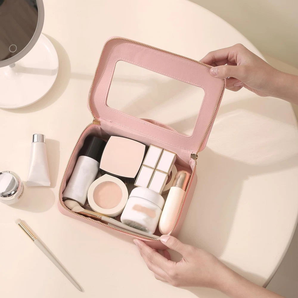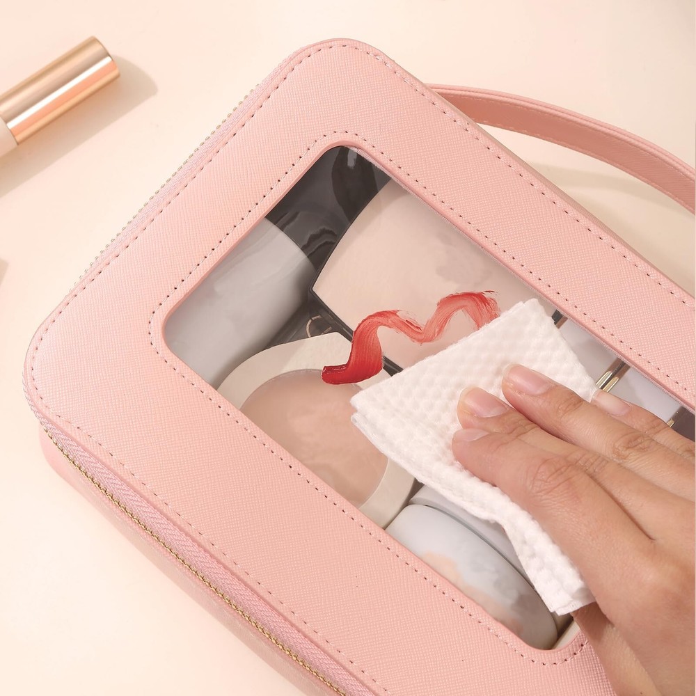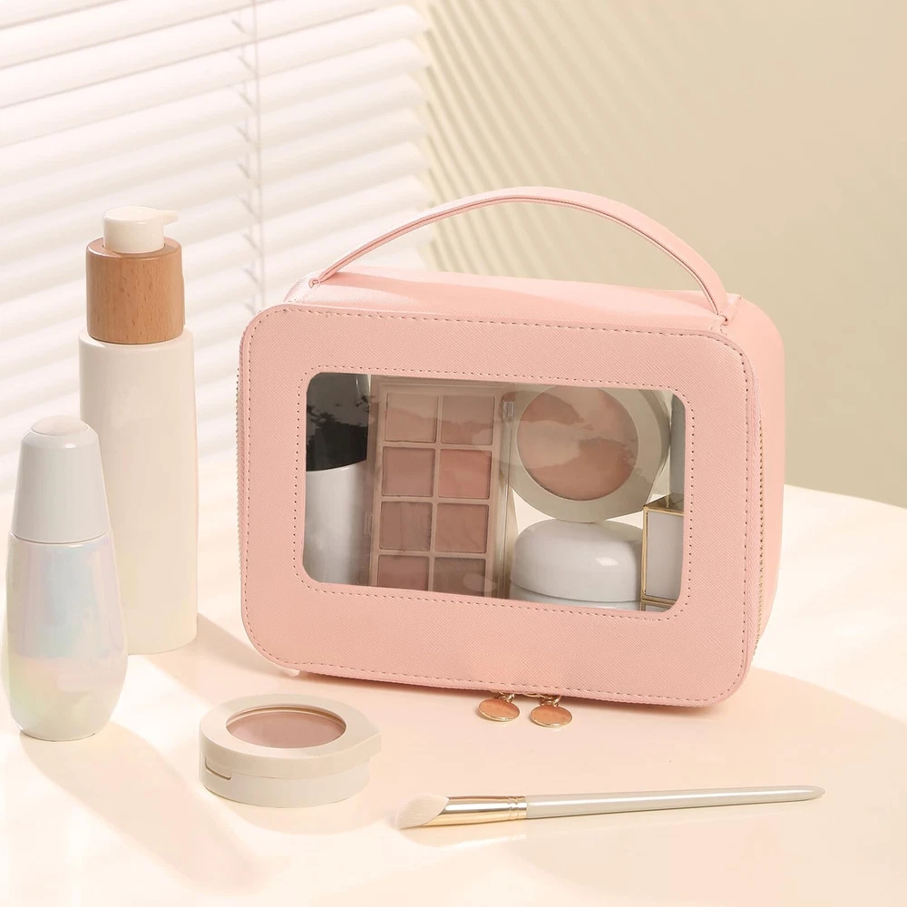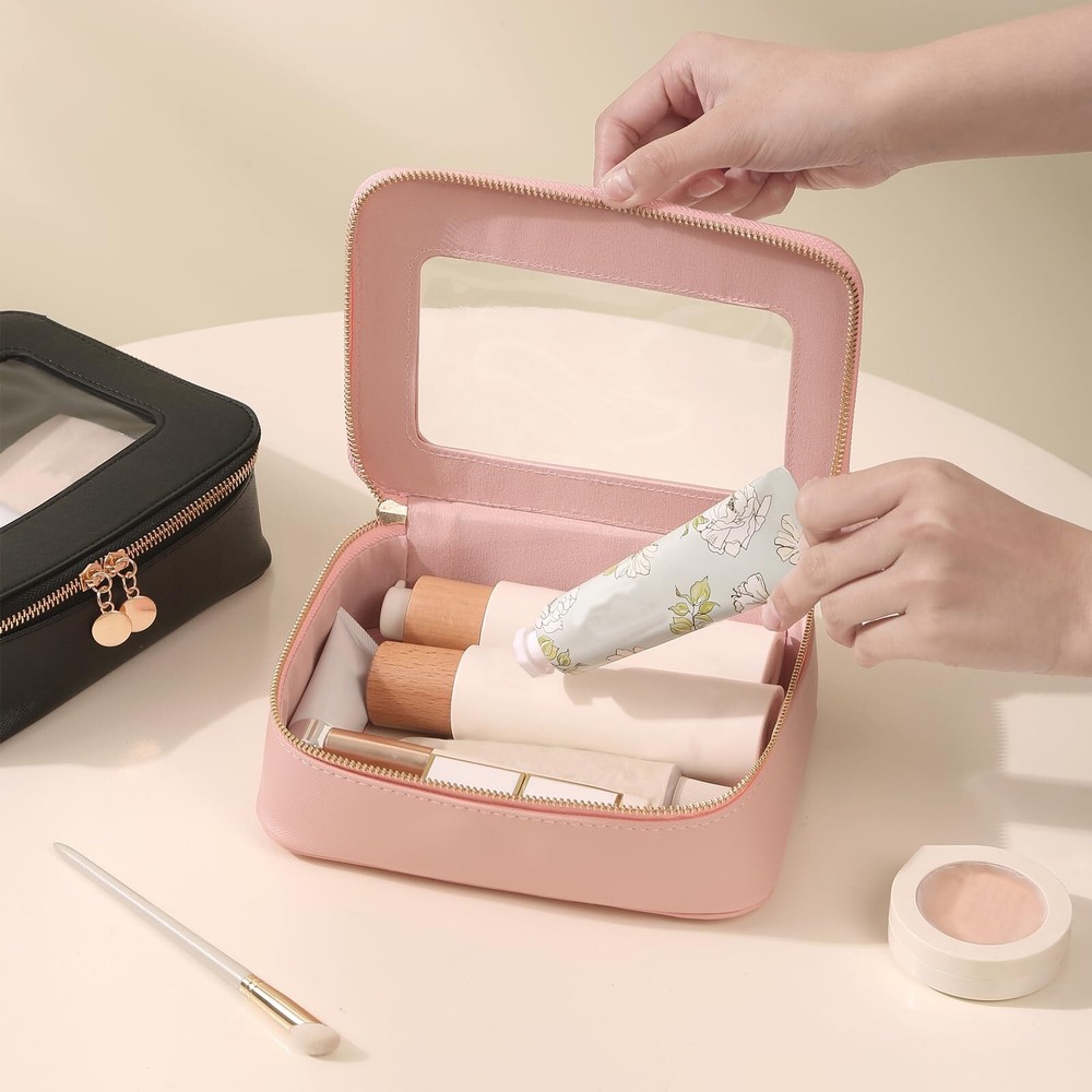 Clear Makeup Bag Transparent Cosmetic Bag Large Toiletry Bag With Zipper Double Sided Travel Makeup Bag For Women Waterproof Pink Product Details Color: Pink Brand: Meiyuuo MPN: Does not apply UPC: Does not apply EAN: Does not apply Product Dimensions : 8.07 x 2.76 x 5.9 inches; 5 ounces Department : Women Manufacturer : Meiyuuo Country of Origin : China CLEAR VISIBLE WINDOWThis transparent makeup bag comes with one big compartment that open from the top, large capacity. No need to dig your items all time! This large makeup case is designed to keep all of your beauty essentials organized. It holds it's structure and shape ROOMY & STYLISH Measuring 8.07'' x 5.9'' x 2.76'', this makeup travel organizer embodies luxury sleek and style. The PU leather is waterproof and durable, scratch-resistant, anti-collision. The stitching is nicely done. The front and back both made of transparent PVC material, you can clearly see what is stored inside VERSATILE & WATERPROOFThe makeup bag offers ample space for cosmetics, brushes, skincare essentials, and items like art pencils, cables, and chargers; For bathing essentials, can hold a travel size shampoo, conditioner, a mini body wash, body spray and lotion and other little items. The water-resistant material ensures easy cleaning with a simple wipe with a damp cloth or wet tissue MULTIFUNCTIONALThe Meiyuuo Clear Makeup Bag is perfect for a gym bag, school locker, purse, car bag or backpack. It can hold make-up, hair accessories, snacks, playing cards, phone &computer cords, keys,jewelry or any number of small items for a person on the go FASHIONABLESimple and elegant make up bag with sense of design, zippers are smooth and sturdy. Premium quality, adorable colors, decent size, is a ideal presentation choice for a female friend on Valentine's Day, Women's Day,Teacher's Day Mother's Day, Christmas, birthdays, anniversaries