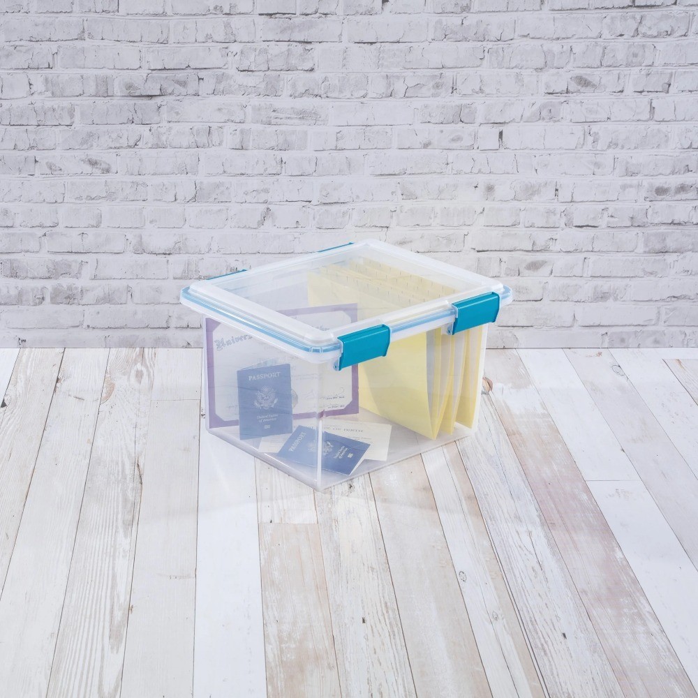 s Gasket Box line is the ideal storage solution for items that need to be stored away safely. These clear storage bins feature a gasket seal within the lid to safeguard against air and moisture, shielding your belongings from the elements, dust, and pests. Durable latches a tight and secure closure, and the clear design allows for quick and easy identification of contents from any angle. The 32 Quart plastic storage container accommodates legal and letter size hanging folders and is perfect for organizing and protecting school projects, paperwork and photographs. Store items away in garages, basements, attics, or anywhere in your home, and be confident that your items will stay protected. The overall assembled dimensions of this item are 18 1/2" L x 14 7/8" W x 11 1/8" H. 32 Quart Gasket Box, Weather-Resistant Clear File Storage Bin with Latch Lid, Blue Outside Dimensions: 18 1/2" x 14 7/8" x 11 1/8" Interior Dimensions at bottom: 14 7/8" x 11 7/8" x 9 7/8" Gasket seal and tight-fitting latches keep lid secured to base and safeguards contents Accommodates legal and letter size hanging folders Clear plastic lid and base allows you to view contents at a glance, without having to open the container Recessed lid allows bins to stack neatly to maximize vertical space Ideal step up storage solution for those items that need to be packed away and protected Use good judgment when stacking items, keep heaviest bin at the bottom and phthalate-free
