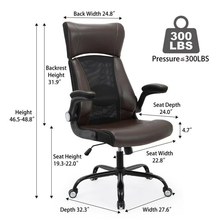 Return Policy Fast Delivery Trusted seller Clearance Executive Office Chair, Ergonomic Leather Desk Chair - Widened Adjustable Headrest with Flip-Up Arms, High Back Computer Swivel Task Chair with Lumbar Support, Brown Product Description ?【CREAT THE ULTIMATE WORK-STATION】-- If you are having difficulty finding a comfortable executive desk chair if you are a big & tall guy we have got a Leather computer chair for you! This office chair is to help you dream big! Unlike standard chairs that cause muscle stiffness, back pains, and discomfort, our office chair is ergonomically designed to provide the ideal neck and lumbar support. ?【MULTIFUNCTIONAL DESK CHAIR】--The adjustable widened headrest and lumbar support ensure anyone sitting in the chair gets their best position. The 20.47-24.21 inches seat height adjustment makes you comfortable in any sitting position. Rock back and forth to relax your back muscles and increase blood circulation while working. Perfectly suits your needs. Also, the seat can be pushed below any table owing to the flip-up armrest design, saving more space in the room. ?【BONDED LEATHER SEAT, DESIGN FOR THE COMFORT】--Not all artificial leather is created equally. This executive desk chair is upholstered in bonded leather that is resistant to scratches, stains, peeling, and cracking. The soft leather conforms very well to the body and relieves the problem of sedentary pressure on the sciatic nerve. With upholstered armrests and an elegant design look, this computer chair will complement your home or office perfectly ?【 BREATHABLE MESH BACK DESIGN】-- This ergonomic office chair features a breathable and shape-adapting mesh back that can effectively provide you with a breath for your back, and prevent the accumulation of sweat and heat. ?【STRONG DURABLE MATERIAL】-- Smooth-rolling executive chair on any kind of floor. Passed BIFMA 200,000 rolling test. The heavy-duty metal base for heavy-duty office chair. Weight capacity of up to 300 lbs. Shipping Returns Payment Shipping Shipping is FREE to all addresses other than APO/PO boxes in the lower 48 states. All our stock ships from US-based warehouses. Shipped via USPS or UPS (depending on location and package weight) Unless stated otherwise, all orders will ship within 24-72 hours of your payment being processed. Check our feedback to see the great reviews of FAST shipping we offer. Returns Seller does not accept returns Payment We currently accept payment via eBay managed payments only. Once payment is cleared, we will dispatch your shipment within 1-3 business days. Please refer to the "Shipping" tab for more information regarding shipping speed to your destination.