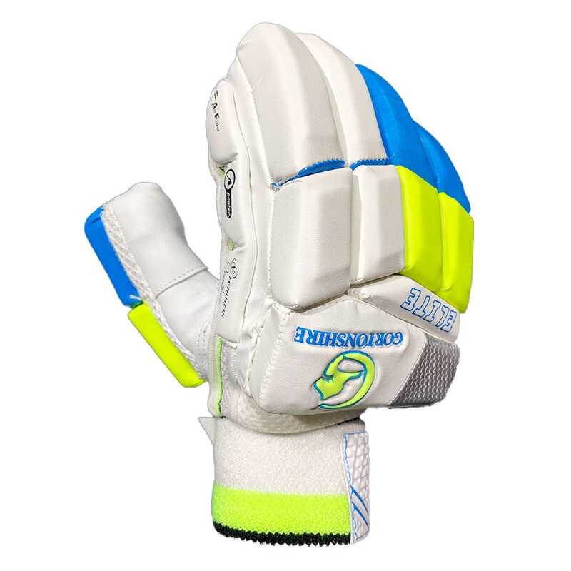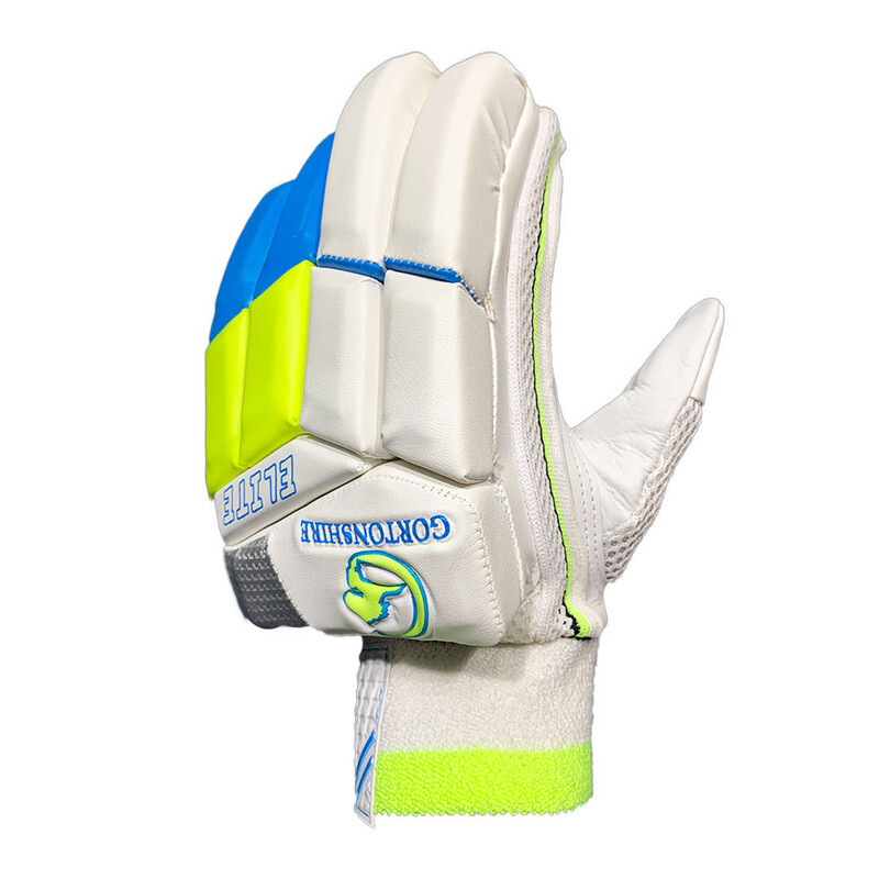 Features of Gortonshire Elite Cricket Batting Gloves : * Top quality imported Polyurethane finger rolls. * Nylon gusset for ventilation. * Sponge-padded polyurethane back for better fit and comfort. * Extra finger protection reinforced with a thermoplastic polyurethane insert in the first two fingers of the lead hand. * Cotton filled finger rolls. * High density foam reinforcement for higher protection. * Two-piece sidebars on lead hand. * Leather tabs on fingertips. * Toweled wristband with embossed Velcro® fastener. * Color may slight vary