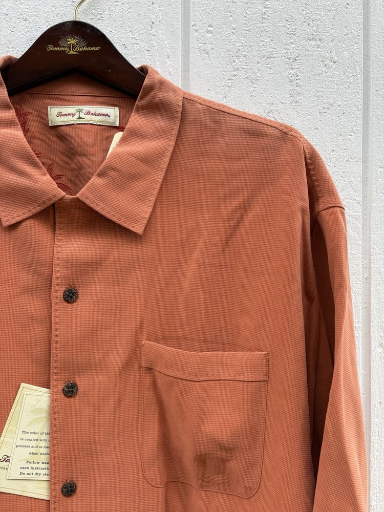 Tommy Bahama men’s silk BUTTON Down shirt made from 100% silk for a lightweight, smooth, and breathable feel. Perfect for casual wear, resort wear, or vacation style.Orange Tangerine color tone Condition: Brand new, unworn, and still in original packaging. This is a clearance item and has never been worn.