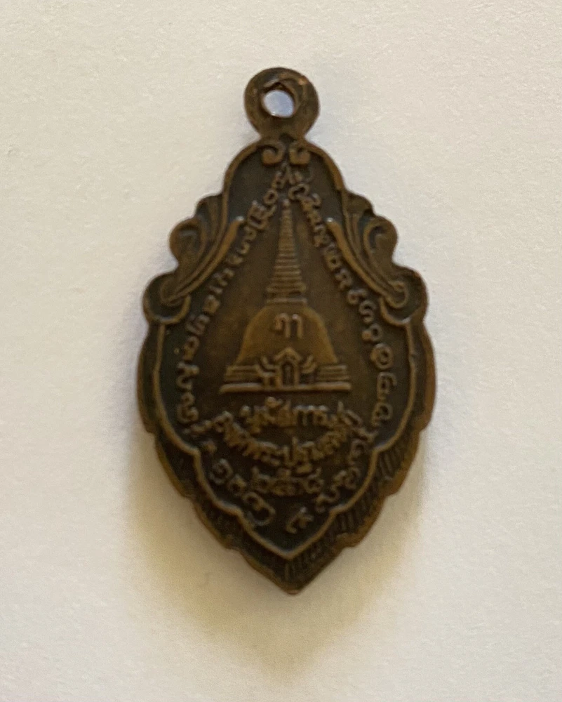 Original/Reproduction: Antique Original Featured Refinements: Thai Amulet Age: 1995 Maker: Wat Phra Pathom Chedi Country:: Thailand Temple:: Wat Phra Pathom Chedi Type: Amulets Color: Brown Region of Origin: Southeast Asia Primary Material: Copper