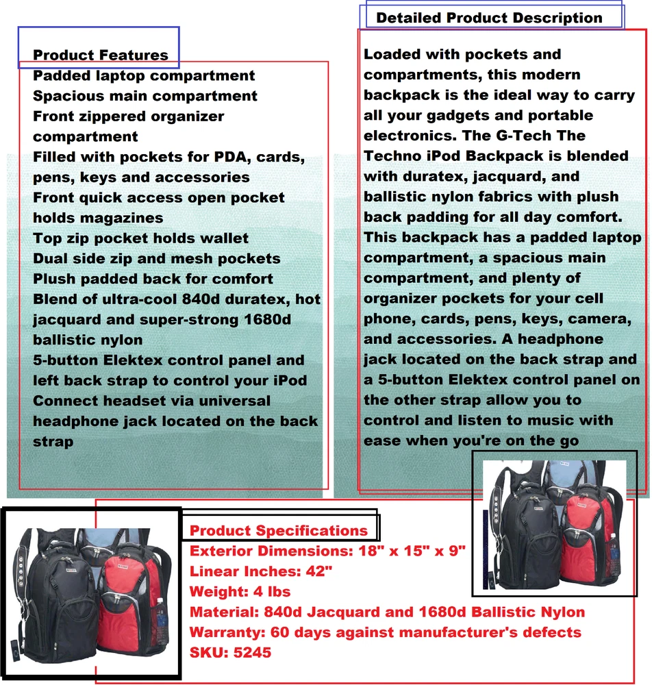 Product highlights: large backpack for docking iPods, including video iPods, iPod photos, iPod nanos and iPod minis 5-button built-in iPod control panel and headphone minijack on strap padded laptop compartment large main compartment zippered front compartment with pocket organizers top zip pocket for wallet dual zippered side pockets dual mesh side pockets large quick-access pocket padded back panel and straps rugged 1680d duratex, jacquard and 1680d ballistic nylon fabric 18"W x 15"H x 9"D warranty: 3 years Our 60-day money-back guarantee RED Travel Backpack Rucksack Laptop School Bag for Girl Women Men-NE