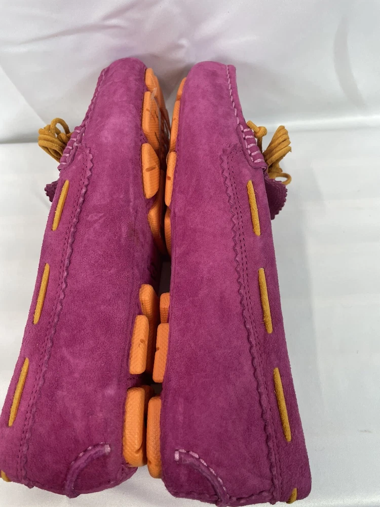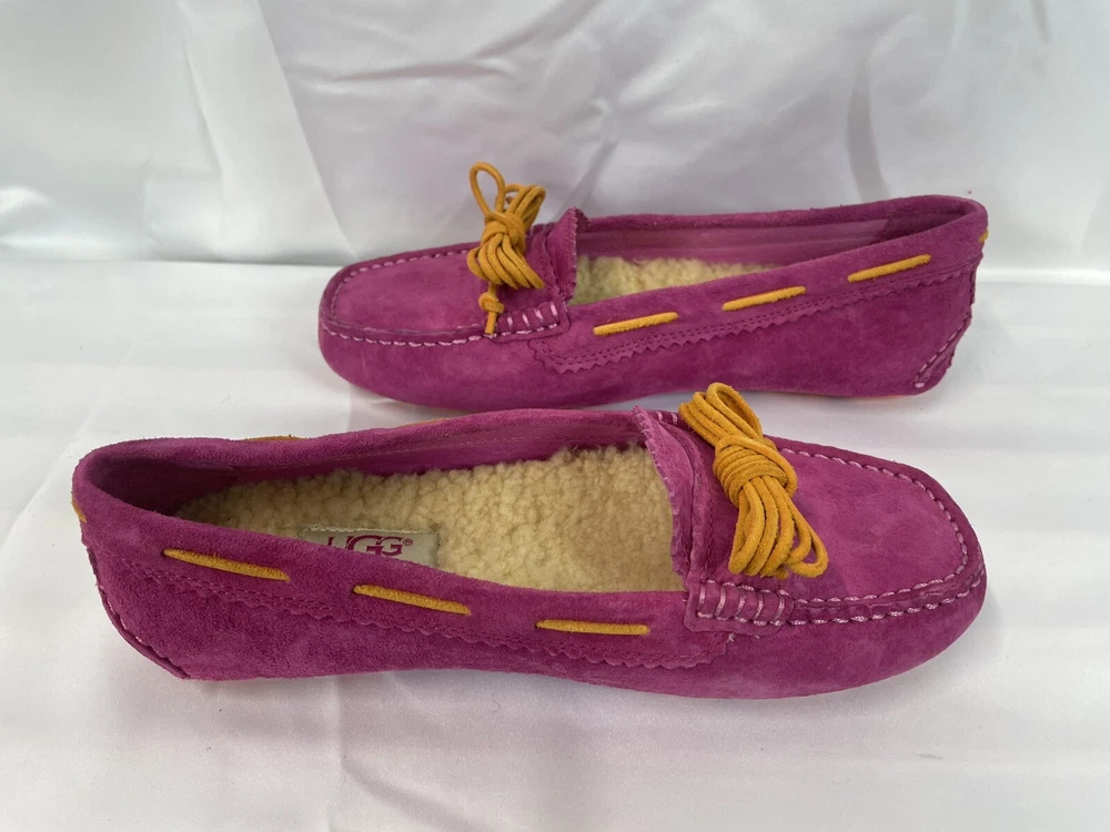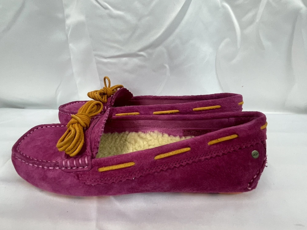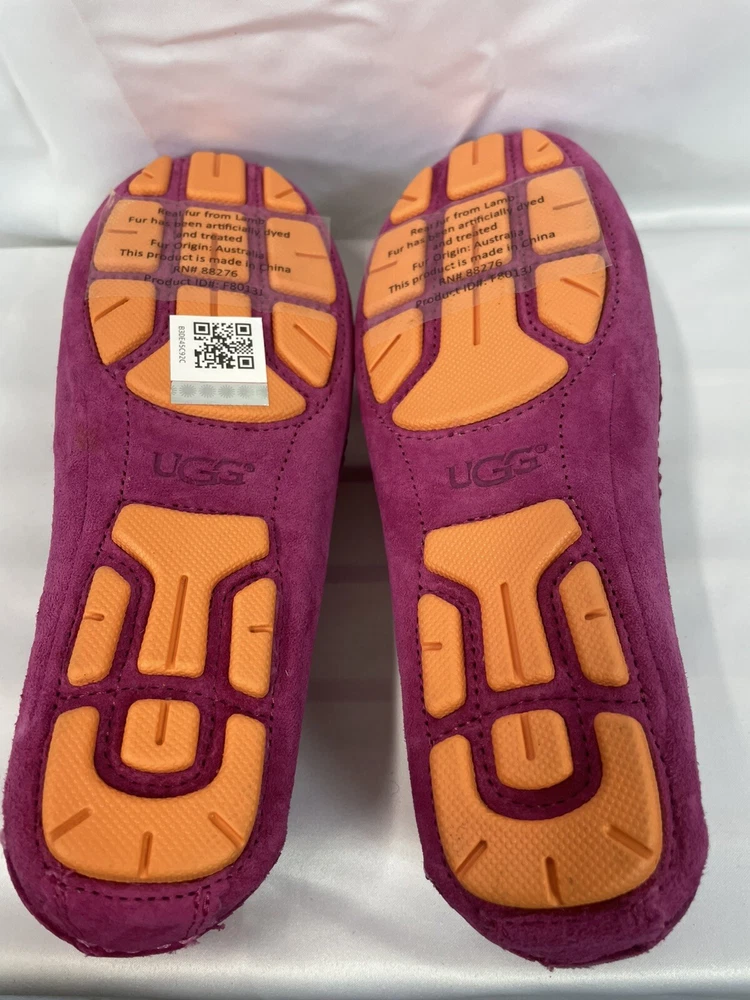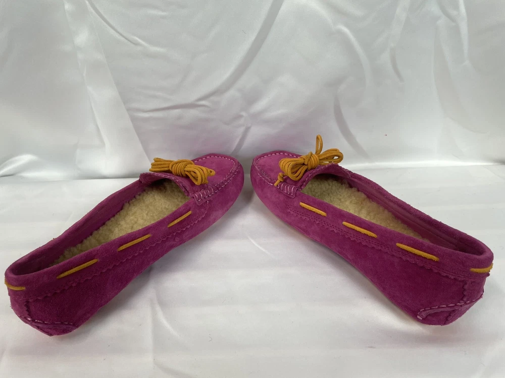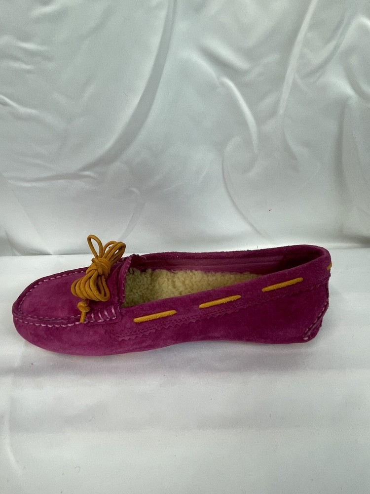 The UGG Australia Women's MEENA slipper in Pink, size 5.5, is a stylish and comfortable flat shoe perfect for the winter season. Made with high-quality leather and lined with cozy sheepskin, this slip-on style features a rubber outsole for added traction. The pink color adds a fun and feminine touch to any outfit, while the brand's reputation for quality ensures long-lasting wear. Ideal for women looking for a comfortable and fashionable option for colder weather. This item is part of our clearance sale to make room for new inventory. All items are in good condition and sold as is.