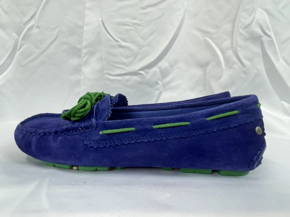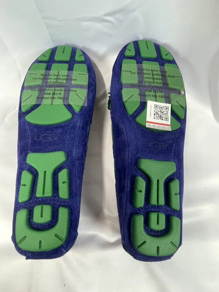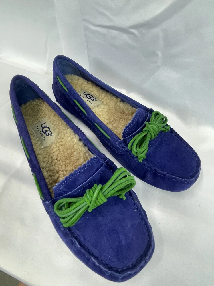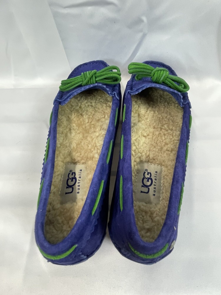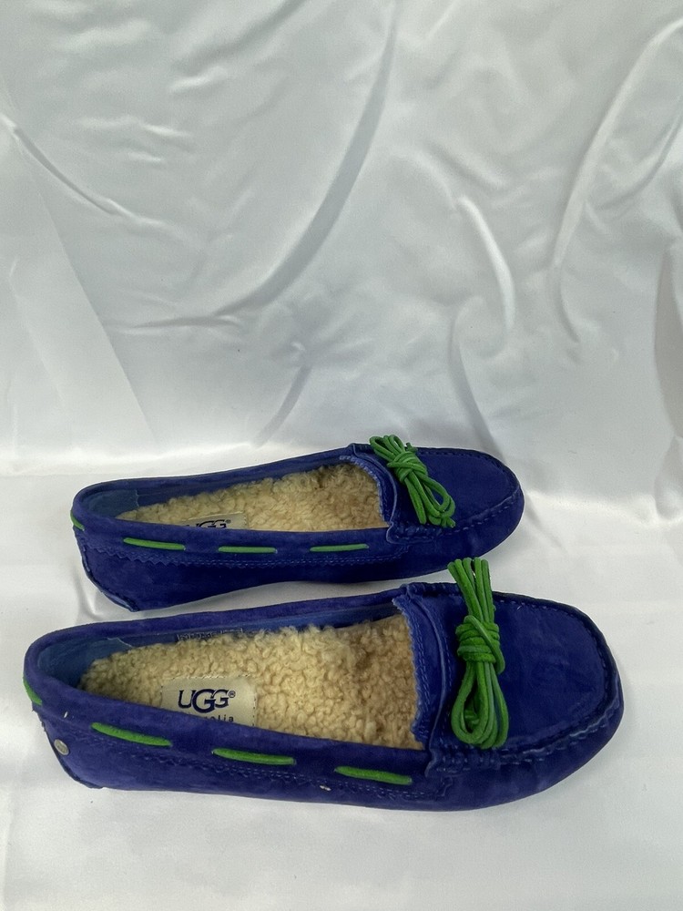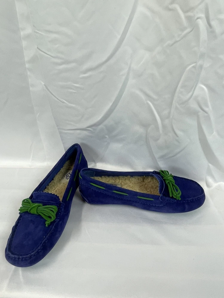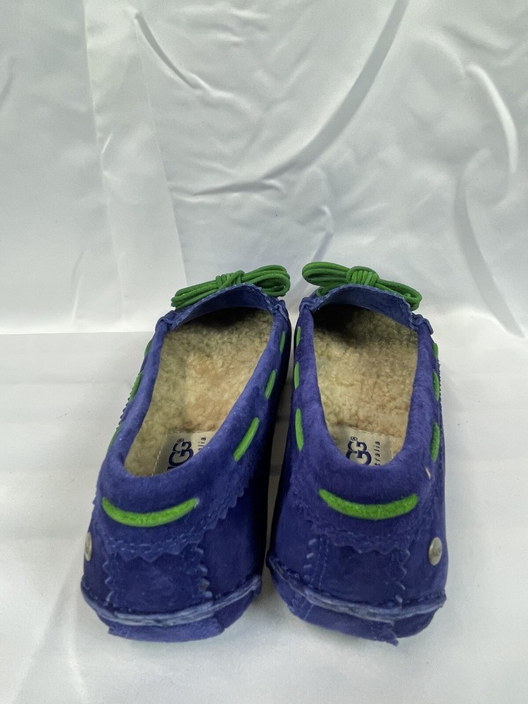 The UGG Australia Women's MEENA slipper in blue, size 5.5, is a stylish and comfortable option for the winter season. Made with sheepskin lining and a rubber outsole, these slip-on flats provide warmth and support. The leather upper material and insole ensure durability and added comfort, making them a practical choice for everyday wear. Perfect for women looking for a cozy and versatile shoe option. This item is part of our clearance sale to make room for new inventory. All items are in good condition and sold as is.