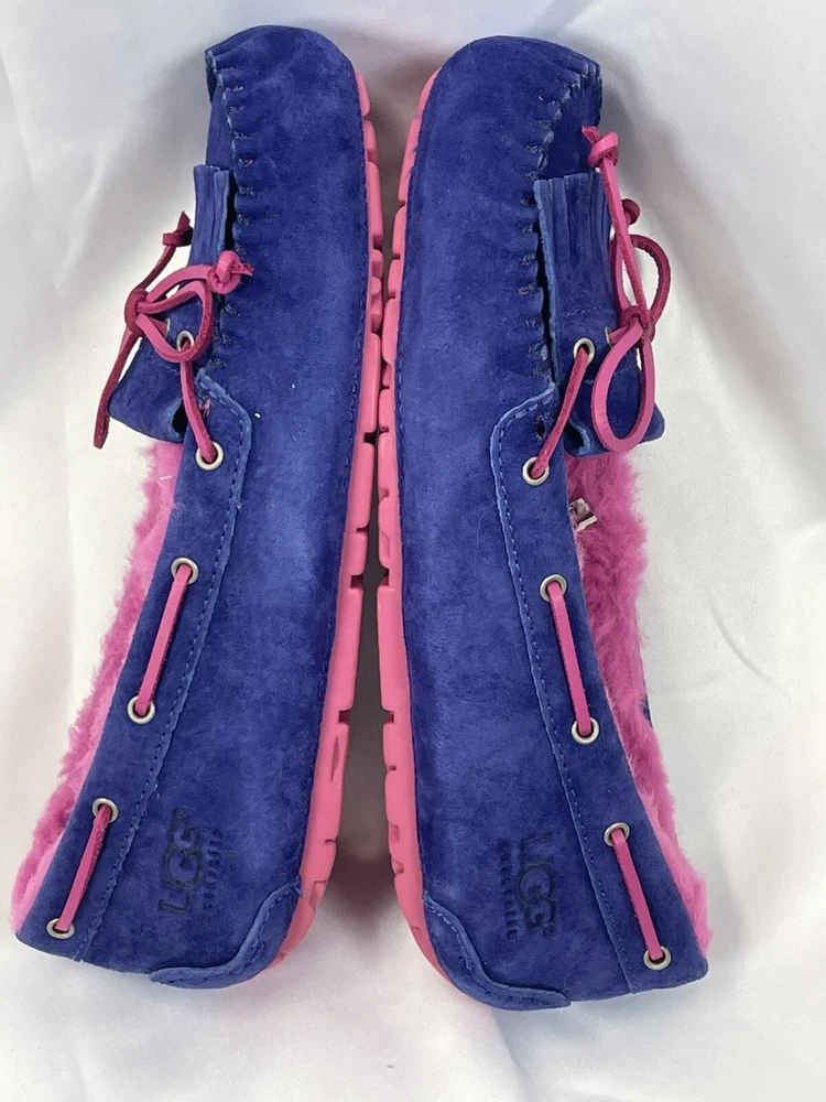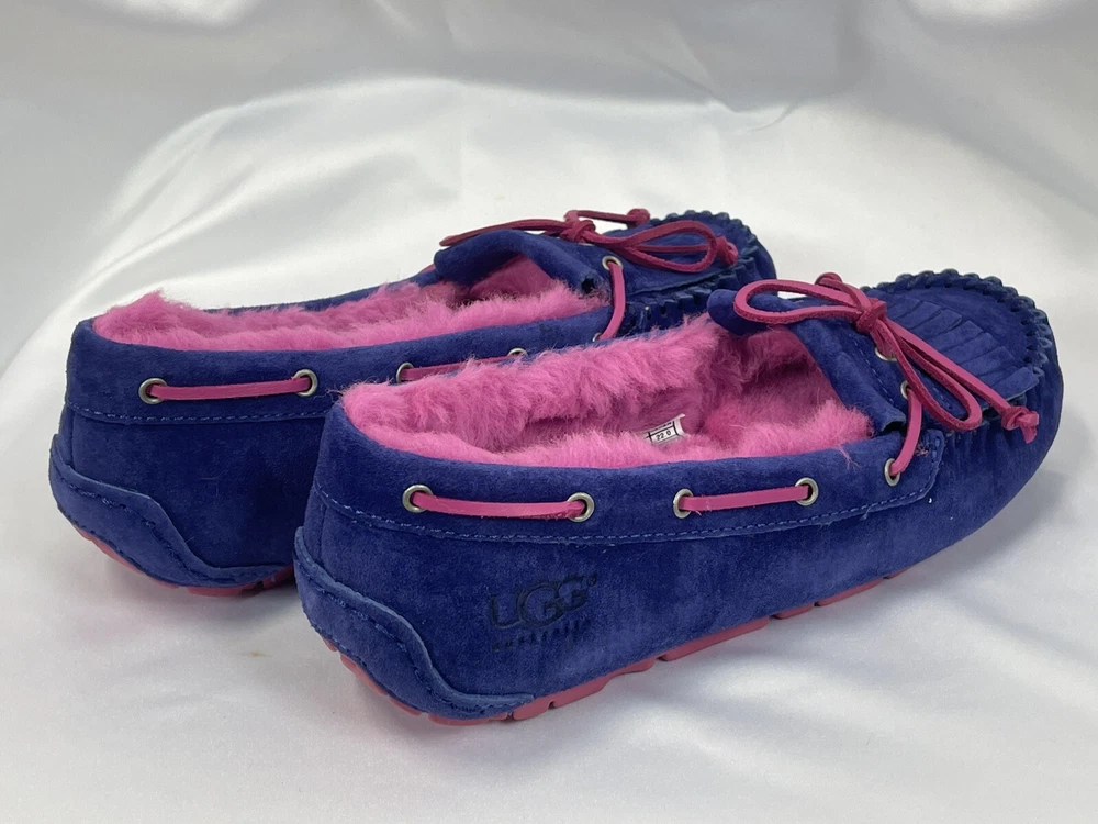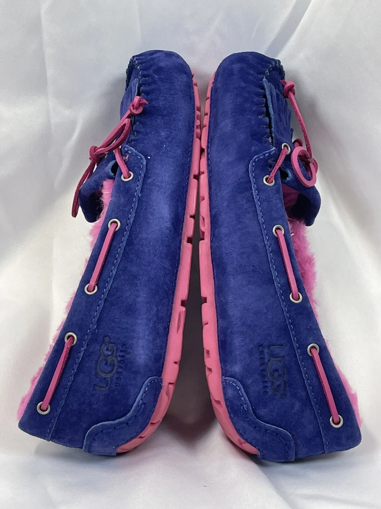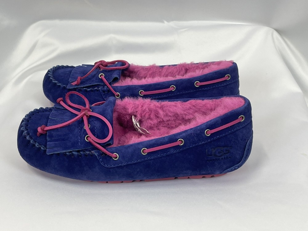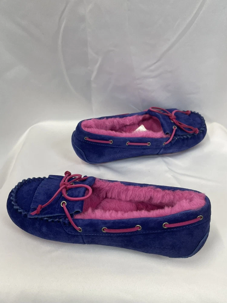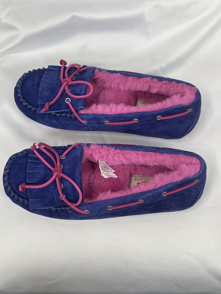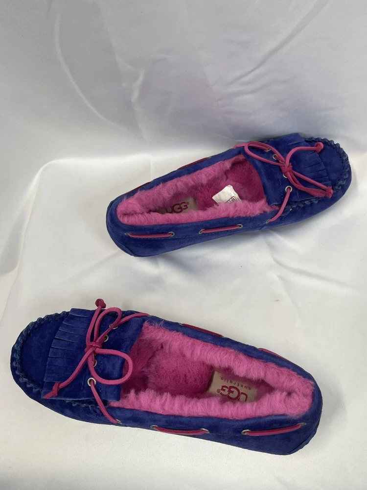 The UGG Australia slippers are stylish women's shoes made from 100% wool in a beautiful purple color. Featuring a slip-on style, these slippers are perfect for casual occasions and are designed with a wool lining for comfort. With a US shoe size of 5 and a UK shoe size of 3.5, these slippers are perfect for keeping your feet warm during the winter season. Made with a wool insole and a fur upper material, these UGG slippers are a combination of style and comfort, ideal for women looking for a cozy and fashionable footwear option. This item is part of our clearance sale to make room for new inventory. All items are in good condition and sold as is.
