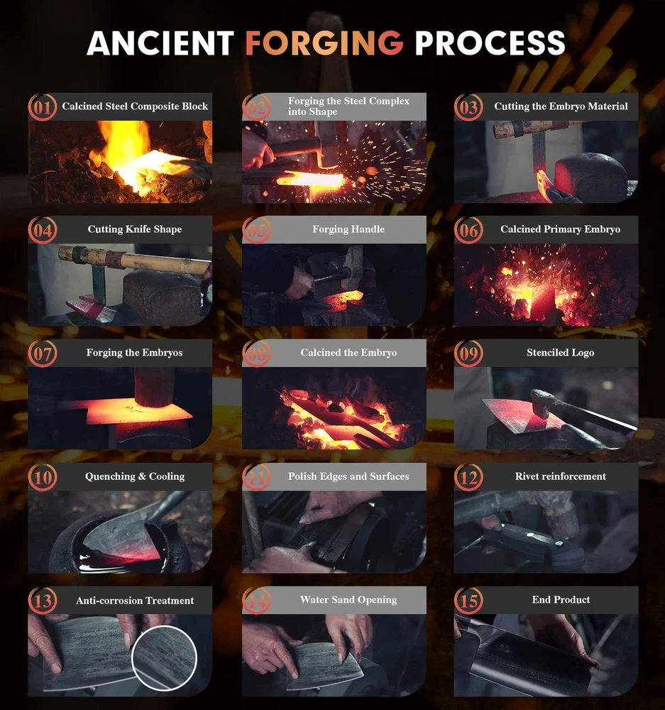 TRADITIONAL HAND FORGING TECHNIQUES - knife is hand forged by artisans with more than 40 years of experience. Compared with traditional kitchen knives, our cleavers can provide a longer service life. The whole process of forging knives goes through a series of continuous operation cycles like quenching, hammering, tempering, and clamping, which ensure the durability of the knives. This cleaver knife can re-sharpen multiple times without chipping. ANTI-RUST PROCESS & MULTI-PURPOSE - The upgraded Serbian chef knife adopts exclusive anti-rust process technology to solve the troubles caused by the rust of the knife. It can not only meet all kitchen daily needs such as slicing, dicing, mincing, chopping vegetables, chopping fruits, cleaving Meats, filleting fish, decomposing chicken, deboning and more, but also suitable for BBQ, hunting, hiking and camping. Whether indoors or out, it is definitely your practical assistant. PREMIUM STEEL & FULL TANG DESIGN - The meat cleaver is forged from high carbon steel which makes the blade ultra-solid. Ergonomically designed full tang wood handle and rivet design ensures comfort and maneuverability, effectively preventing handle breakage. It’s integrally formed, there is no need for welding and machine welding. The butcher knife is well-balanced to minimize numbness or pain in the palms and wrists, and no fatigue even after prolonged use! MAINTENANCE - Due to the high carbon content of forged knives, please keep the knife blade away from acidic, alkaline or corrosive substances and make sure to clean it regularly. After each use, be sure to rinse it with running water, then wipe off water stains with a cotton cloth. When not in use for a long time, you can apply cooking oil to the blade for added effect, and the meat knife in a dry place. This knife offers cutting performance with a little maintenance. AFTER-SALES SERVICE - Established many years ago, aims to provide premium kitchen knives with excellent sharpness, excellent balance and good practicality. Applying the principles of ergonomics and mechanical levers, we have greatly improved our customers' cutting experience. Our after-sales team provides you with a permanent after-sales service. You can us with any questions or doubts, we will reply to you within 24 hours and give you a satisfactory solution!
