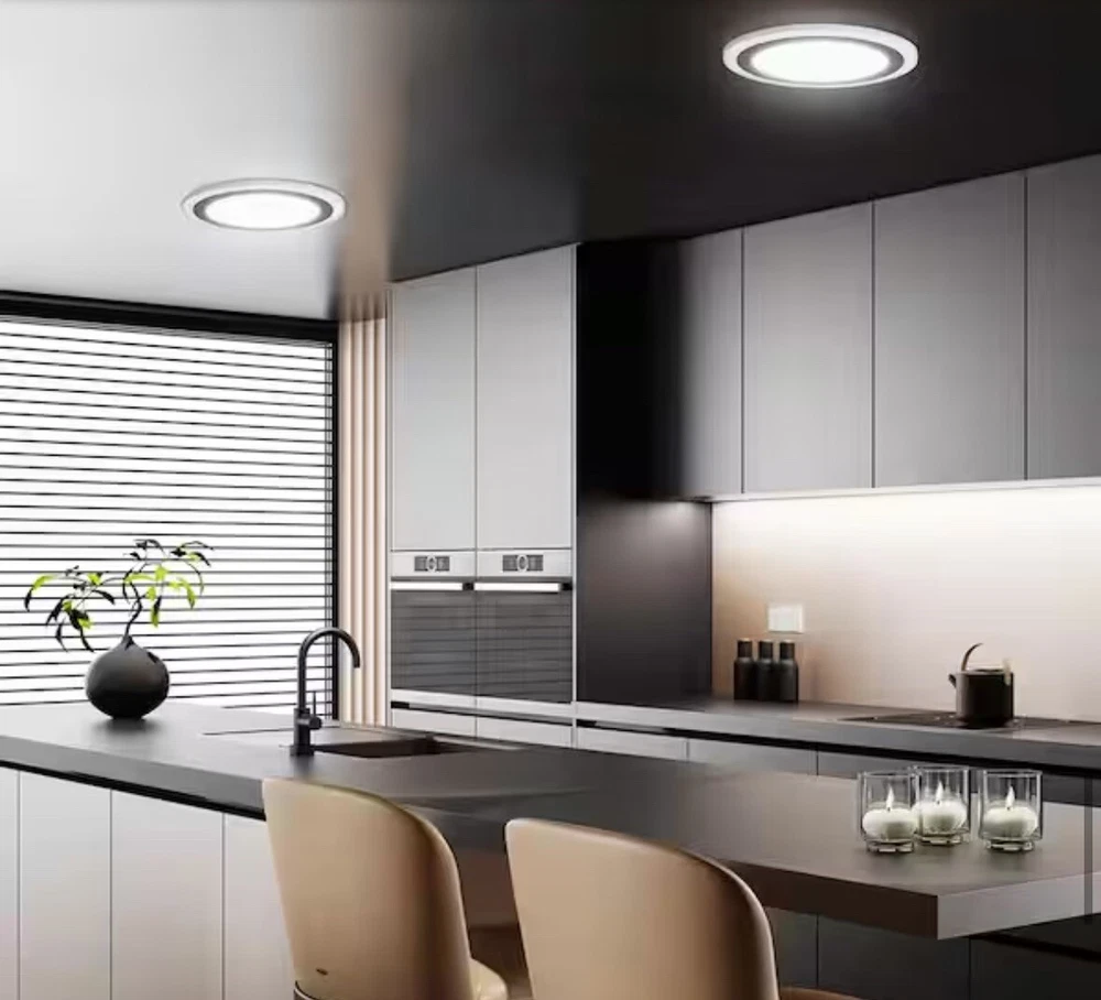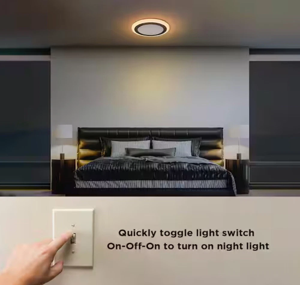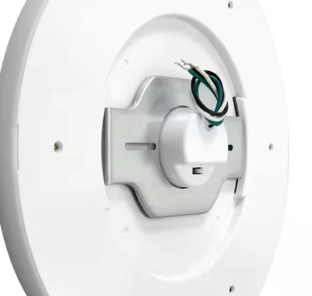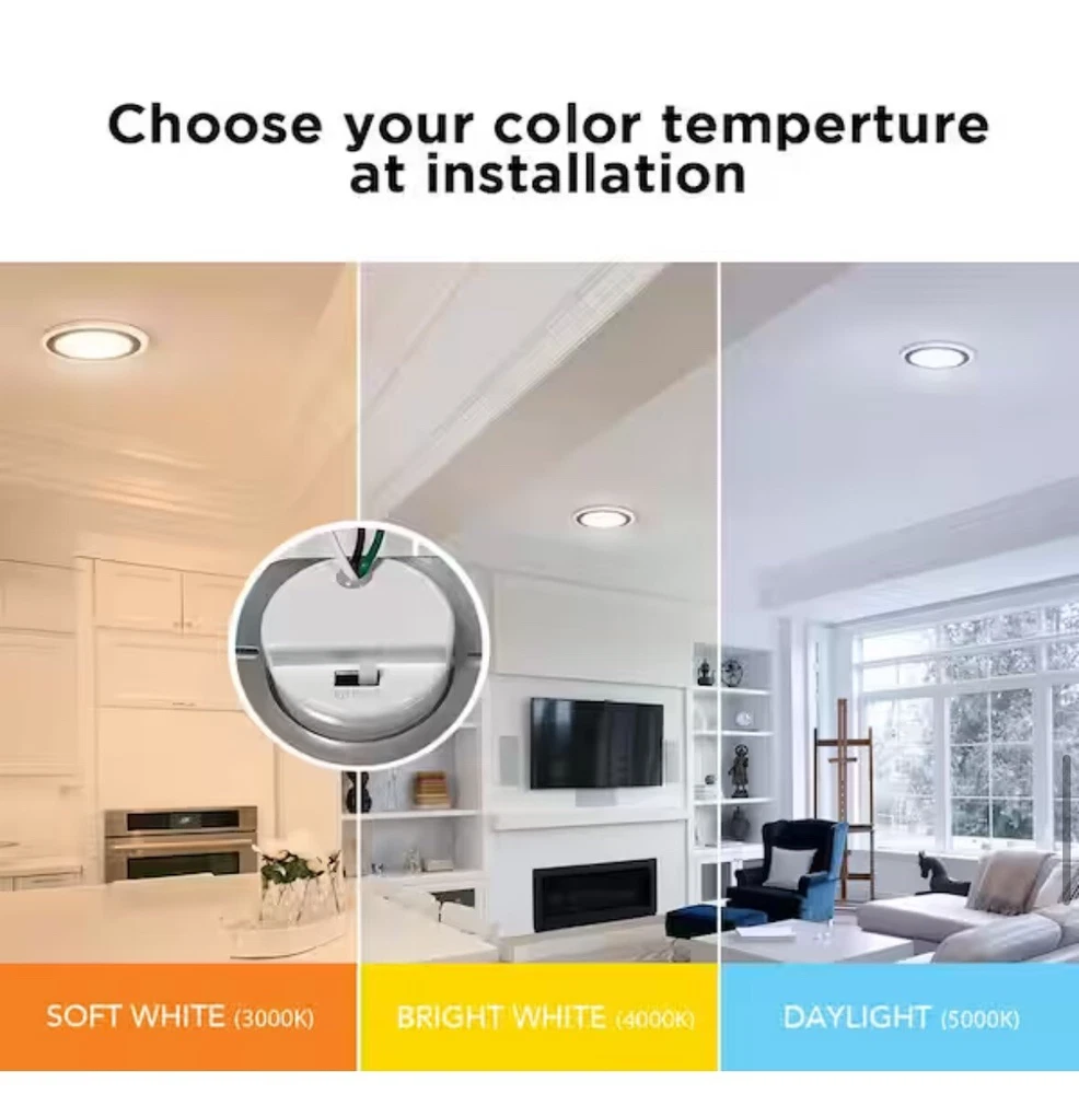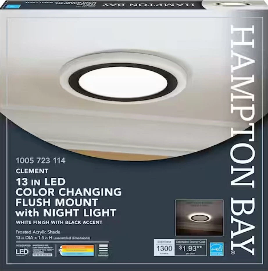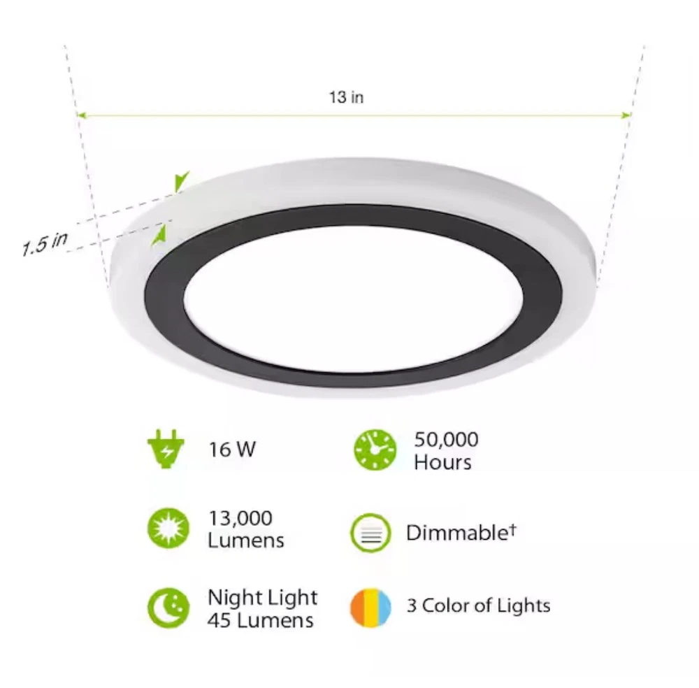 About This Product Add function and beauty to any residential or commercial area with this Hampton Bay FP13/3CCT/NL/HD 13 in. integrated LED round flat panel ceiling fixture. Use the switch on the back of the fixture to preselect the color temperature to meet your needs. You can select the color of the light, choosing between warm 3000K (soft white), clean crisp 4000K (bright white) or bright 5000K (daylight). After install, with a simple flip of a standard light switch you can easily toggle between your preselected light color and the amber night-light glow. An ultra-slim, edge-lit design with white polycarbonate lens and a decorative black ring to separate the daily light and night light. This energy-efficient fixture has long-lasting integrated LEDs, meaning no bulbs to replace, uses only 16-Watt of electricity and up to 79% less energy than a standard incandescent light bulb and produces even light distribution of 1300 Lumens. The streamlined design of these LED flat panels combined with an easy-to-install mounting bracket enables simple installation in both residential and commercial buildings. This easy to install light fixture has an average life of 50,000-hours/45.7-years, can be mounted as a ceiling flush mount and delivers ENERGY STAR approved dimmable lighting. Uses only 16-Watt Brightness: 1300 Lumens Flush mount ceiling installation Switch between regular light and night light modes after install Preset color temperature before install to soft white, cool white or-daylight Dimmable Instant on to full brightness Twist and lock simple mounting bracket ENERGY STAR listed Junction box compatible