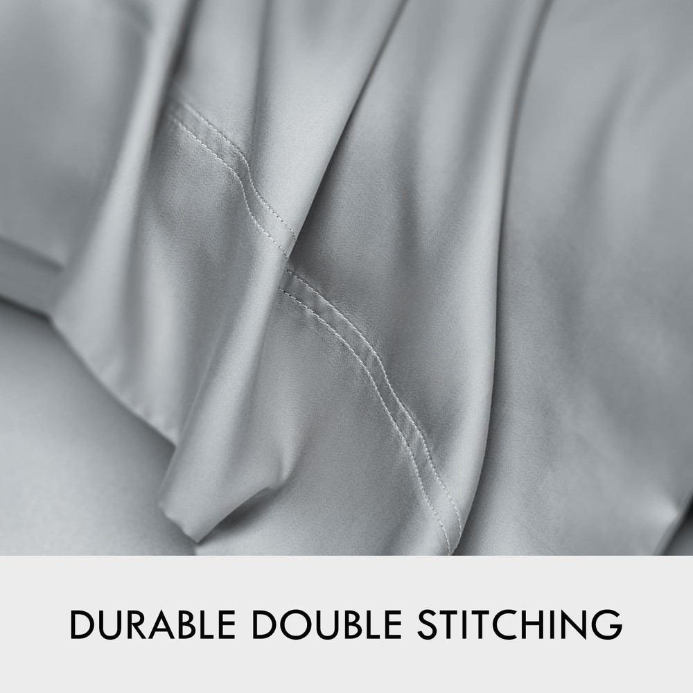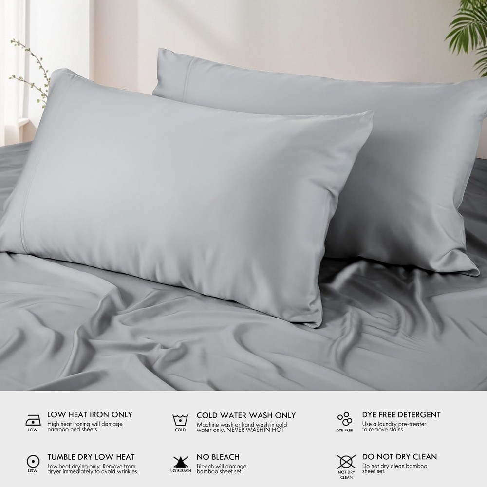 4 PIECE BED SHEET SET: Includes 2 Pillowcases, 1 Flat Sheet, and 1 Fitted Sheet. Flat Sheet (105" x 102"), Fitted Sheet (78" x 80"), Pillowcases (20" x 40"). Deep Pocket Sheet Set: Indulge in luxury with our elasticized deep-pocket sheet, fitting mattresses up to 16 inches thick. Its versatile size suits most beds, even smaller ones. Ultimate Coolness and Softness: Experience cool comfort with our bedding. It naturally regulates temperature, wicks away moisture, and offers ultimate softness. Perfect for hot sleepers and sensitive skin. Super Soft Sheets: Crafted from 300 TC satin fiber fabric, our bedding sheets are incredibly soft, smooth, and silky. 300 thread count is the optimal choice for pilling resistance as higher thread counts mean thinner and weaker fibers. Certified Safety: Our bed sheets are OEKO-TEX Standard 100 certified, ensuring bed sheets do not contain harmful chemicals. Recommended care includes cold washing, gentle cycle, and avoiding bleach or fabric softener. Tumble dry on low heat and remove immediately to avoid wrinkles. Use a warm iron if needed.
