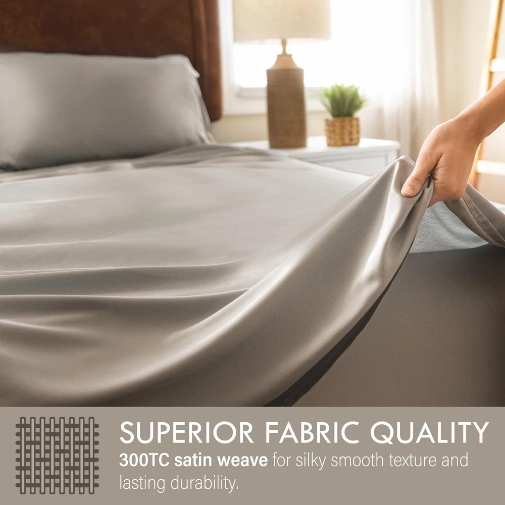 4 PIECE BED SHEET SET: Includes 2 Pillowcases, 1 Flat Sheet, and 1 Fitted Sheet. Flat Sheet (90" x 102"), Fitted Sheet (60" x 80"), Pillowcases (20" x 30"). Deep Pocket Sheet Set: Indulge in luxury with our elasticized deep-pocket sheet, fitting mattresses up to 16 inches thick. Its versatile size suits most beds, even smaller ones. Ultimate Coolness and Softness: Experience cool comfort with our bedding. It naturally regulates temperature, wicks away moisture, and offers ultimate softness. Perfect for hot sleepers and sensitive skin. Super Soft Sheets: Crafted from 300 TC satin fiber fabric, our bedding sheets are incredibly soft, smooth, and silky. 300 thread count is the optimal choice for pilling resistance as higher thread counts mean thinner and weaker fibers. Certified Safety: Our bed sheets are OEKO-TEX Standard 100 certified, ensuring bed sheets do not contain harmful chemicals. Recommended care includes cold washing, gentle cycle, and avoiding bleach or fabric softener. Tumble dry on low heat and remove immediately to avoid wrinkles. Use a warm iron if needed.