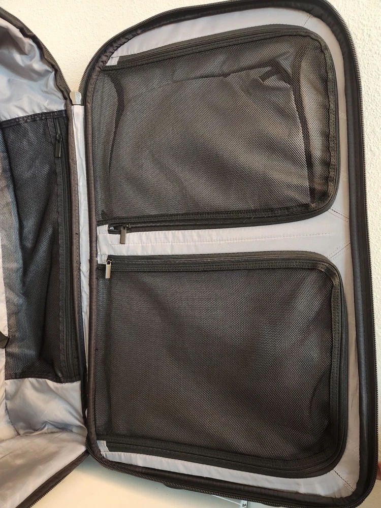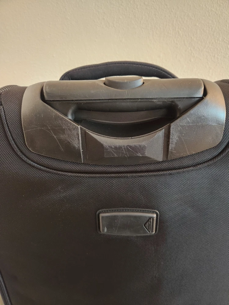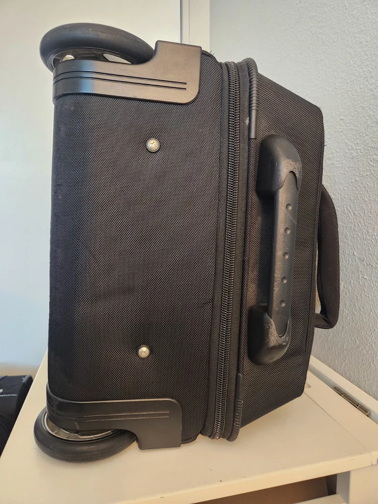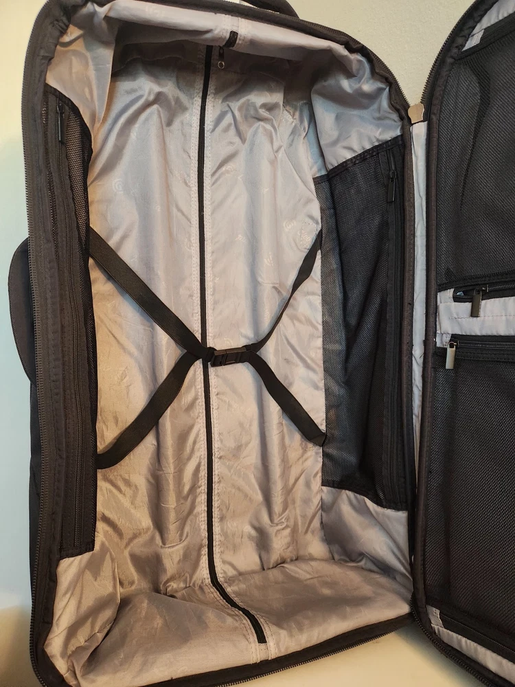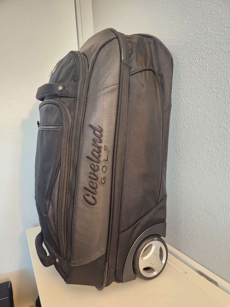 Rare Cleveland Golf Wheeled Suitcase Luggage Bag 29". Ballistic Nylon and leather. New with tags. New with defects. The bag has scratches on the back side from being in storage, see pictures. It was never used. All zippers function properly. No rips or tears. The handle extends and collapses smoothly. Very clean interior. Approximately 29" high 16" wide 12" deep