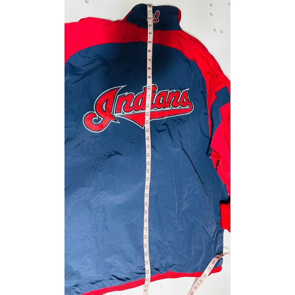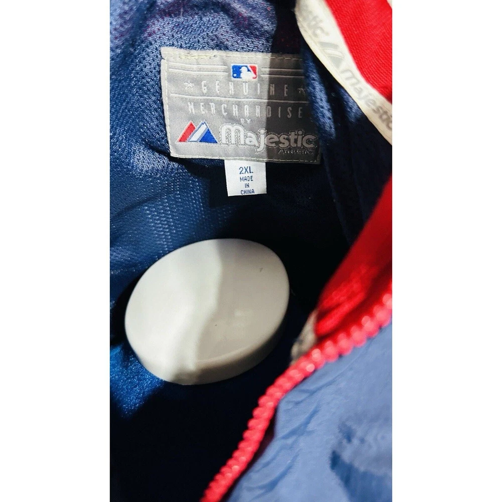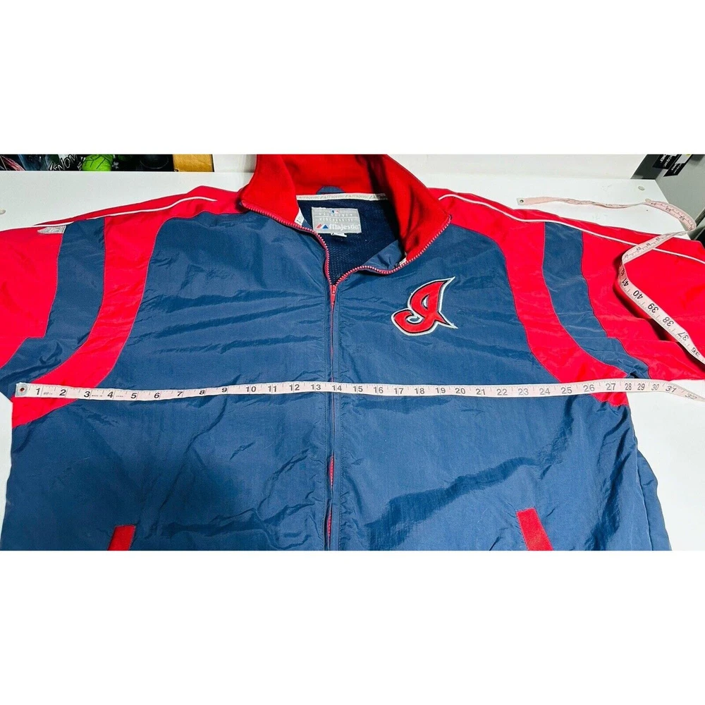 Excellent Condition Show off your support for the Cleveland Indians with this Majestic brand windbreaker jacket featuring the iconic Chief Wahoo logo. The jacket is a size XXL and comes in a striking blue color with accents of red. It is perfect for any fan of the Major League Baseball team and is made in Korea, Republic of. This jacket is a must-have for any Cleveland Indians fan. It is made of high-quality materials and features a full zip design for easy wear. The jacket is designed for men and is perfect for showing off your team spirit. Get yours today and add it to your collection of fan apparel and souvenirs!