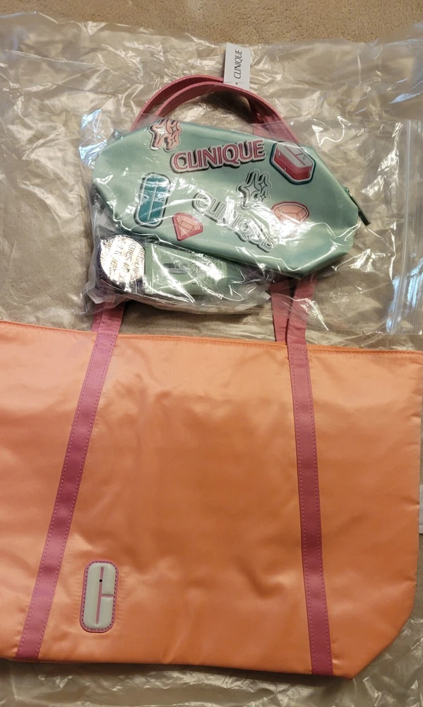 Clinique 8pc Set Travel Sizes Includes - All About Clean liquid Facial Soap in Mild For Normal Skin 1 FL. OZ./30ml Made in U.S.A. 7 day Scrub Cream 1 FL. OZ./50ml Made in U.S.A. Clinique Smart Clinical Repair wrinkle correcting cream 0.5oz./15ml Made in Canada Clinique Smart Clinical Repair wrinkle correcting serum .17 FL. OZ./5 ml Made in U.S.A. High Impact Mascara 01 Black .14oz./3.5 ml Made in Canada Clinique Pop Lip Colour + Primer 02 Bare Pop Made in Canada Clinique Cosmetics Bag in Green & Clinique Tote Bag in Orange NEW IN PACKAGE RETURNS NOT ACCEPTED ON BEAUTY PRODUCTS.