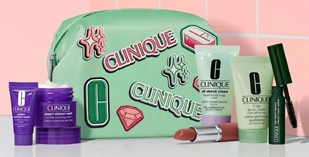 Product Line: Clinique Number of Items in Set: 8 Skin Type: All Size: Travel Set Includes: Lipstick, Mascara, Cosmetic Bag, Wrinkle Serum, Wrinkle Cream, Cleanser, Scrub, Tote Bag Brand: Clinique Makeup Shade: Assorted