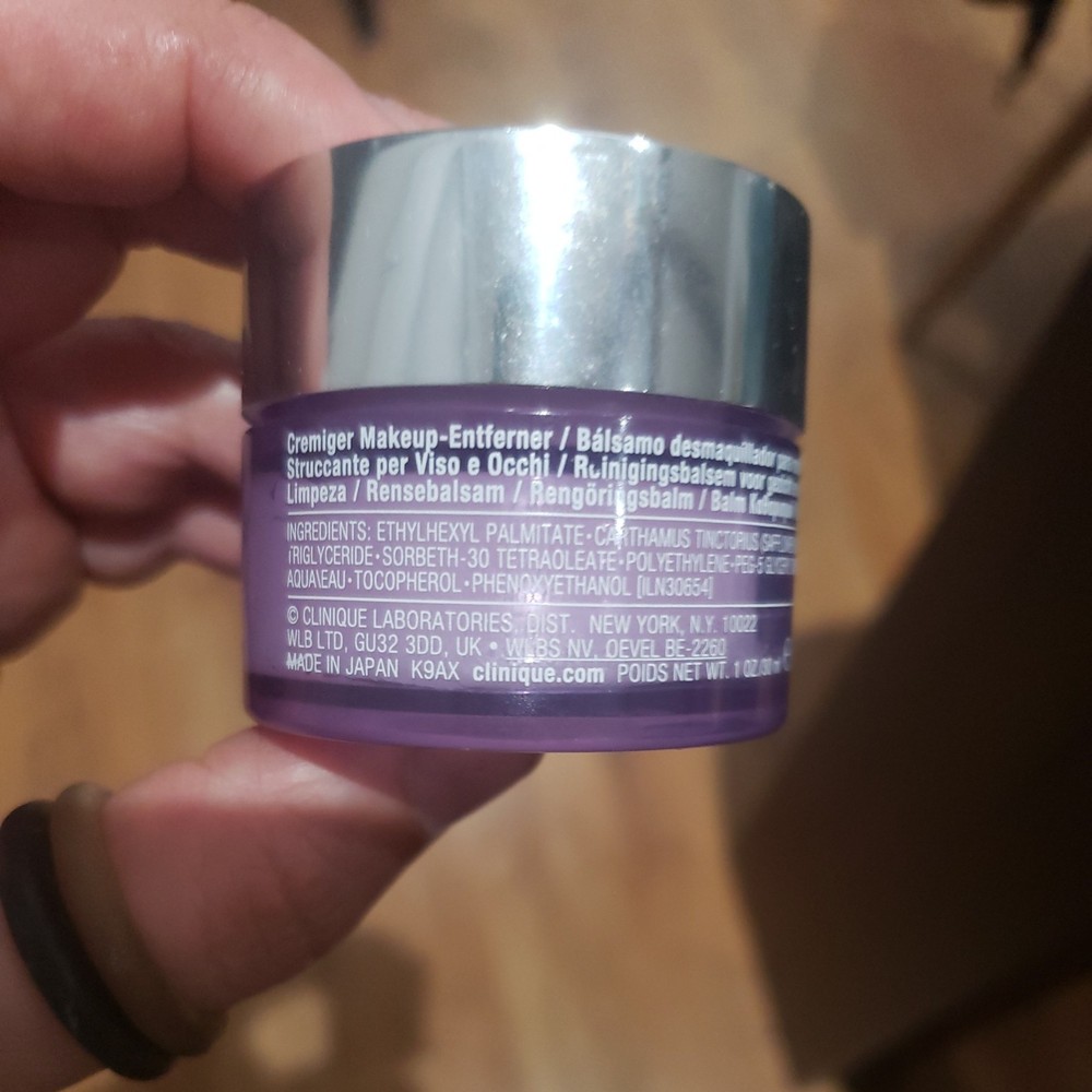 Country of Origin: Japan Features: Hydrating, Phthalate-Free, Paraben-Free, Perfume-Free, Formaldehyde-Free, Vegan, Gluten-Free, Oil-Free, Alcohol-Free, Animal Cruelty-Free, Hypoallergenic, Sulfate-Free, Ammonia-Free, Colorant-Free Product Line: Clinique Take the Day Off Ingredients: Glycerin, Aloe Vera, Argan Oil Brand: Clinique Skin Type: All Skin Types Volume: 3.8 fl oz gtin13: 0020714215552 Formulation: Balm Body Area: Eyes, Lips, Face Period After Opening (PAO): 6M Type: Cleanser Size: Regular UPC: 0020714215552 Active Ingredients: Aloe Vera