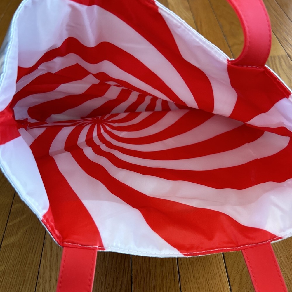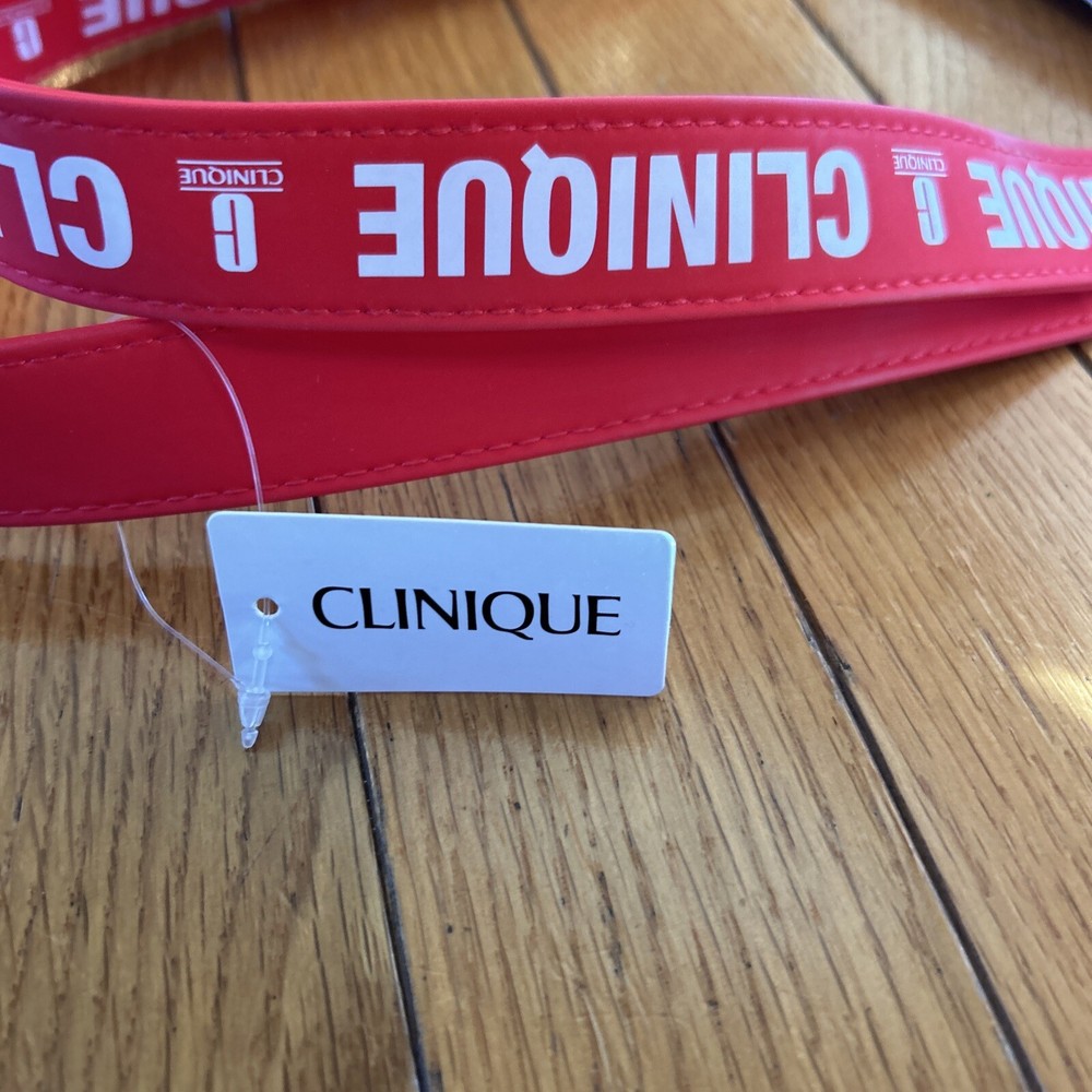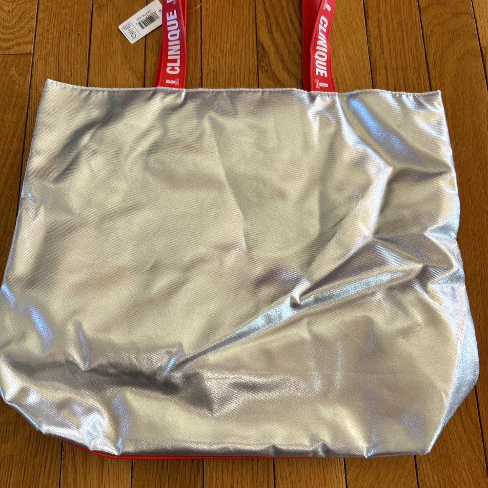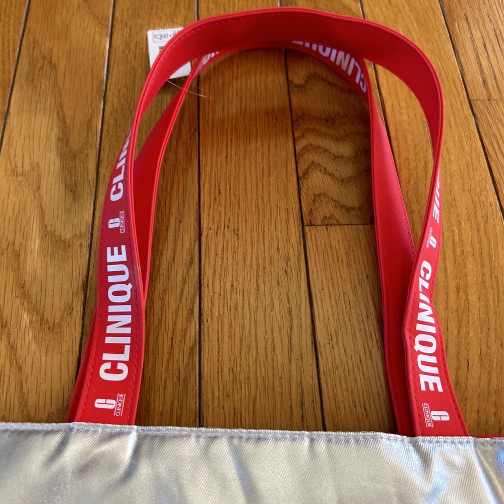 New Clinique Womens Silver Red Reusable Shopping Beach Travel Shoulder Tote Bag Measures 15” x 13” 3.5” Strap drop 9” New with tags from a smoke free home. Inventory rw