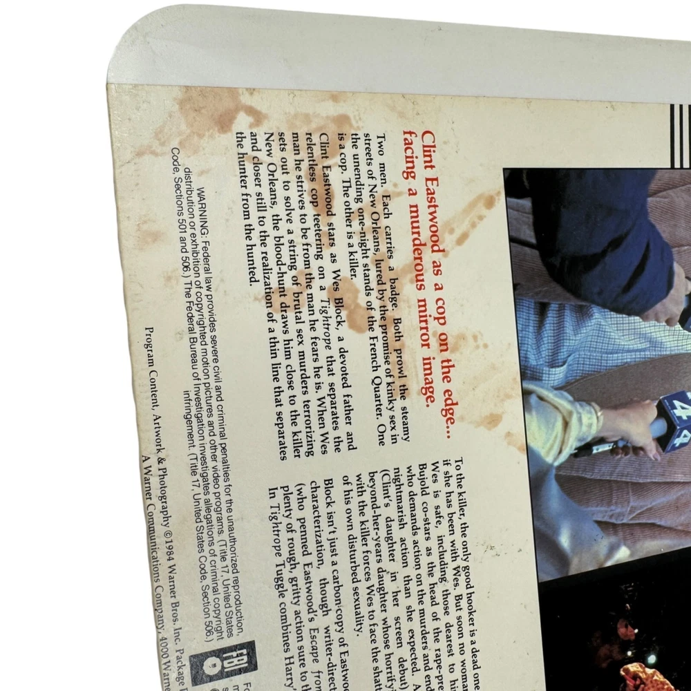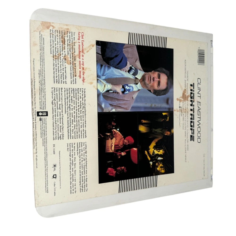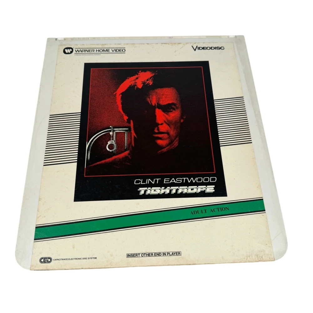 The "Tightrope" videodisc features Clint Eastwood in an intense action movie. This collectible CED format by Warner Home Video offers a vintage cinematic experience for enthusiasts of classic film media. • Warner Home Video release • CED format • Action genre • Clint Eastwood starring • Classic 1980s movie Some discoloration and wear on the cover. Ready for your collection!