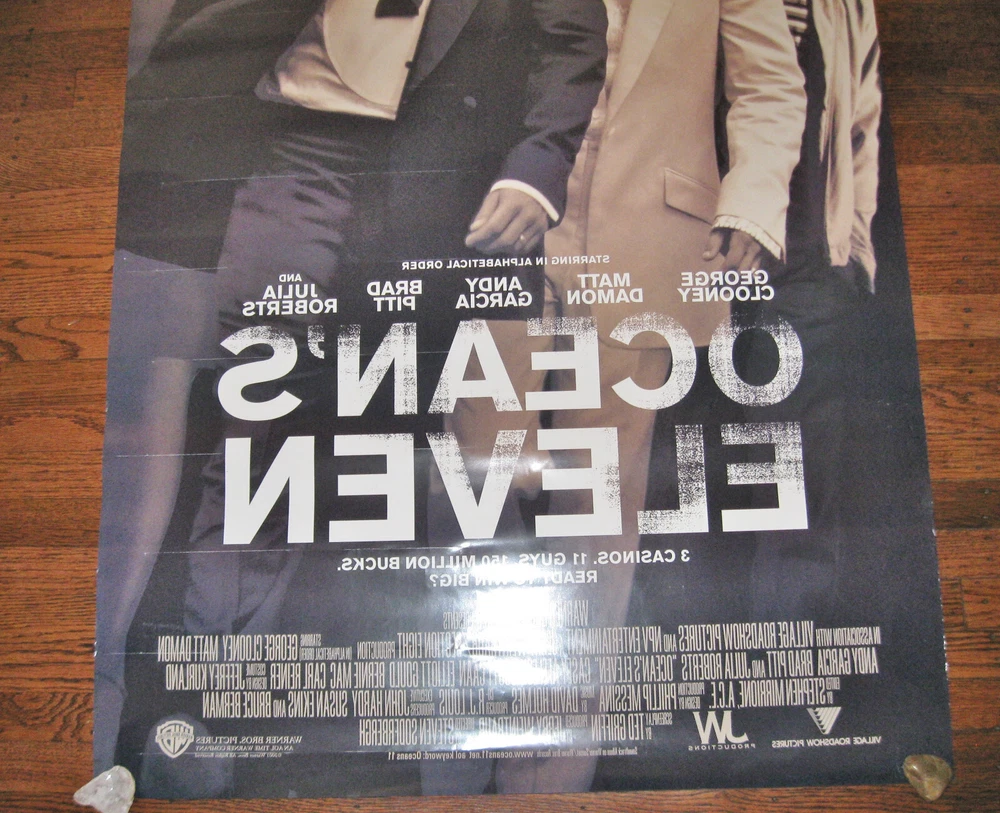 Vintage Reverse Sided Movie Poster Adventure Action 2001 – Ocean’s Eleven -George Clooney Brad Pitt Julia Roberts Matt Damon Andy Garcia “3 Casinos. 11 Guys. 150 Million Bucks. Ready to Win Big?…” · Perfect or your movie room or poster collection, will look in double sided frame. · In good vintage condition, edges show light wear from handling. Measures around 27” wide and 40” tall , will be shipped rolled. CallJannieEbay Helping you find quality modern & vintage fashion, décor, unique gifts & collectibles. Buying pre-owned is environmentally friendly. Discount when your purchase more than one item. You can trust us to provide quality products & service and will highlight noticeable imperfections in the photos. Items come from a pet and smoke free environment. Keep in mind, color may vary slightly depending on viewing device. Items untouched/untested to maintain character and allow your expert hands to clean and restore. Thank you for supporting small businesses and check out others CallJannie treasures for sale.