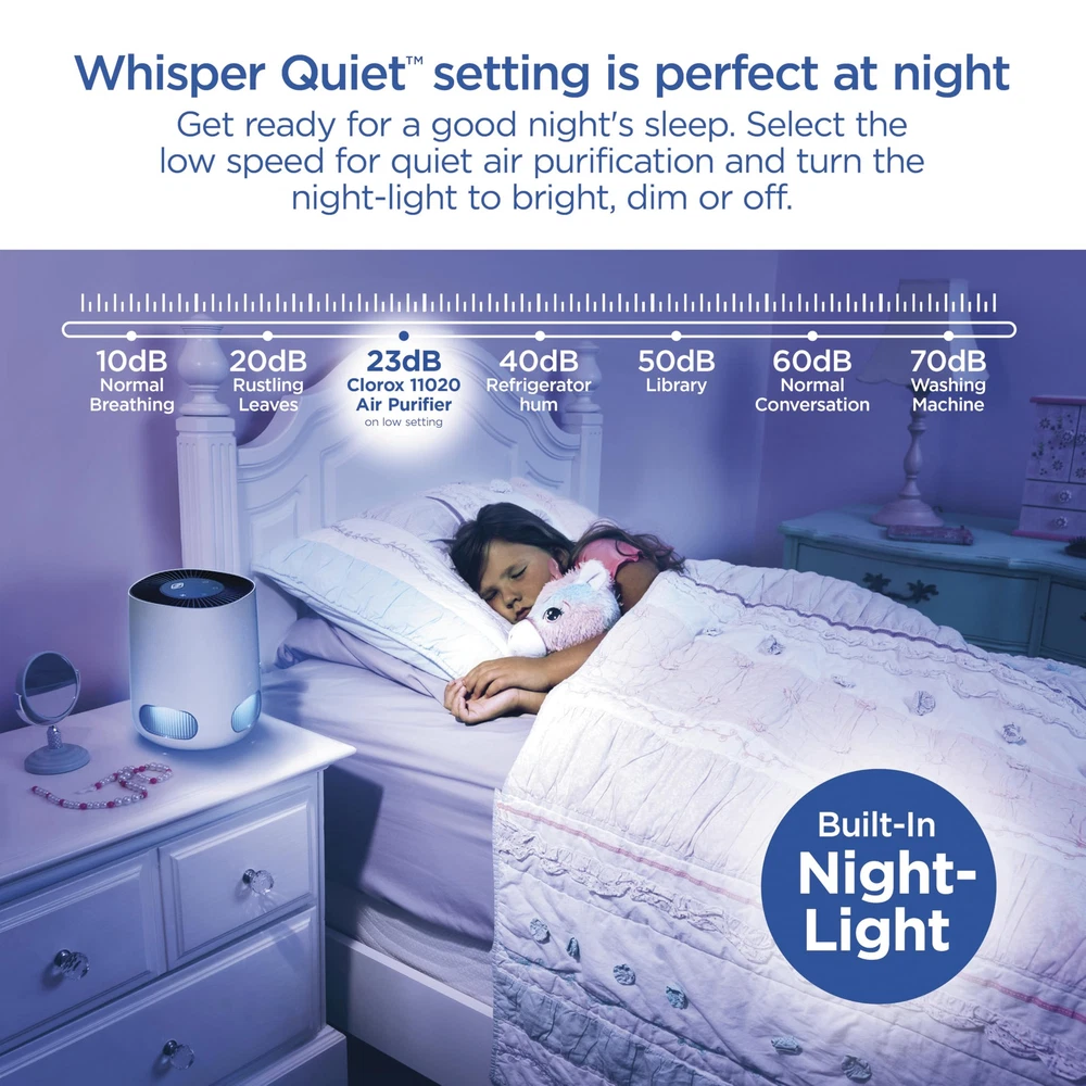The Clorox™ Tabletop Air Purifier captures 99.97%* of particulates as small as 0.1 microns and reduces viruses and bacteria** so you can breathe easier. The 2 stage 360° filter captures particulates in a pre-filter and True HEPA filter. * Before first use remove Power Adapter from inside the filter. See Use and Care guide for more information. CAPTURES 99.97% OF ALLERGENS AND PARTICULATES AND REDUCES VIRUSES AND BACTERIA. The Clorox Tabletop Air Purifier has True HEPA filtration to capture 99.97% of particles as small as 0.1 microns and a pre filter to capture larger particles. 2 STAGE 360° FILTER: Delivers 360° air purification by capturing allergens and particulates in 2 filter layers. The outside pre filter catches large dust particles and pet hair and the True HEPA filter captures 99.97% of allergens and particulates. IDEAL FOR SMALLER ROOMS. This compact air cleaner is perfect for smaller rooms like the office, dorm, bedroom, den or nursery. The 360° filter pulls in air from all directions to clean rooms up to 5 times per hour when used in a room 80 sq. ft. and 2 times an hour when used in a room up to 200 sq. ft. EASILY CUSTOMIZE TO ANY ROOM OR SCHEDULE: This True HEPA air purifier has 3 speeds to let you customize air care to your needs. The optional timer lets you set air cleaning to your schedule simply choose from 8, 4 or 2 hours of operation. WHISPER QUIET SETTING IS PERFECT AT NIGHT. Get ready for a good night's sleep. Select the low speed for quiet air purification and turn the adjustable night light to bright, dim or off. GENUINE CLOROX FILTERS: Replace the filter every 6 12 months by searching for B09N54QY1R or Clorox 12020 Tabletop Replacement Filter. Maintain optimal performance with True HEPA filtration to capture 99.97% of particles as small as 0.1 microns and a pre filter to capture larger particles.at enter the True HEPA filter. 99.97% effective in capturing particles as small as 0.1 microns that enter the true HEPA filter. Reduction of viruses and bacteria as air passes through the true HEPA filter. Actual % of reduction varies. Does not kill viruses or bacteria. Cleaning effectiveness and filter life vary by air quality. Based on independent CADR testing, when operating on highest fan speed. Suggested room sizes assumes closed room with 8 ft. ceiling Estimated costs assumes usage on the highest fan speed, 24 hours a day, 365 days a year. Average utility rate of $0.12 per KWh. For more information about energy consumption, visit energy.gov Before first use remove Power Adapter from inside the filter. See Use and Care guide for more information. Testing performed by independent third party, LMS Technologies, INC, January 1, 2022