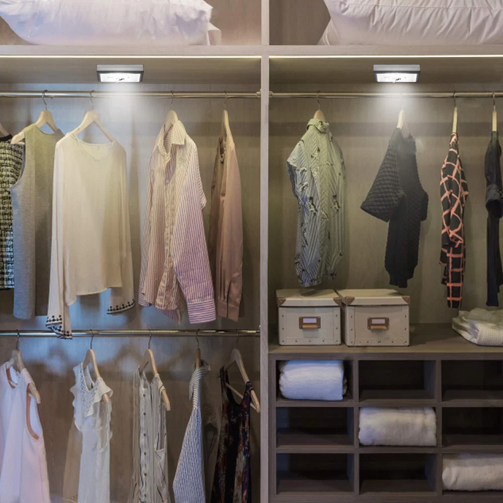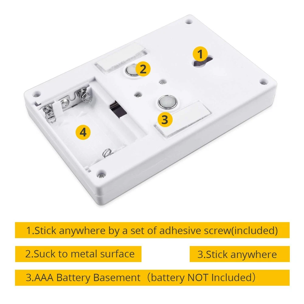 Ideal Bright: Led switch night light with good led strips. perfectly lighting up the dark place, keep our surrounding can see clearly, such as the utility rooms, cabinet/cupboard/closet, outdoor shed, garage, truck Easy to Use: One classic switch controls its power, turn on/off anytime. Great to have one on hand for emergencies, like power outage, fix things outdoors at night Easy Installation: The stick on light can stick anywhere by adhesive set. Also suck to metal items by magnet Battery Operated Night Light: The stick on closet lights is powered by 3*AAA batteries(not included). No electricity problem, safe What You Get: 4 pcs of closet lights battery operated, 1 set of adhesive hook, 1 manual