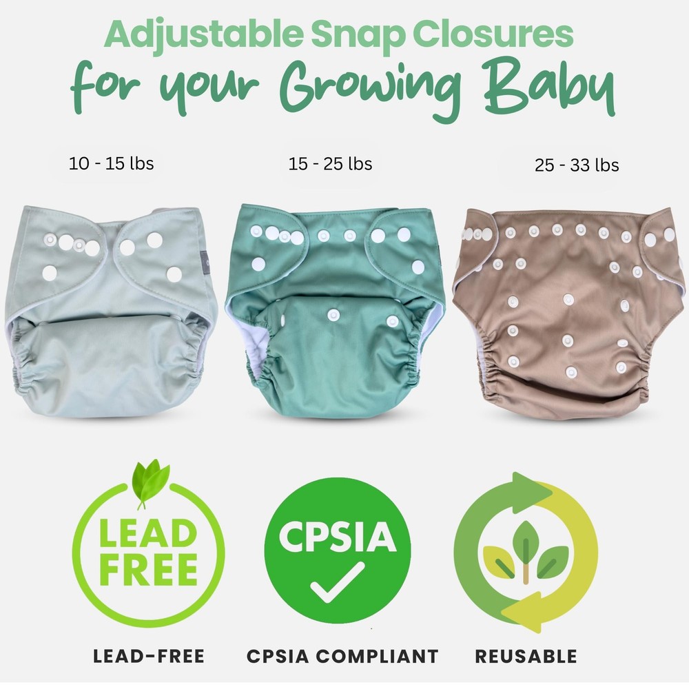 This set of cloth diapers include: 6 pockets cloth diapers, 6 inserts and 1 wet bag. The inner of the cloth diaper is Suede cloth and the out side of the pocket is PUL. The inserts are 55 % polyester, 30 % Baboo fiber and 15% cotton. All-in-One Set – Diapering Made Simple Includes 6 reusable cloth diapers, 6 ultra-absorbent inserts, and a waterproof wet bag. Ideal for everyday use and perfect for families on the go. One Size Fits All – Adjustable From 10–33 lbs Thoughtfully designed with durable snap closures for a secure, comfy fit from baby to toddler. Grow-with-me diapers that adapt to your child’s needs. Day & Night Protection – Gentle and Leakproof Soft inner lining and waterproof outer shell keep your baby dry around the clock. Breathable, rash-friendly design perfect for both daytime play and overnight sleep. Hassle-Free Washing – Machine Washable & Quick to Dry Made for real-life parenting: our diapers go straight into the wash and dry quickly, so you can spend less time on laundry and more time with your little one. Eco-Friendly & Budget-Smart – Save Over $1,000 Switching to cloth diapers helps reduce landfill waste and diapering costs. It's a small choice that makes a big difference—for your baby, your wallet, and the planet.