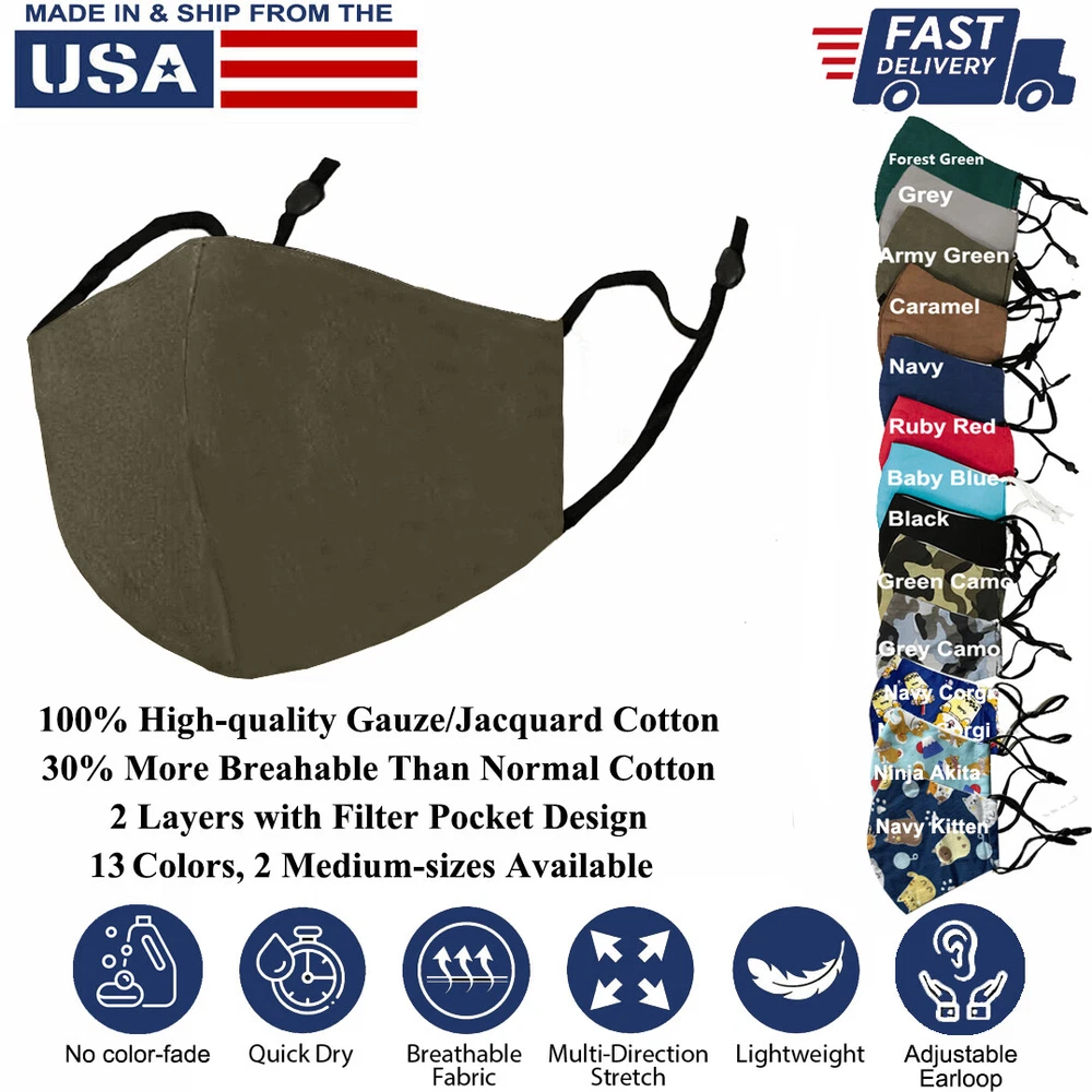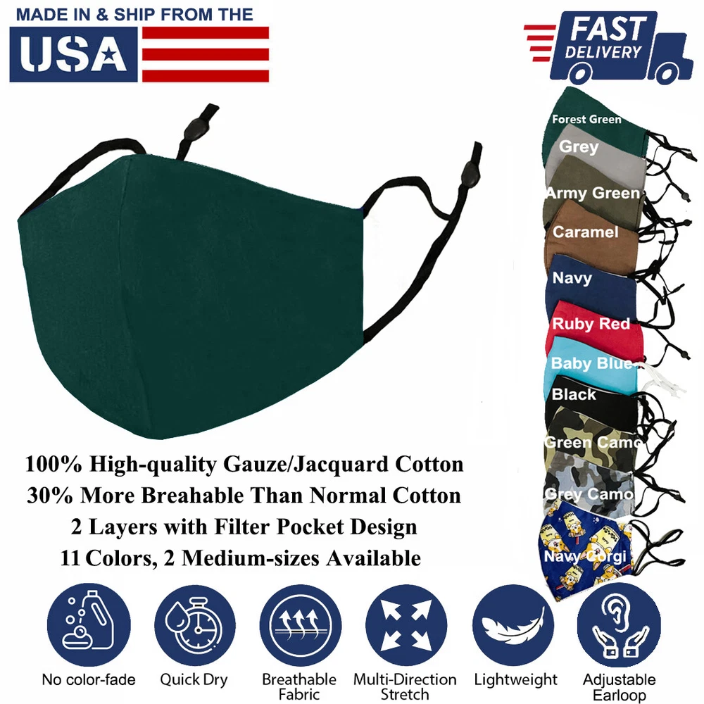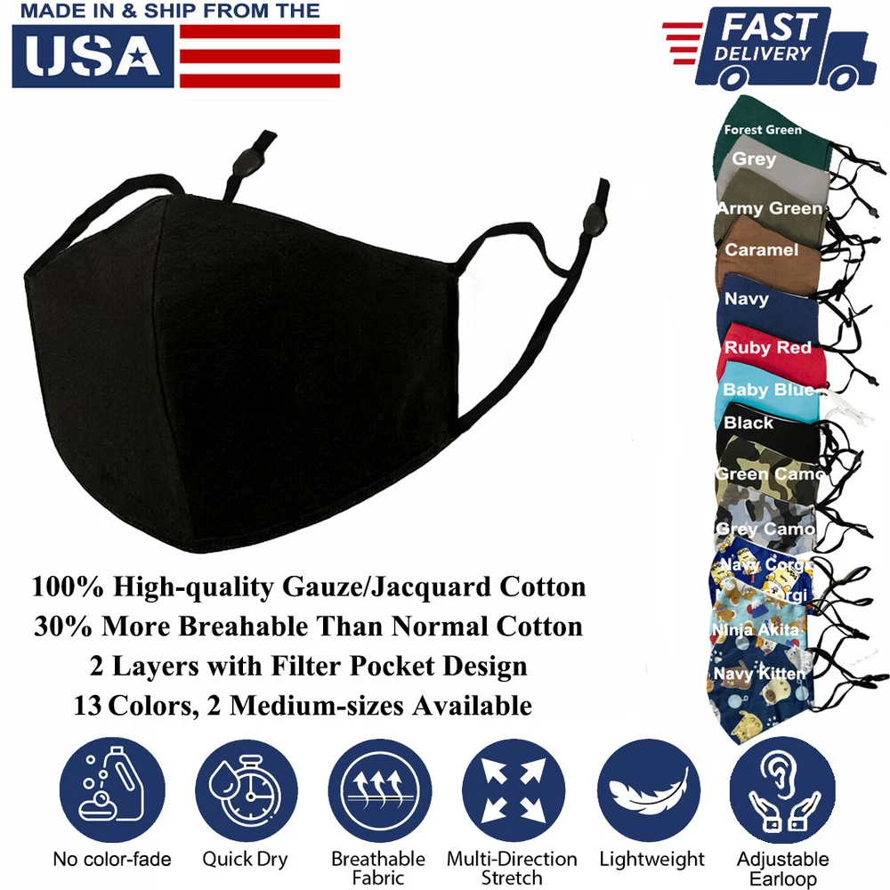 Cloth Face Mask Reusable 3D 100% Cotton Washable Adjustable Unisex Made-in-USA 100% cotton washable cloth 3D double layer face mask made in USA with a filter pocket ; Buy 2 or more will get 1 Free Filter for each mask Super Light, soft, comfortable, and very breathable Best for sports, yoga, outdoor / indoor, office work 8 Color: Black masks, Navy Blue masks, Army Green masks, Caramel / Brown masks, Ruby red marks, Baby Blue masks, Grey Camo uflage, Green Camouflage 2 Sizes: covering teenagers / adults male and female (women and men) , a set for whole family Filter: Choose "Filter" option under "Pattern" to buy more -------------------------------------------------------------------------------------------------------------------------------------------------------- - L–Large, usually for women & men 5.9" x 9.45" (15cm x 24 cm) - M–Medium, usually for teenagers. women & men 5.3"x 9.0" (13cm x 23 cm) ---------------------------------------------------------------------------------------------------------------------------------------------------------- No color-fading after wash. Please steam-iron the masks if wrinkled a little after drying. !!!! GET 15% OFF when buying 4+ masks. This option is applied automatically when you buy 4+ masks. Available for the US only! Our mask is both useful and fashionable . • • • • WHY THIS MASK: • • • • 1. An extra sewing strip over the nose while most other masks don't. Super useful feature when you wear glasses. 2. A filter pocket for you could insert another layer in the mask. 3. 2 layers of 100% high-quality elastic gauze cotton with high filtration efficiency. 4. holds a fast-moving cloud of droplets of liquid that is generated by exhalation, cough or sneeze. 5. Extra layers are no use unless it's filter layers to prevent COVID 6. It looks fashionable and beautiful! -------------------------------------------------------------------------------------------------------------------------------------------------------- • • TYPICAL REVIEWS: • • The most comfortable masks I've purchased. Ordered more. Very comfortable and soft. HATE wearing a mask, but this one makes it a bit easy I love the masks so much! Very soft, comfortable and breathable with all sizes ! Fast shipping!!! Love these masks they are so comfortable and easy to wear . Great masks, light and easy to breathe thru It is a great made mask, fits my kid’s face well, and very breathable! Impressed PERFECT,very breathable,soft,best masks anywhere! 2nd order! Great masks! Excellent quality, comfortable, and fit well. Recommended Supper Fast shipping. Item as descriped and very very breathable & comfortable! Got face masks for my grandson, going bk to school! Great seller! Thanks! Great . A+++++++++++++Thanks! Fits my fat face nicely. Quality item shipped fast. Recommended. Fit my massive head just fine ---------------------- ---------------------- • • HOW TO WEAR: • • - Wear the reusable mask for 12-24 hours then change it to another. And don't forget to change a filter. -------------------------------------------- • • HOW TO CLEAN: • • - You can wash masks in a wash-machine. - Then iron it with steam. Please be careful and don't put the iron onto the elastic rubber! -------------------------------------------- • • HOW TO ORDER: • • 1. Choose your favorite color 2. Choose the size you need 3. Enter the number of items and add them to your cart and place the order. -------------------------------------------- • • SHIPPING: • • We will ship your order within 1 business days, so you would receive your mask as soon as possible! ---------------------- ---------------------- • • TAKE TO NOTICE: • • This face cover only protects you from touching yourself and filters droplets of liquid. Shipping FAST FREE SHIPPING BY USPS FIRST CLASS MAIL. WE SHIP OUT MONDAY-SATURDAY ONLY! ORDERS GO OUT SAME DAY, IF ORDERED BY 12:00 PM MST. WE DO NOT SHIP OUT ON SUNDAYS or DURING HOLIDAYS! Returns Exchanges/Refunds No returns or exchanges, as this is a hygienic item; unless ITEM sent was the incorrect item you ordered or ITEM has a defect. 30 DAY MONEY BACK GUARANTEE, IF NOT COMPLETELY SATISFIED! PLEASE NOTE: CURRENT USPS FIRST CLASS CAN TAKE 24-48 HOURS FOR TRACKING TO START MOVING. DELIVERY CAN VARY WITH CARRIERS DUE TO THE HIGH VOLUME OF PACKAGES THEY ARE CURRENTLY RECEIVING. DELIVERY MAY ARRIVE LATER THEN THE ACTUALLY DELIVERY DATE YOU SEE POSTED ON OUR EBAY AD. UNFORTUNATELY, WE HAVE NO CONTROL OVER THIS DATE or DELIVERY FROM THE CARRIER ONCE IT LEAVES OVER HANDS!