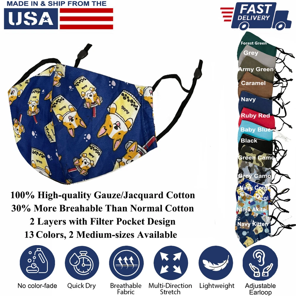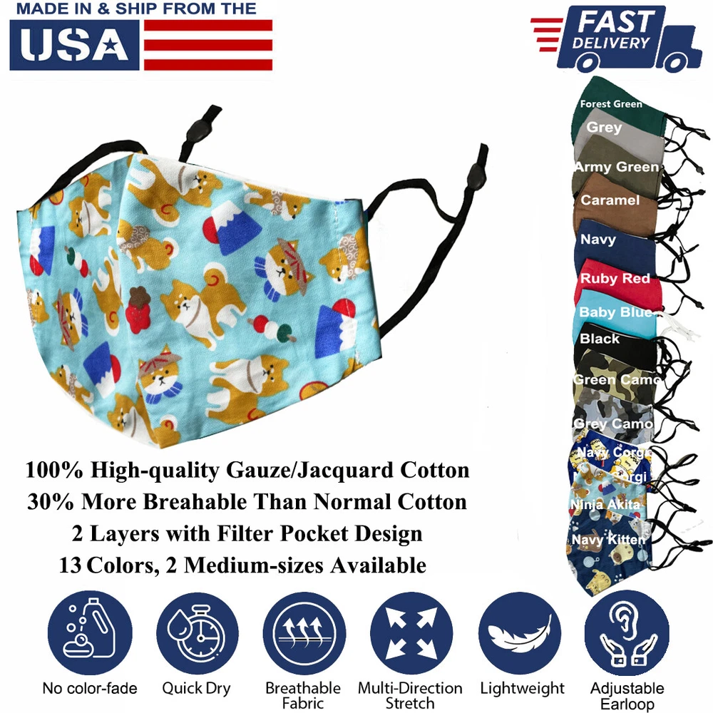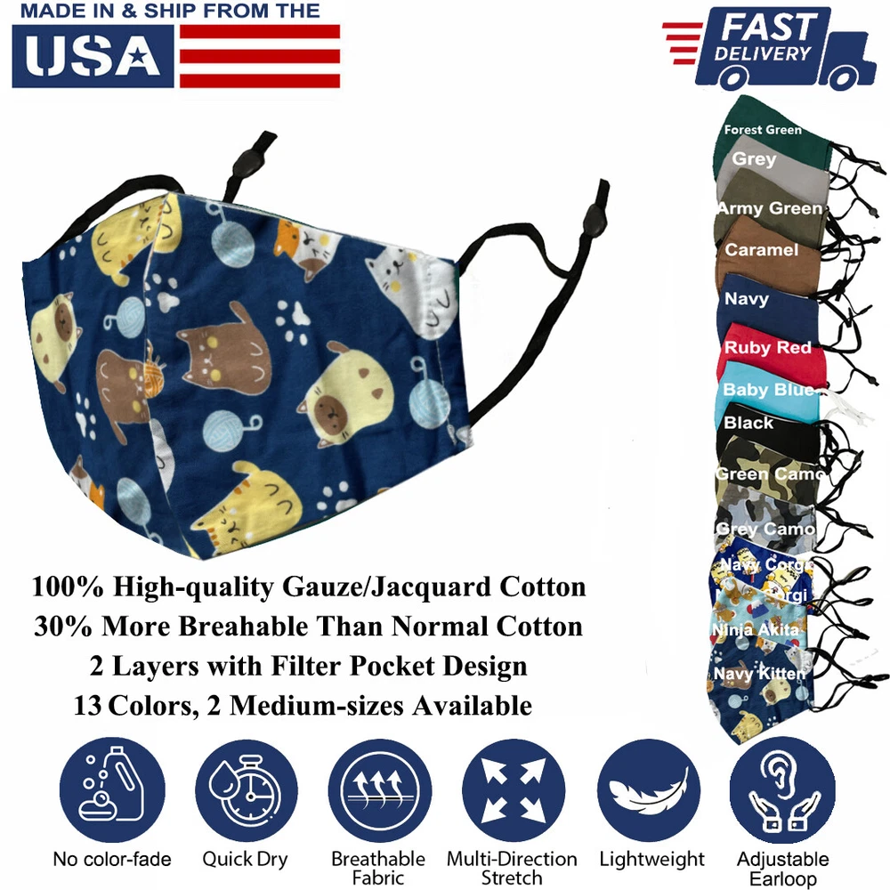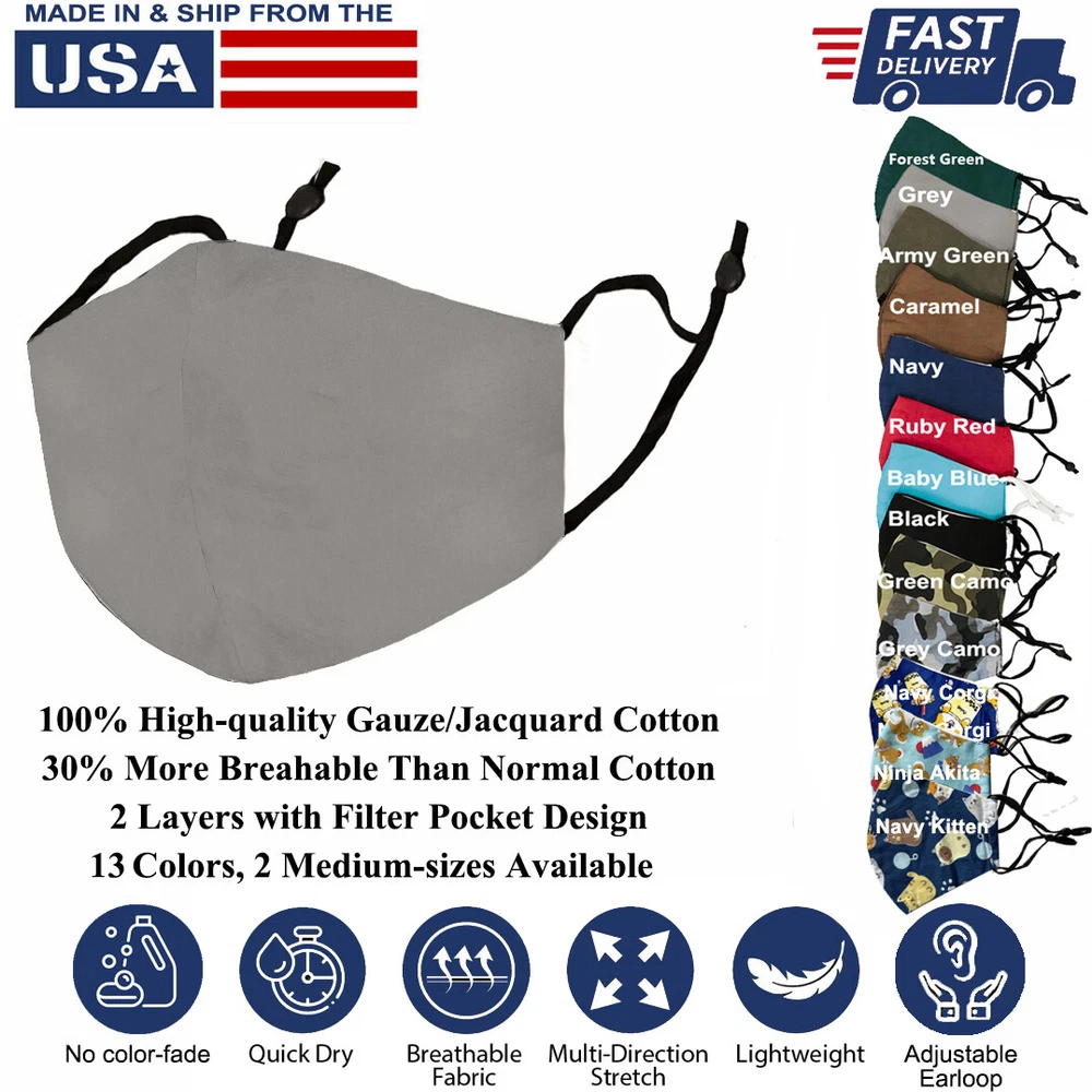 Cloth Face Mask Reusable 3D 100% Cotton Washable Adjustable Unisex Made-in-USA 100% cotton washable cloth 3D double layer face mask made in USA with a filter pocket ; Buy 2 or more will get 1 Free Filter for each mask Super Light, soft, comfortable, and very breathable Best for sports, yoga, outdoor / indoor, office work 8 Color: Black masks, Navy Blue masks, Army Green masks, Caramel / Brown masks, Ruby red marks, Baby Blue masks, Grey Camo uflage, Green Camouflage 2 Sizes: covering teenagers / adults male and female (women and men) , a set for whole family Filter: Choose "Filter" option under "Pattern" to buy more -------------------------------------------------------------------------------------------------------------------------------------------------------- - L–Large, usually for women & men 5.9" x 9.45" (15cm x 24 cm) - M–Medium, usually for teenagers. women & men 5.3"x 9.0" (13cm x 23 cm) ---------------------------------------------------------------------------------------------------------------------------------------------------------- No color-fading after wash. Please steam-iron the masks if wrinkled a little after drying. !!!! GET 15% OFF when buying 4+ masks. This option is applied automatically when you buy 4+ masks. Available for the US only! Our mask is both useful and fashionable . • • • • WHY THIS MASK: • • • • 1. An extra sewing strip over the nose while most other masks don't. Super useful feature when you wear glasses. 2. A filter pocket for you could insert another layer in the mask. 3. 2 layers of 100% high-quality elastic gauze cotton with high filtration efficiency. 4. holds a fast-moving cloud of droplets of liquid that is generated by exhalation, cough or sneeze. 5. Extra layers are no use unless it's filter layers to prevent COVID 6. It looks fashionable and beautiful! -------------------------------------------------------------------------------------------------------------------------------------------------------- • • TYPICAL REVIEWS: • • The most comfortable masks I've purchased. Ordered more. Very comfortable and soft. HATE wearing a mask, but this one makes it a bit easy I love the masks so much! Very soft, comfortable and breathable with all sizes ! Fast shipping!!! Love these masks they are so comfortable and easy to wear . Great masks, light and easy to breathe thru It is a great made mask, fits my kid’s face well, and very breathable! Impressed PERFECT,very breathable,soft,best masks anywhere! 2nd order! Great masks! Excellent quality, comfortable, and fit well. Recommended Supper Fast shipping. Item as descriped and very very breathable & comfortable! Got face masks for my grandson, going bk to school! Great seller! Thanks! Great . A+++++++++++++Thanks! Fits my fat face nicely. Quality item shipped fast. Recommended. Fit my massive head just fine ---------------------- ---------------------- • • HOW TO WEAR: • • - Wear the reusable mask for 12-24 hours then change it to another. And don't forget to change a filter. -------------------------------------------- • • HOW TO CLEAN: • • - You can wash masks in a wash-machine. - Then iron it with steam. Please be careful and don't put the iron onto the elastic rubber! -------------------------------------------- • • HOW TO ORDER: • • 1. Choose your favorite color 2. Choose the size you need 3. Enter the number of items and add them to your cart and place the order. -------------------------------------------- • • SHIPPING: • • We will ship your order within 1 business days, so you would receive your mask as soon as possible! ---------------------- ---------------------- • • TAKE TO NOTICE: • • This face cover only protects you from touching yourself and filters droplets of liquid. Shipping FAST FREE SHIPPING BY USPS FIRST CLASS MAIL. WE SHIP OUT MONDAY-SATURDAY ONLY! ORDERS GO OUT SAME DAY, IF ORDERED BY 12:00 PM MST. WE DO NOT SHIP OUT ON SUNDAYS or DURING HOLIDAYS! Returns Exchanges/Refunds No returns or exchanges, as this is a hygienic item; unless ITEM sent was the incorrect item you ordered or ITEM has a defect. 30 DAY MONEY BACK GUARANTEE, IF NOT COMPLETELY SATISFIED! PLEASE NOTE: CURRENT USPS FIRST CLASS CAN TAKE 24-48 HOURS FOR TRACKING TO START MOVING. DELIVERY CAN VARY WITH CARRIERS DUE TO THE HIGH VOLUME OF PACKAGES THEY ARE CURRENTLY RECEIVING. DELIVERY MAY ARRIVE LATER THEN THE ACTUALLY DELIVERY DATE YOU SEE POSTED ON OUR EBAY AD. UNFORTUNATELY, WE HAVE NO CONTROL OVER THIS DATE or DELIVERY FROM THE CARRIER ONCE IT LEAVES OVER HANDS!