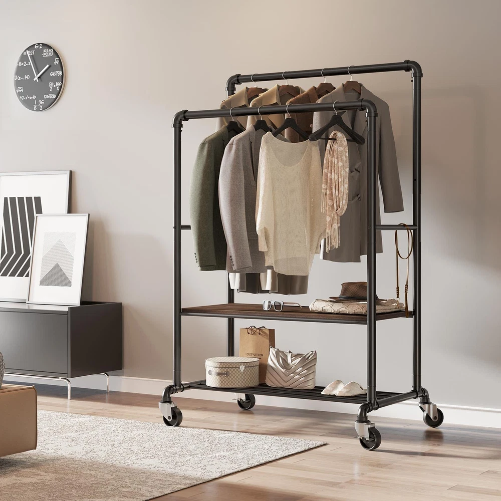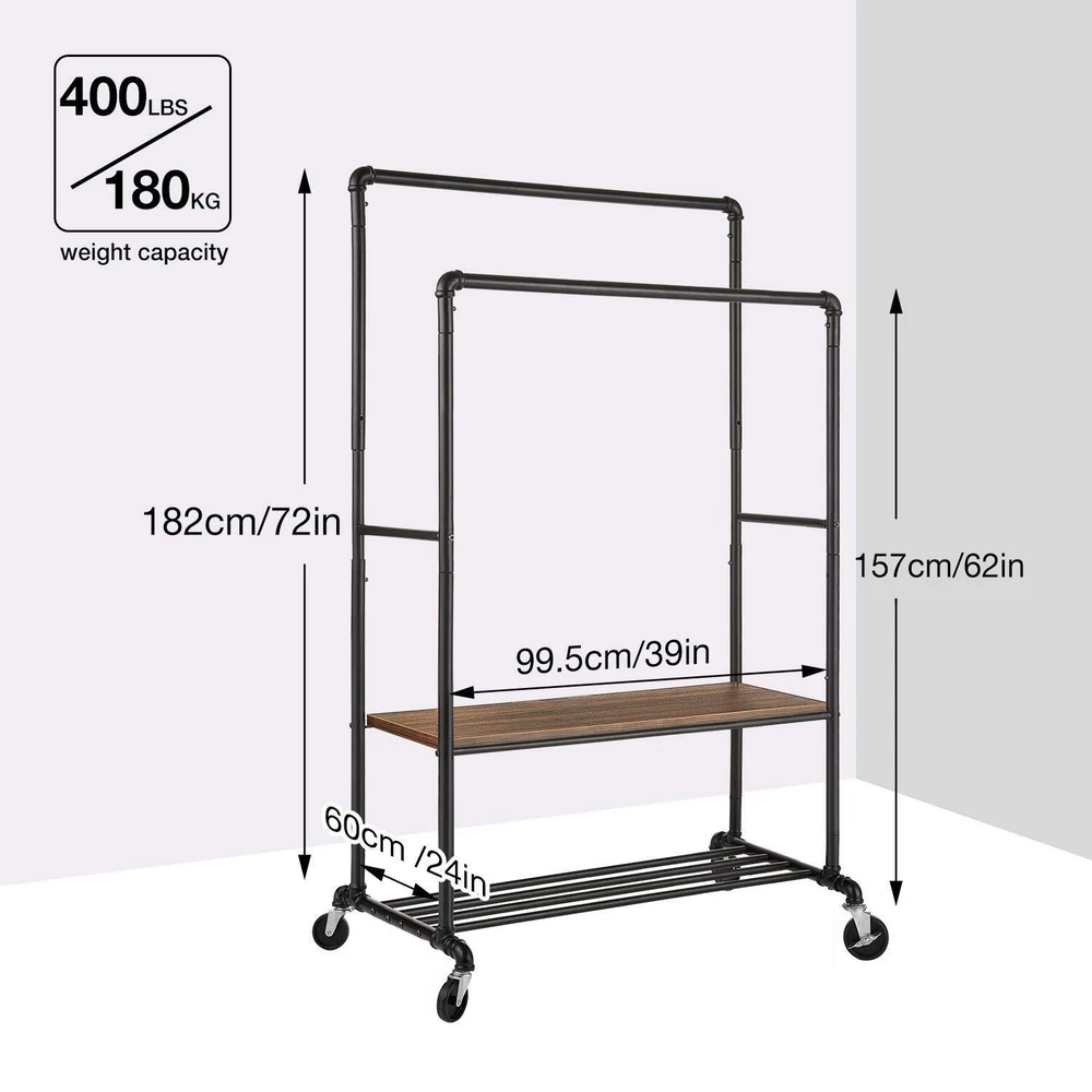 Sturdy and Heavy Duty Garment Rack: Made of premium iron tubes with 1.55mm thickness, ensure superior strength and stability. Made of 1.5 cm thickness composite wood. Waterproof and wear-resistant. It is definitely strong and stable for long years to use. Chic Industrial Style: The perfect combination of industrial style and country style adds a low-key yet luxurious atmosphere to your home decoration. You can put it in your bedroom, living room, laundry room and boutique.It perfectly matches your home decoration. It attracts your attention to find your clothes and make your life more convenient. Easy to Install: 4 omnidirectional wheels (2 with locking brake) can be rotated 360 degrees, with integrated design, reducing the cumbersome steps of installation, can be assembled without any tools, we have provided detailed instructions for easy installation. Adjustable Height: The double pole drying rack can be adjusted by turning the screws to achieve the three states of the shelf. The four metal tubes side by side can store shoes or storage boxes, and the two lateral bars on the side can be used to hang clothes, which can meet any need of hanging clothes. Large storage capacity & Multi-functional Storage: Maximum weight capacity is 400 lbs. Two steel pipes can store a lot of winter clothes. There is also a middle panel and a steel pipe layer on the ground, which can store other accessories for daily wear, bags, scarves, shoes, etc. All items used for daily wear can be easily and neatly stored through this multi-functional clothes rack.