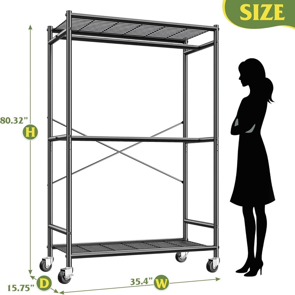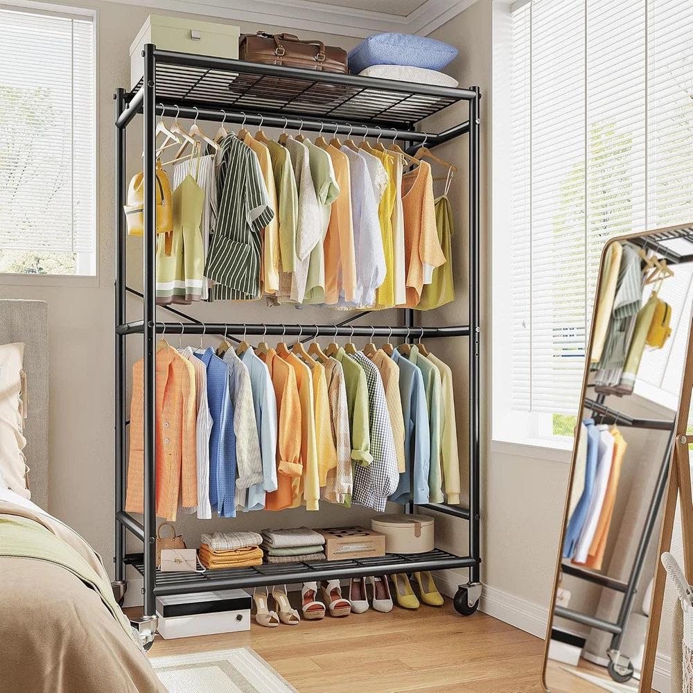 Product Description Heavy Duty Clothes Rack with Wheels Stylish Clothing Rack for Hanging Clothes with Multiple Functions Sturdy and Durable Garment Rack Additional storage space Precise Pre-punching X-Brace More Stable Heavy-duty poles Clothes Racks for Every Occasion On Aug 6, 2025 at 20:32:17 PDT, seller added the following information: