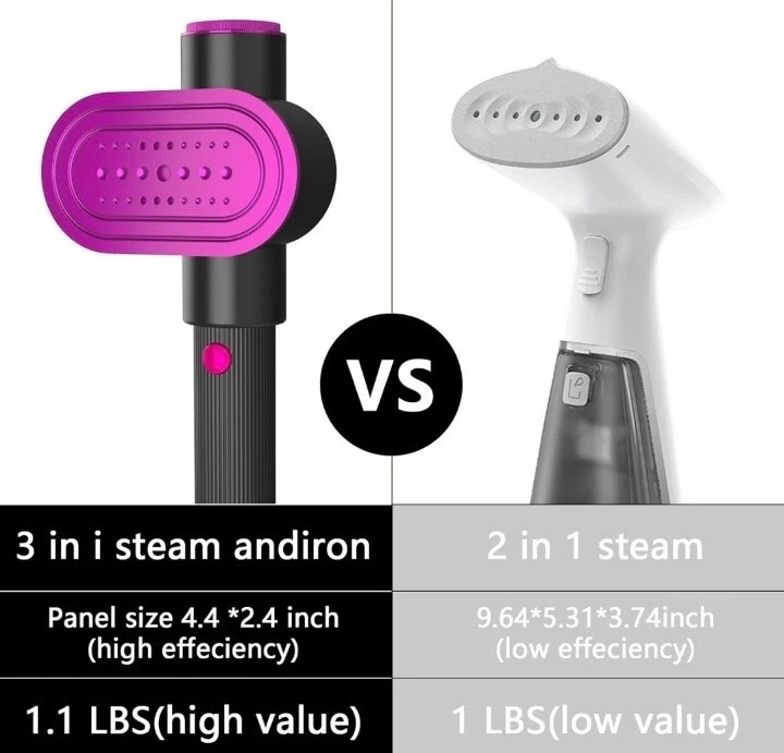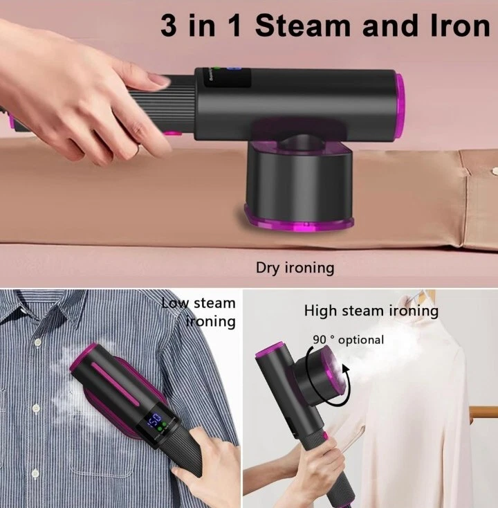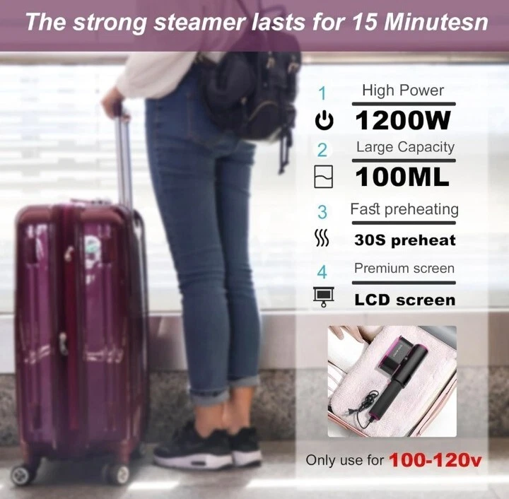 Whats Included: Contains a hand-held garment steamer suitable for 100-120V voltage, a silicone hot pad, a storage bag and a measuring cup, and also a lint roller with three replacement rollers 3-In-1 Ironing Modes: With three ironing modes, the garment steamer combines traditional ironing with steaming. Use low steam for small creases, high steam for large creases, or dry ironing for stubborn wrinkles. The switch with indicator light allows for easy adjustments Effortless Wrinkle Removal: Our powerful hand-held steamer heats up in just 30 seconds to 302°F with 1200W power and 15g/min steam volume. The upgraded metal panel ensures stable and powerful steam output, making it easy to remove wrinkles from clothes Leak-Proof and Spill-Proof: With our latest leak-proof technology, you can use steam easily at any angle without worrying about water spilling and damaging your clothes. The LCD screen monitors temperature changes in real-time Portable and Versatile: Our 90° rotatable head and steam output that glides evenly on delicate fabrics make it simple to achieve wrinkle-free clothes. Its lightweight and compact design make it easy to store and carry, perfect for home use and travel