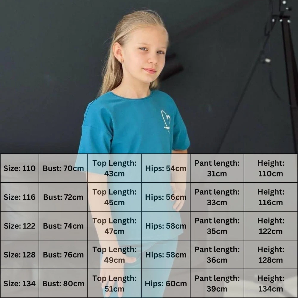 Material: Jersey General size: 110-134 Seazon:Summer Pattern:Graphic Print Clothing decoration:no decoration Size: 110, Bust: 70cm, Top Length: 43cm, Hips: 54cm, Pant length: 31cm, Height: 110cm Size: 116, Bust: 72cm, Top Length: 45cm, Hips: 56cm, Pant length: 33cm, Height: 116cm Size: 122, Bust: 74cm, Top Length: 47cm, Hips: 58cm, Pant length: 35cm, Height: 122cm Size: 128, Bust: 76cm, Top Length: 49cm, Hips: 58cm, Pant length: 36cm, Height: 128cm Size: 134, Bust: 80cm, Top Length: 51cm, Hips: 60cm, Pant length: 39cm, Height: 134cm Introducing our charming girl's set featuring a trendy t-shirt and shorts combo! Perfect for your little fashionista, this set is crafted from high-quality materials for durability and comfort. Whether she's playing outdoors or attending a casual gathering, this set offers both style and practicality. With a variety of sizes and colors available, finding the perfect fit for your girl is easy. Elevate her wardrobe with our girl's set today!