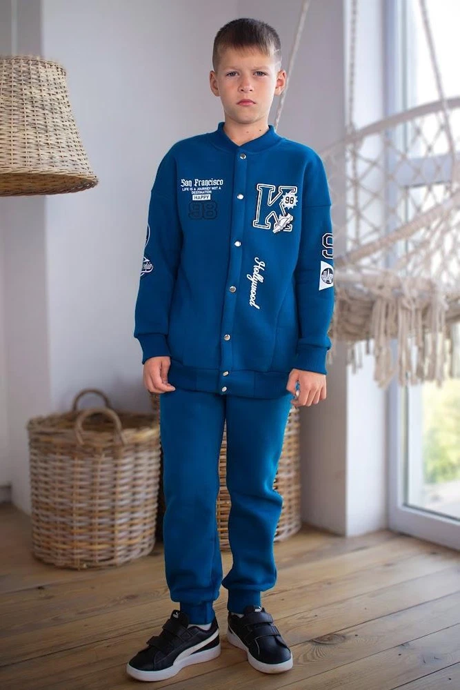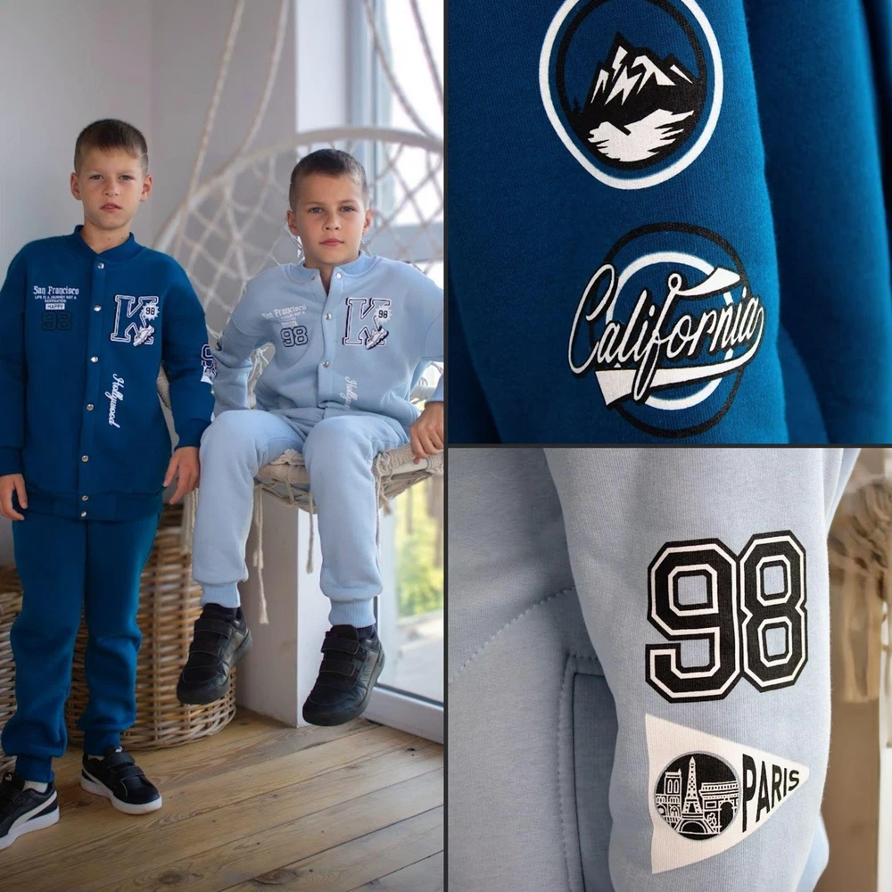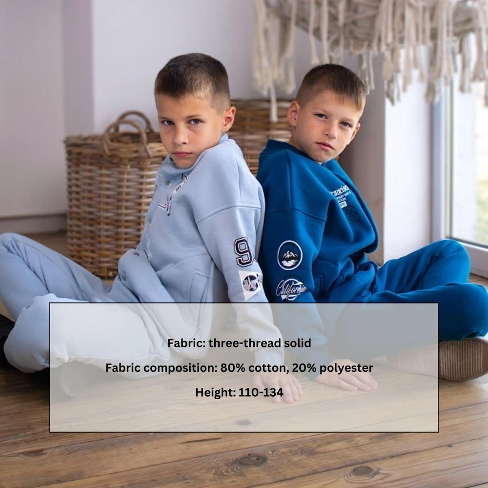 Material: Jersey General size: 110-134 Seazon:Winter Pattern:Graphic Print Clothing decoration:no decoration Size: 110, Bust: 76cm, Top Length: 47cm, Sleeve Length: 45cm, Hips: 62cm, Pant length: 61cm, Waist: 48cm, Height: 110cm, Shoulder: 38cm Size: 116, Bust: 78cm, Top Length: 49cm, Sleeve Length: 47cm, Hips: 66cm, Pant length: 65cm, Waist: 50cm, Height: 116cm, Shoulder: 39cm Size: 122, Bust: 80cm, Top Length: 51cm, Sleeve Length: 51cm, Hips: 70cm, Pant length: 69cm, Waist: 50cm, Height: 122cm, Shoulder: 40cm Size: 128, Bust: 82cm, Top Length: 53cm, Sleeve Length: 54cm, Hips: 74cm, Pant length: 73cm, Waist: 52cm, Height: 128cm, Shoulder: 41cm Size: 134, Bust: 84cm, Top Length: 55cm, Sleeve Length: 46cm, Hips: 78cm, Pant length: 76cm, Waist: 52cm, Height: 134cm, Shoulder: 42cm Define your boy's style with our exclusive suit! It is not just clothes, it is the embodiment of individuality and sophistication. Designed for those who value comfort and quality. Thanks to its unsurpassed design and excellent material quality, this suit will become an irreplaceable element of your little one's wardrobe. Order now and make his day special!