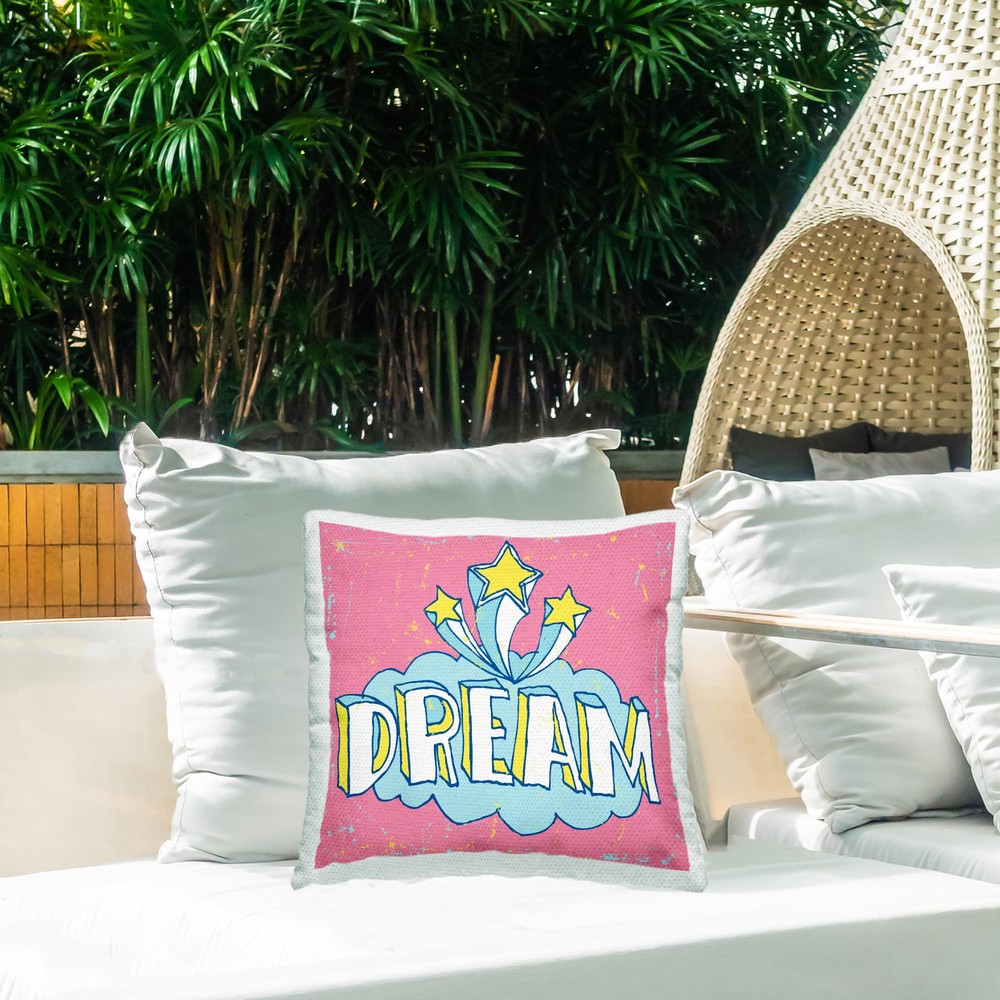 Dimensions: 18 x 18 Inches, Including Filling Insert Decorative outdoor pillows are a great and easy way to decorate your outdoor living space, adding both a decorative accent and comfort. Pillows arrive with insert already zipped inside and ready to fluff. Casing and filling insert are both made of quick-dry soft polyester material. The printing process makes the ink part of the fabric for greater outdoor durability. To wash remove filling insert from casing using invisible zipper. Clean pillow case separately, machine wash on delicate with cold water and mild detergent. For best quality hang dry. Pillow insert is spot clean only. Artwork Relates To: Cloud, Star, Nature, Pink, Dream Design by Peter Horjus