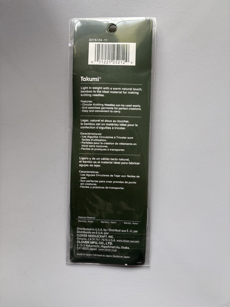 The product is a set of Clover Takumi Bamboo Circular Knitting Needles with a brand name of Clover and a type of circular needles. The material used for the needles is bamboo. The product is listed under the categories of Crafts, Needlecrafts & Yarn, Crocheting & Knitting, and Knitting Needles. New
