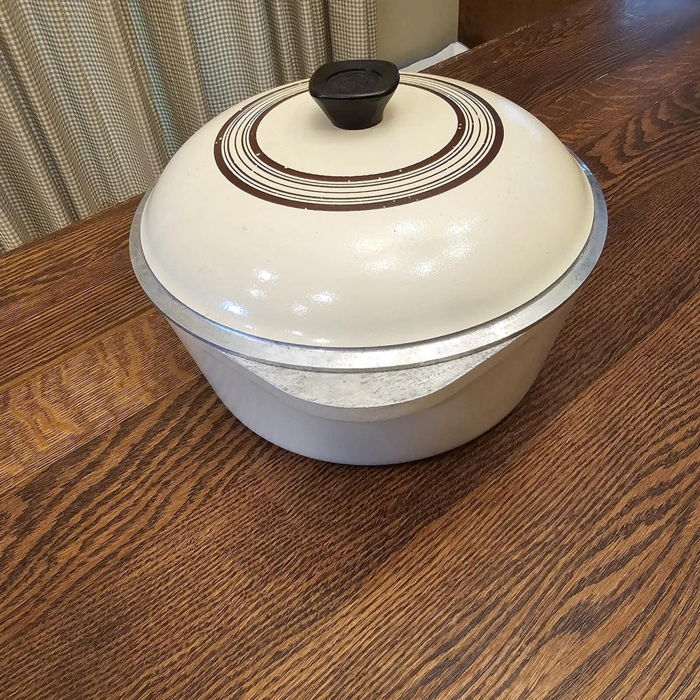 This CLUB Nonstick pot is in good used condition. A few scratches on the inside. Some wear on the lid paint. Outside bottom stained from use. 10" diameter. The pot stand 4 1/8" tall. To the top of the lid handle it measures ~7" tall. Overall in nice used condition. 4 quart.