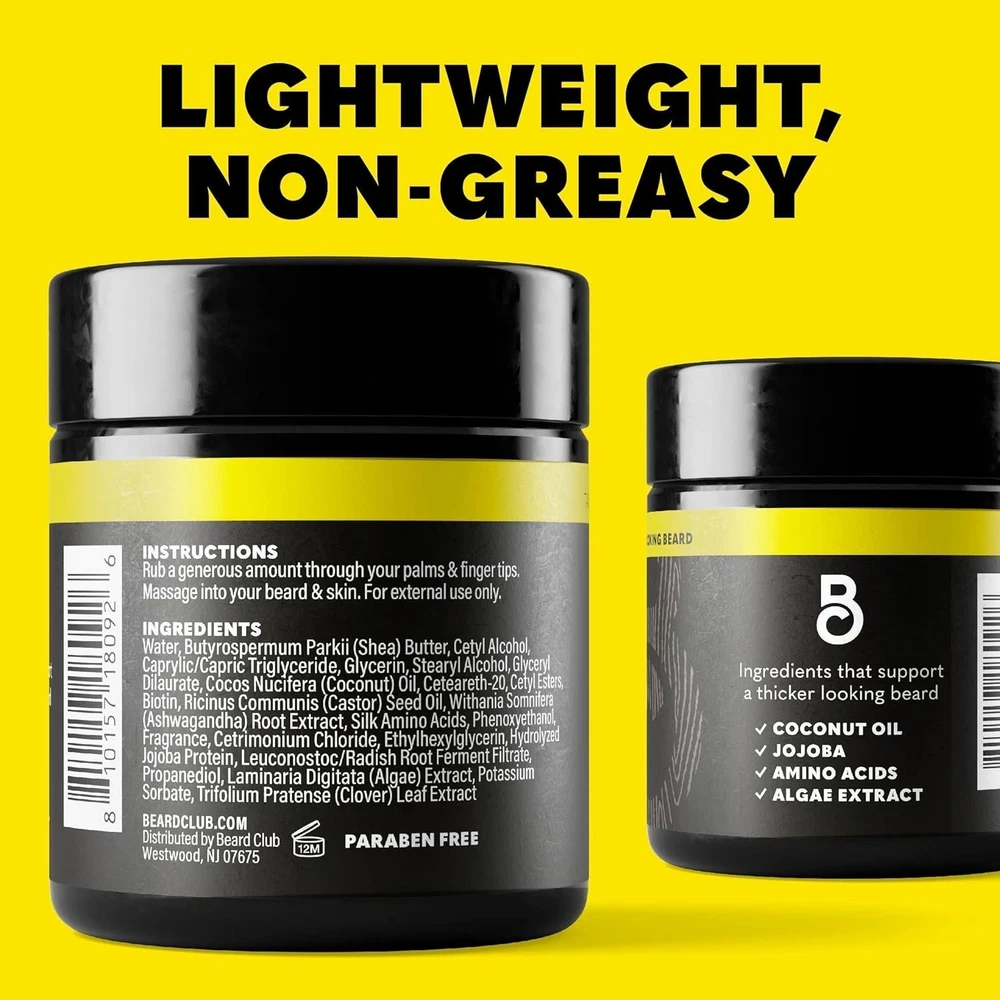 Period After Opening (PAO):12MVolume:1 fluid ouncesCountry/Region of Manufacture:United StatesModel:N/AMPN:Does not applyUPC:810157180926Formulation:BalmBrand:The Beard ClubType:Beard BalmFeatures:Vegan, All Natural IngredientsDepartment:MenStyling Effect:Does not applyProduct Line:Biotin Beard Balm for MenCalifornia Prop 65 Warning:Does not applyIngredients:Castor Oil, Shea Butter, BiotinExpiration Date:Granted FreshSize:4 Ounce (Pack Of 1)Active Ingredients:Biotin, Shea ButterHair Type:All, Beardgtin13:810157180926Scent:Amber Cedar