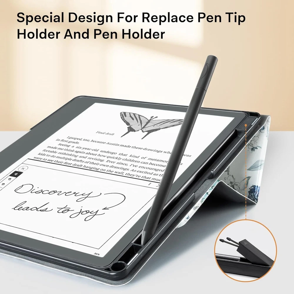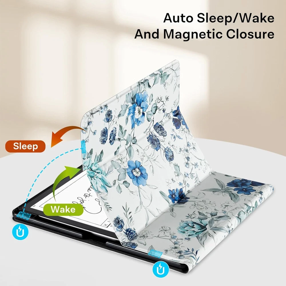 CoBak Stand Case for Kindle Scribe - Premium Folio Leather Cover Blue Blossom Product Details Brand: CoBak Color: Blue Blossom Compatible Devices: Kindle Scribe Form Factor: Case Shell Type: Soft 【Compatibility】: This specially designed cover features a perfect cutout and shape, exclusively tailored for the all-new Kindle Scribe 10.2" 2022/2024 Release, ensuring a precise fit and compatibility with this device only 【Heavy Duty】: Durable hard PC shell and high-quality PU leather protect devices from drops, bumps, and scratches. Withstand hard work and extreme conditions. It is highly durable and resistant to damage. Let you Experience unparalleled strength and durability 【Auto Wake/Sleep】:Enjoy hassle-free reading with the smart case that effortlessly wakes up or puts your Kindle e-reader to sleep. Plus, the magnetic closure ensures 360-degree protection for your device, making it safe at all times 【Two Viewing Angles】:Transform your tablet into a comfortable reading and writing angle with our unique tri-fold front cover design. With this feature, you can free your hands and have extra time to focus on other tasks 【Pen Holder Design】:Special design with a Replace Pen Tip Holder and Pen Holder, this product offers enhanced convenience. Its slim and lightweight design ensures that it won't add any extra bulk to your device, making it easy to carry and use on the go