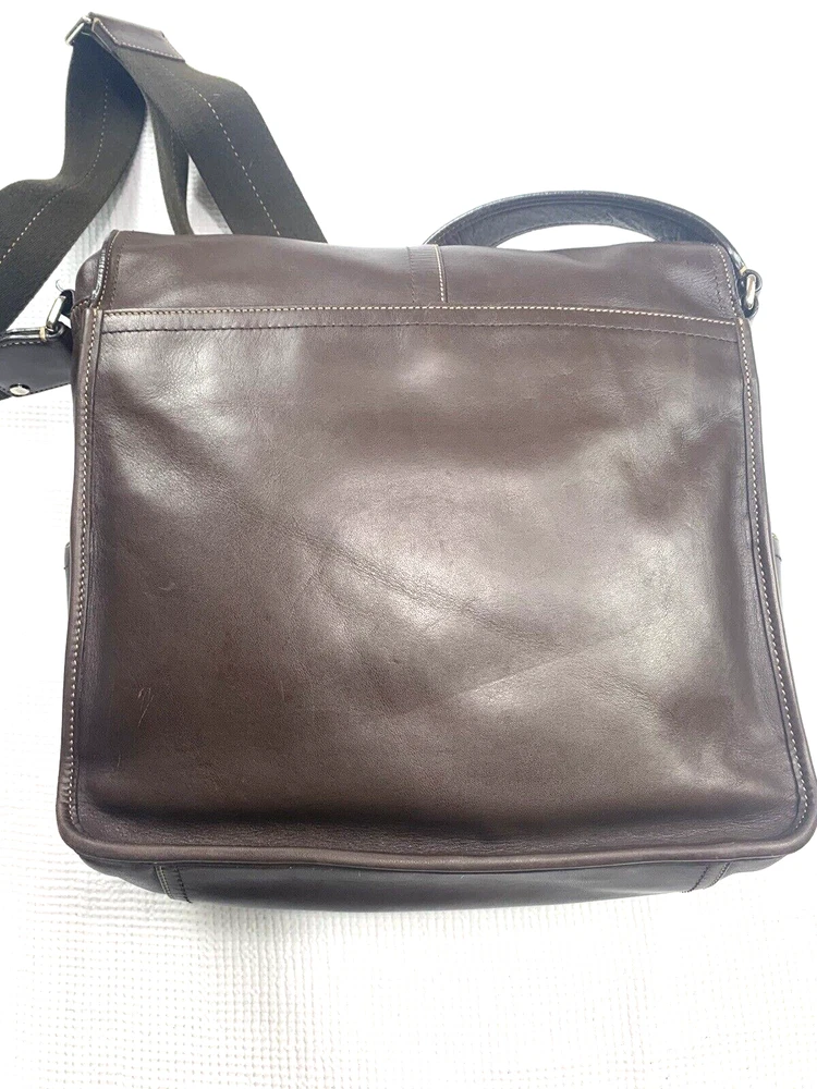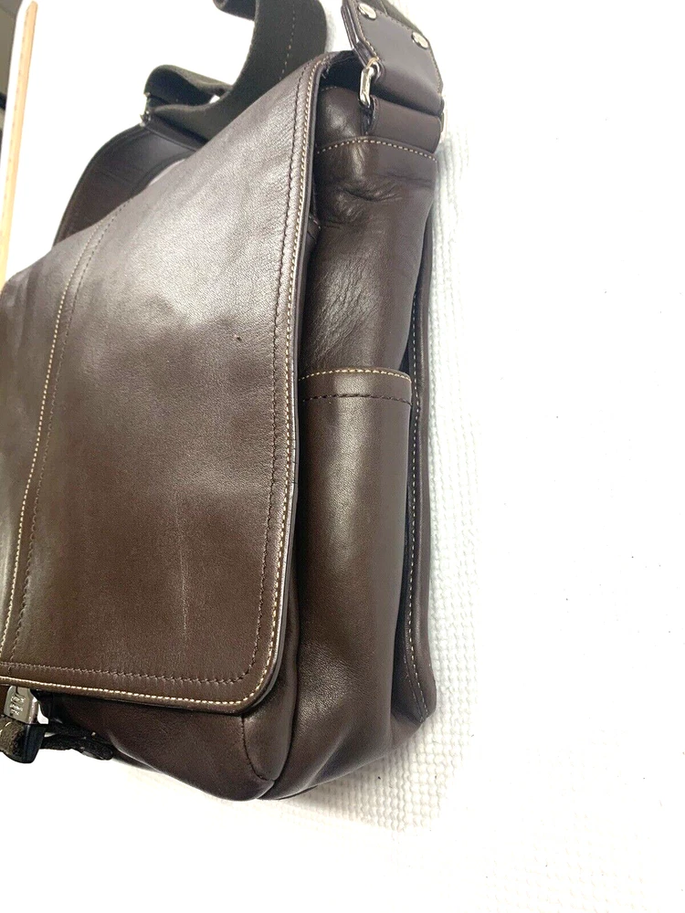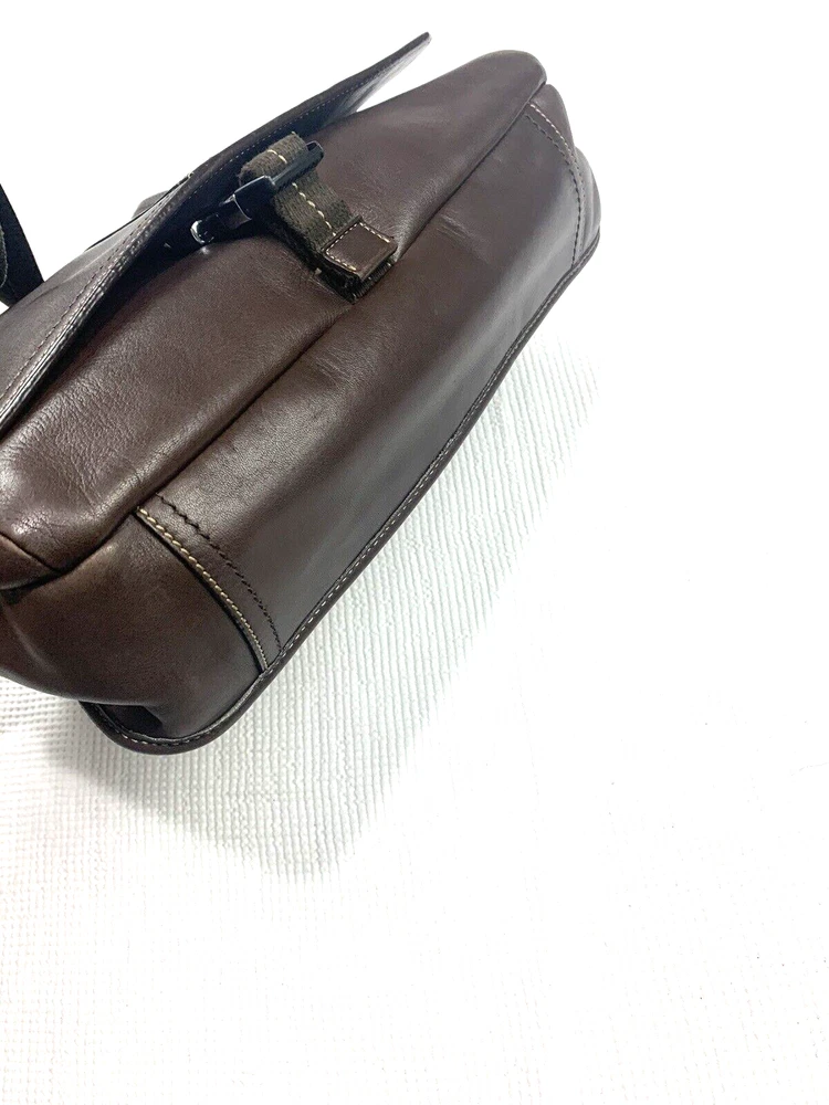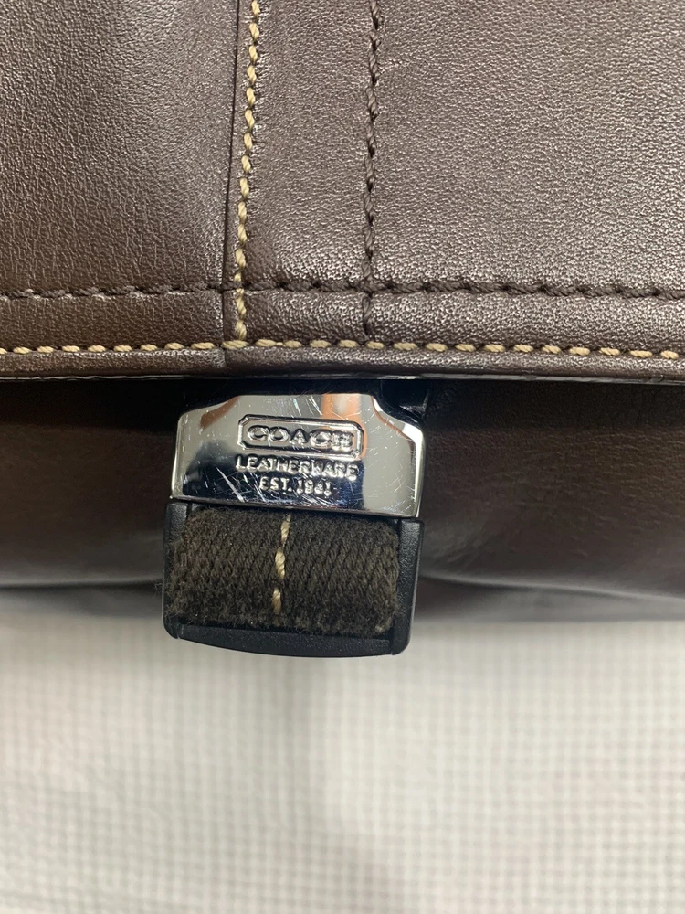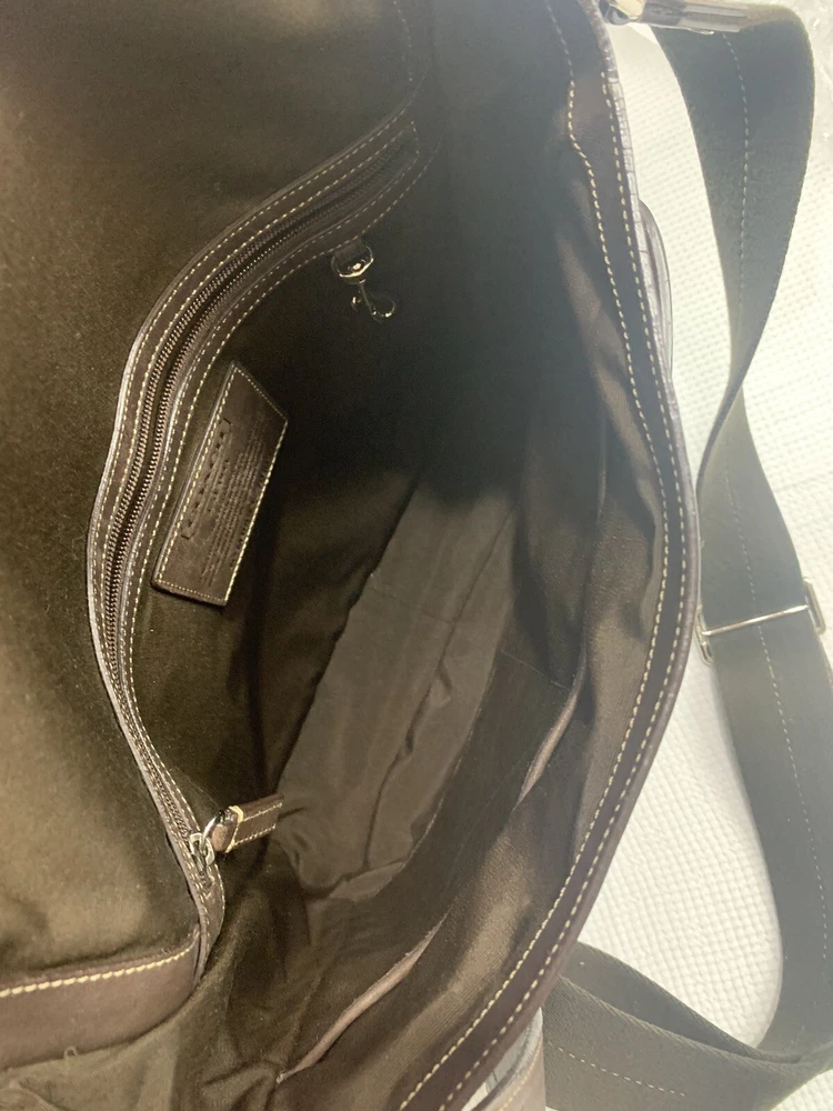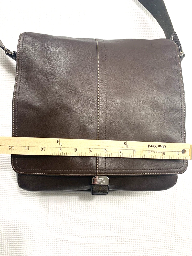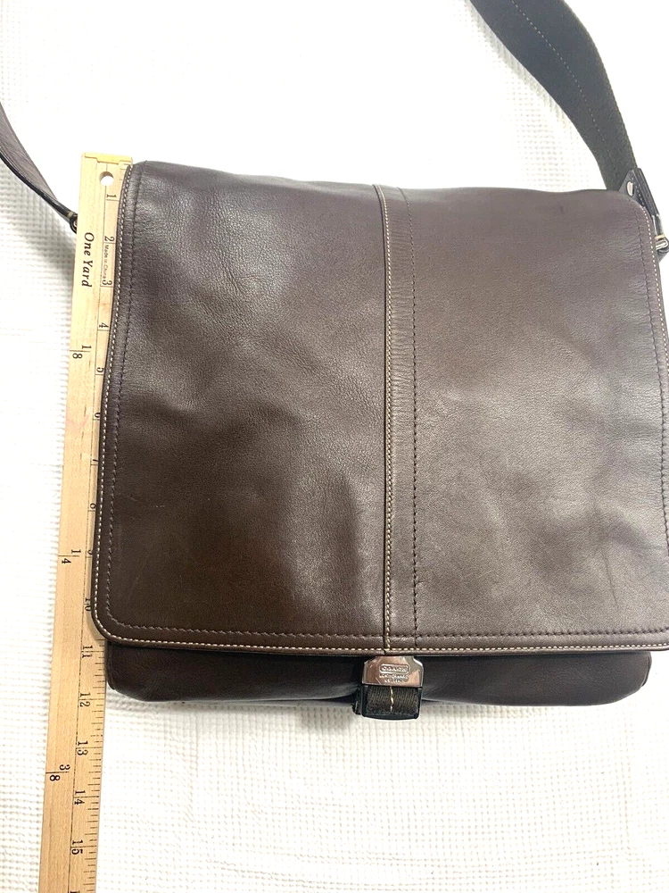 This Coach Lenox Brief in brown leather is a versatile crossbody bag with a vintage touch. It features a solid pattern with a strap accent . The bag has a magnetic catch fastener and an adjustable cotton strap with a brown color. The bag is large with dimensions of 12 inches for the width and height, and 5 inches for the depth. It has inner dividers and credit card slots for added organization, and it comes with a detachable strap, pouch, key holder, and handle keeper as accessories. The bag is part of the Coach Legacy product line and comes with a certificate of authenticity. The bag is suitable for both men and women and has a bohemian and city theme.