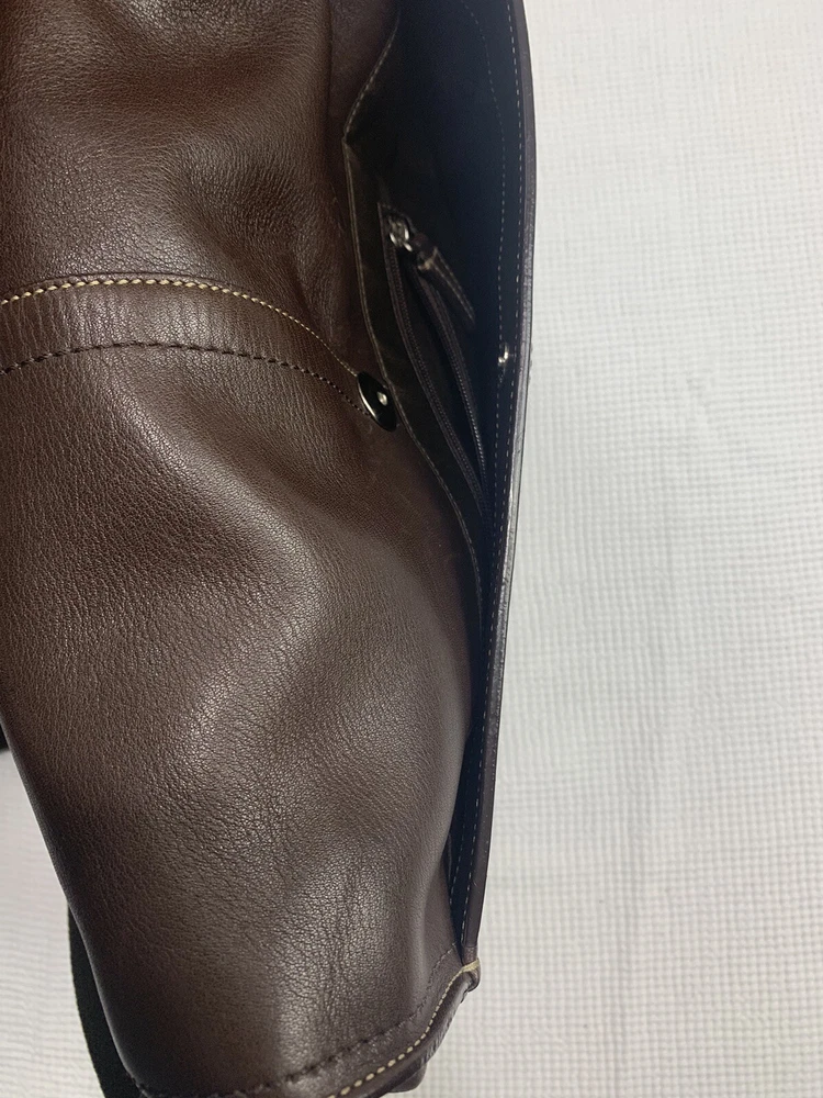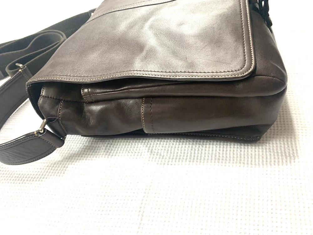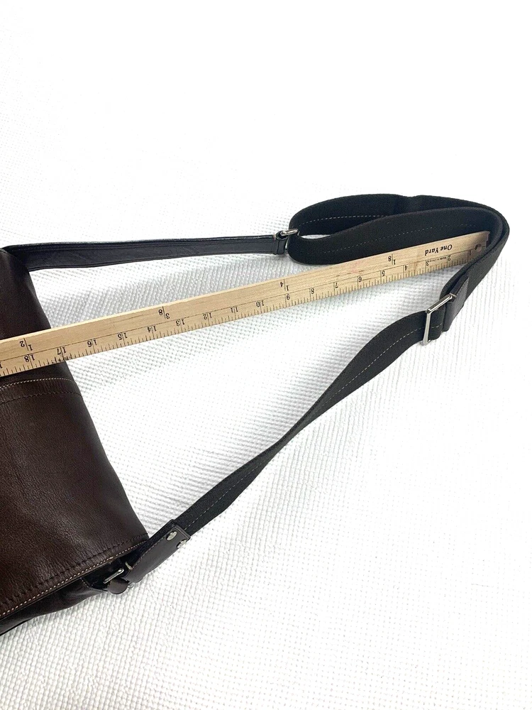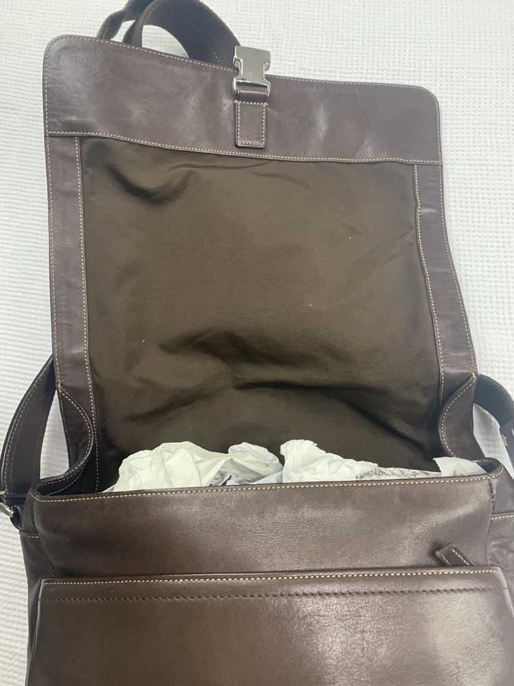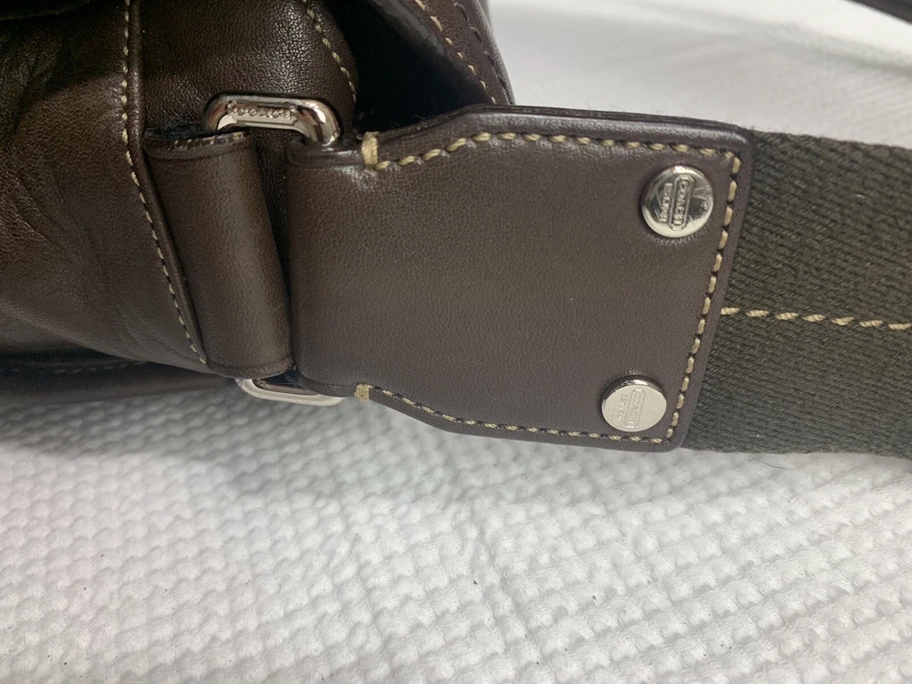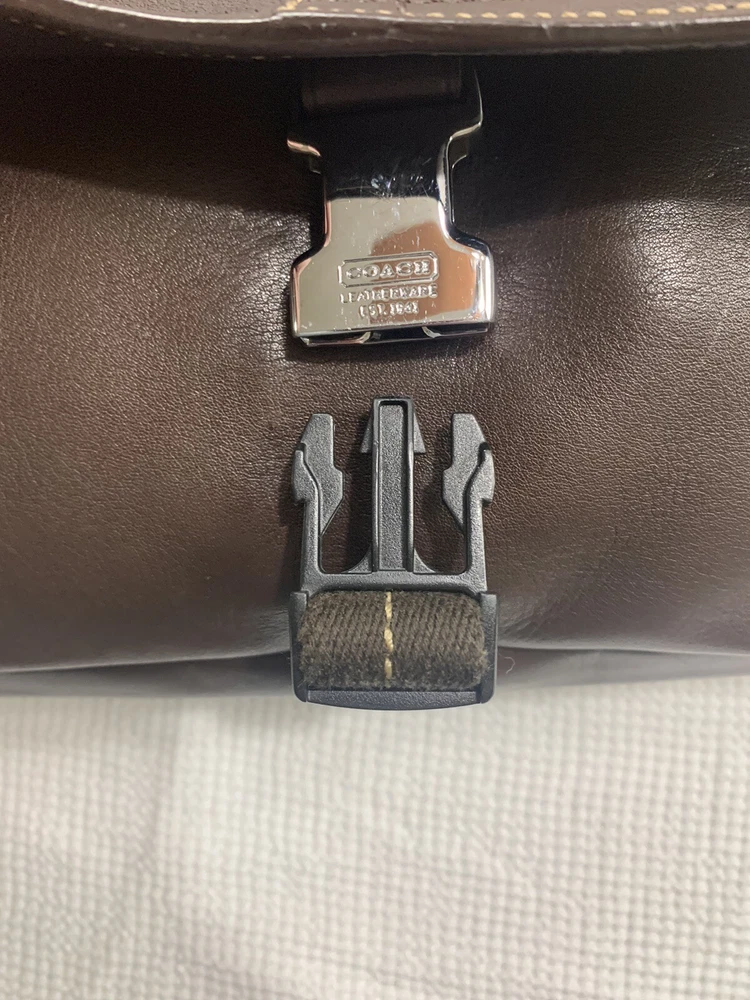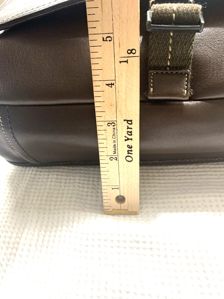 This Coach Lenox Brief in brown leather is a versatile crossbody bag with a vintage touch. It features a solid pattern with a strap accent . The bag has a magnetic catch fastener and an adjustable cotton strap with a brown color. The bag is large with dimensions of 12 inches for the width and height, and 5 inches for the depth. It has inner dividers and credit card slots for added organization, and it comes with a detachable strap, pouch, key holder, and handle keeper as accessories. The bag is part of the Coach Legacy product line and comes with a certificate of authenticity. The bag is suitable for both men and women and has a bohemian and city theme.