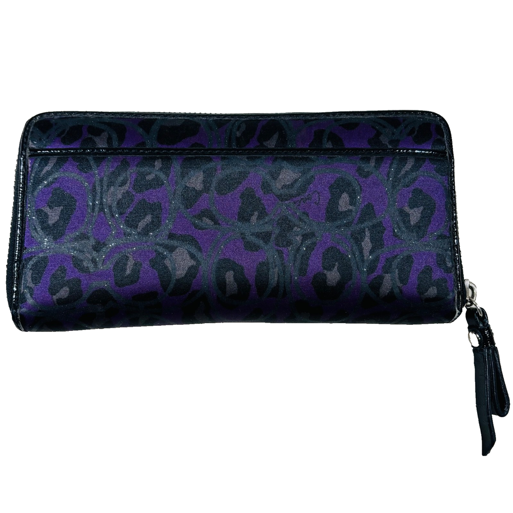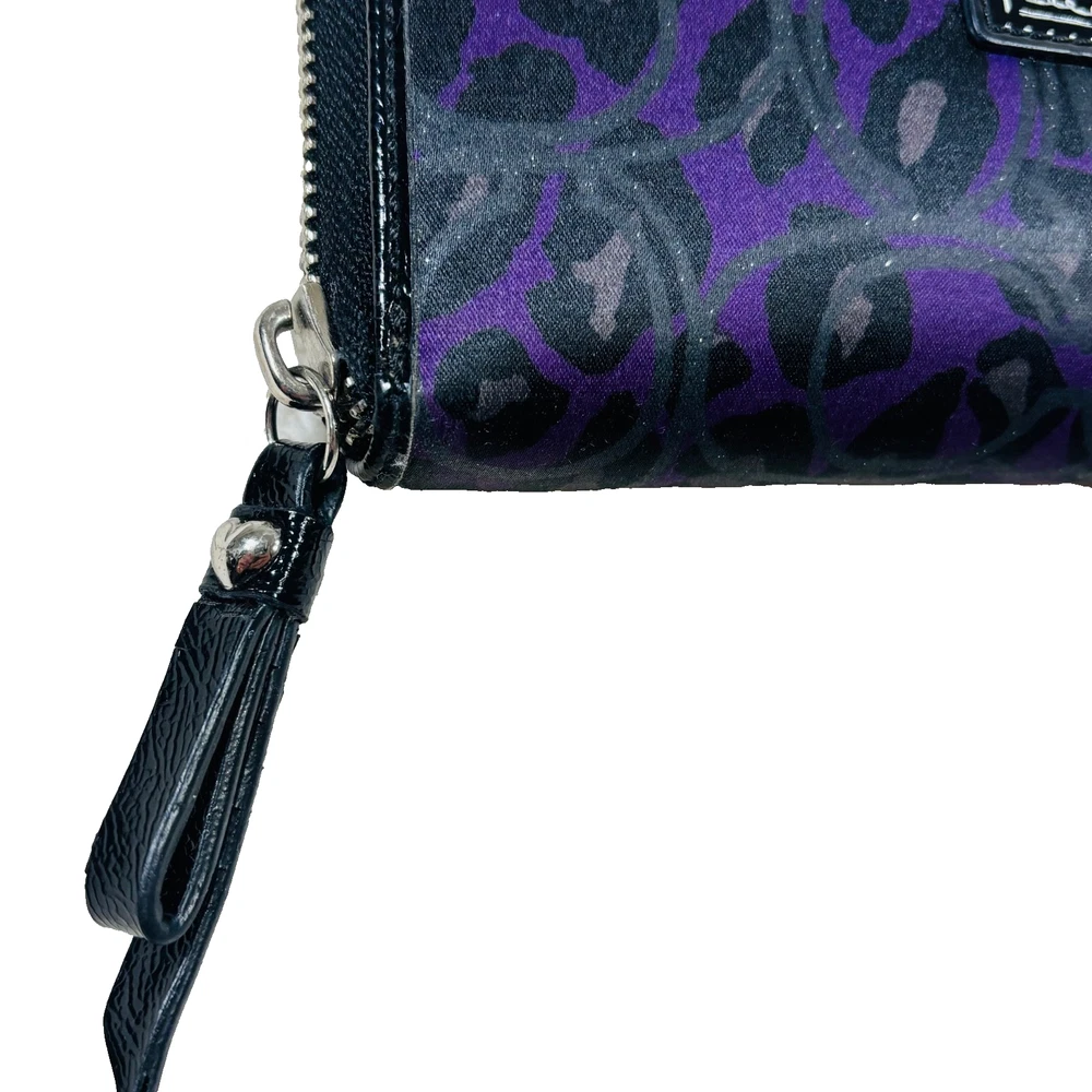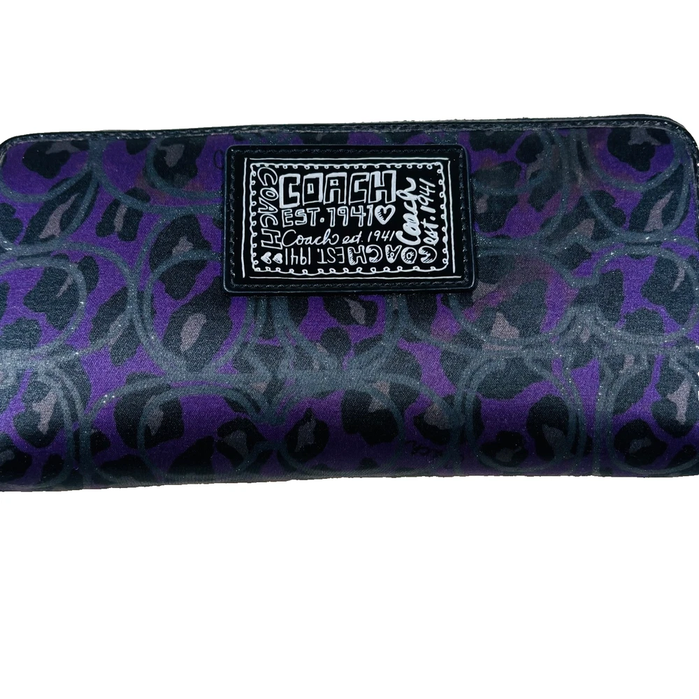 The Coach Authentic Poppy Purple Zip Full Size Wallet is a rare and stylish accessory for women. Made of leather with a solid purple color and pebbles pattern, this wallet features a zip-around style with credit card accents. The Coach logo adds a touch of luxury to this one-size wallet, perfect for keeping your essentials organized in a fashionable way.