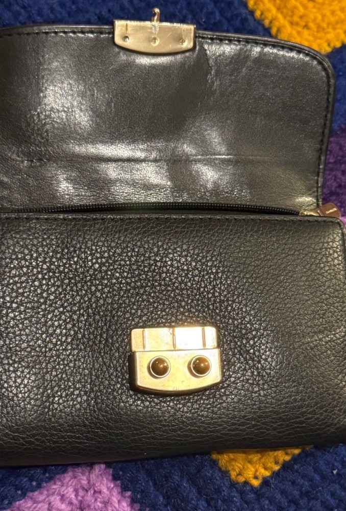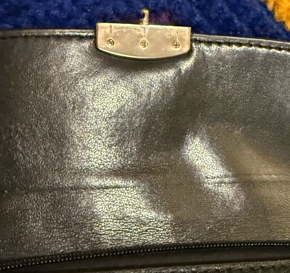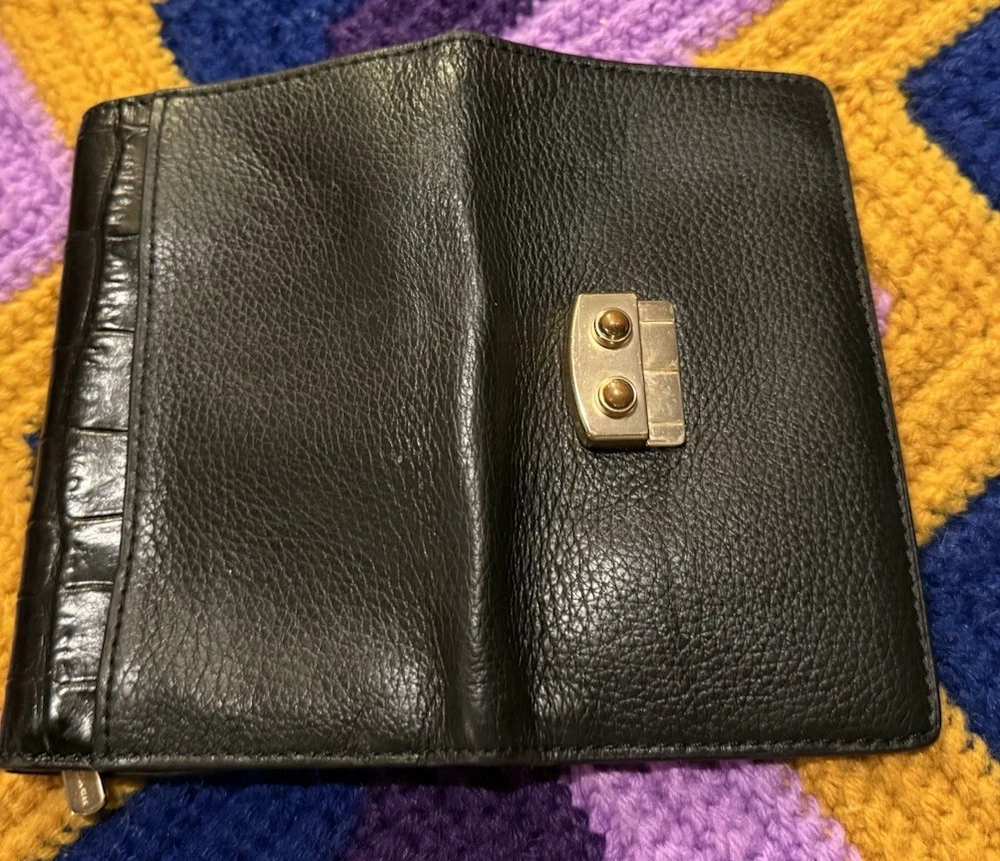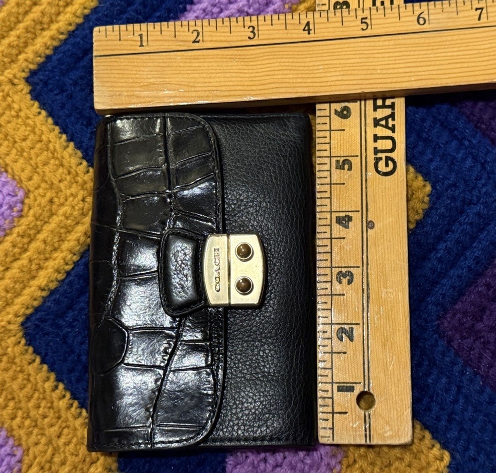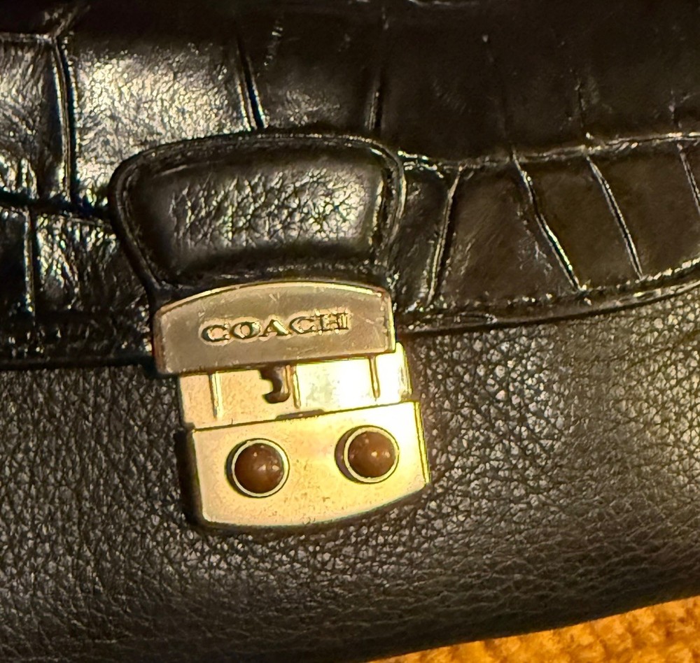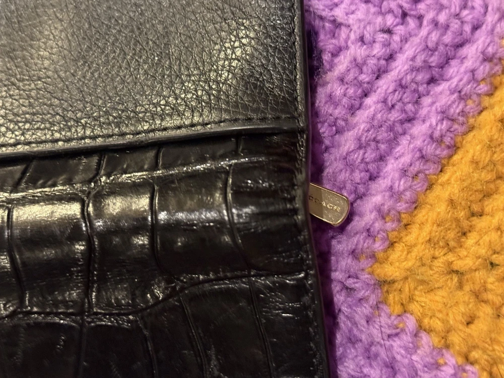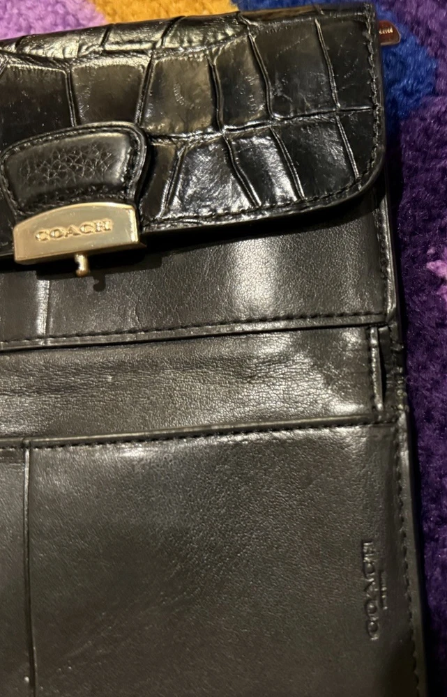 This Coach wallet is a stylish vintage find with genuine pebble and croc leather—love the unique squeeze-to-open latch! Shows some wear but adds character. Perfect for those who appreciate classic designer pieces with a lived-in look. Great size for everyday use, and the black leather still looks chic. A solid pre-loved steal!