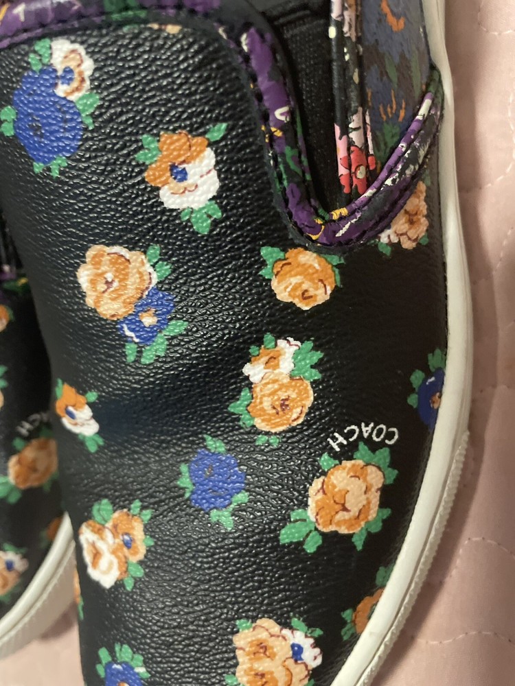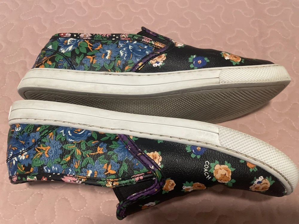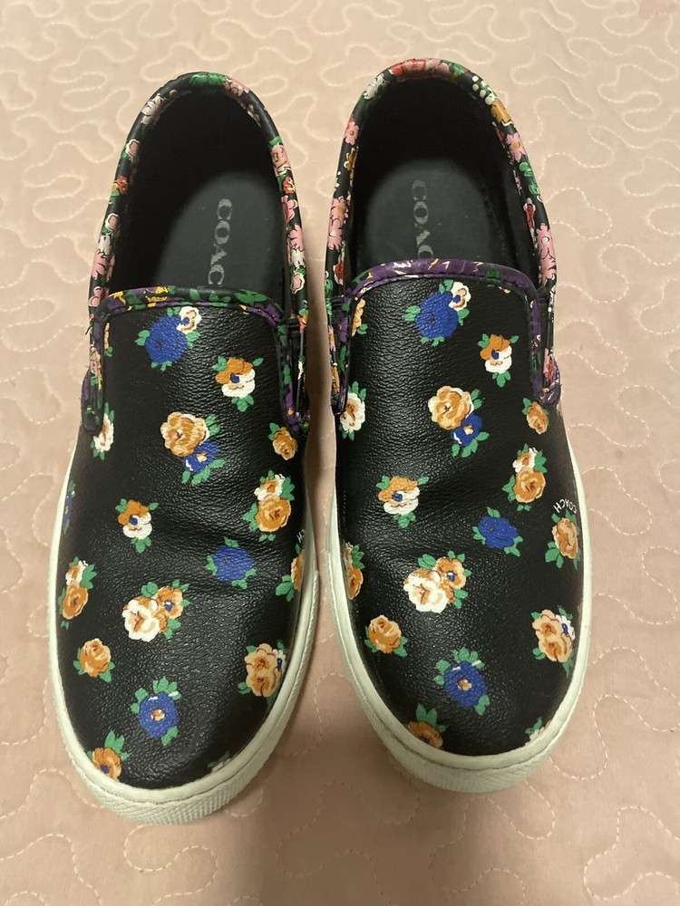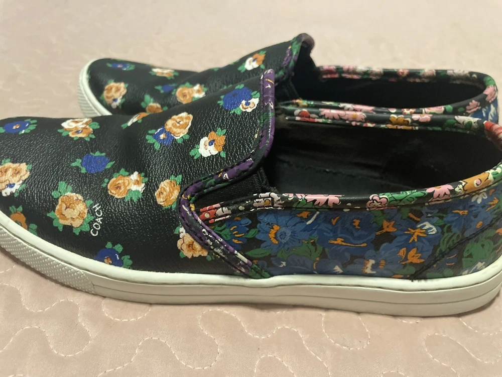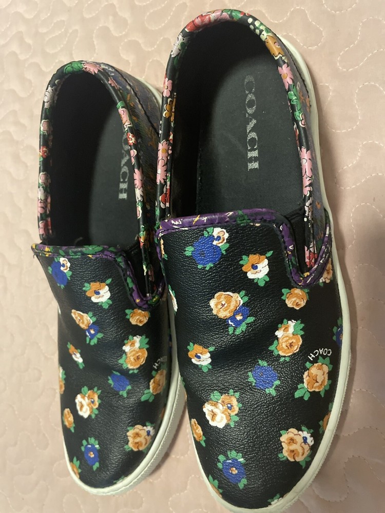 Elevate your style with these beautiful Coach women's loafers. The black floral pattern on the coated canvas upper adds a touch of elegance to any outfit, whether for travel or casual wear. The round toe shape and slip-on closure ensure a comfortable fit, while the rubber outsole provides slip resistance and waterproofing. These loafers come in a size 7.5 US/37.5 EU with a medium width and feature the Coach logo as an accent. They are perfect for any season, whether winter, summer, fall, or spring. The padded features and Coach signature product line make them a must-have for any fashion-forward woman.Good condition