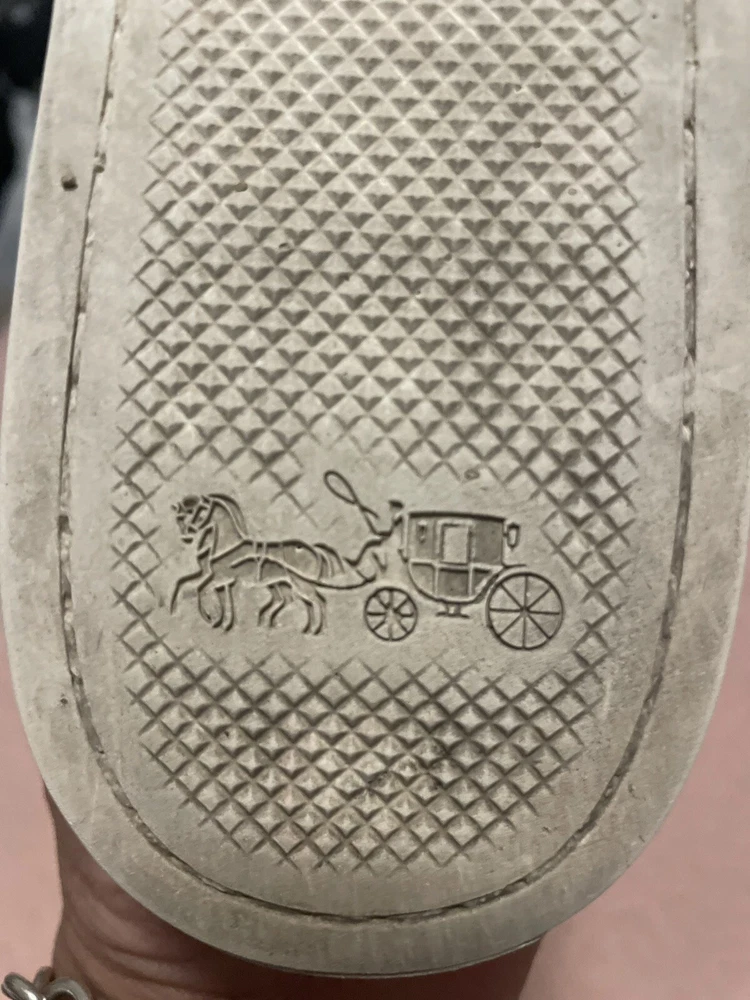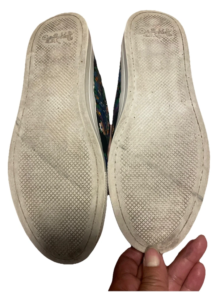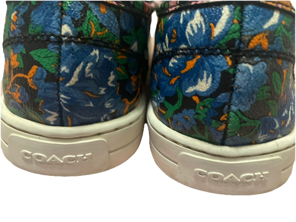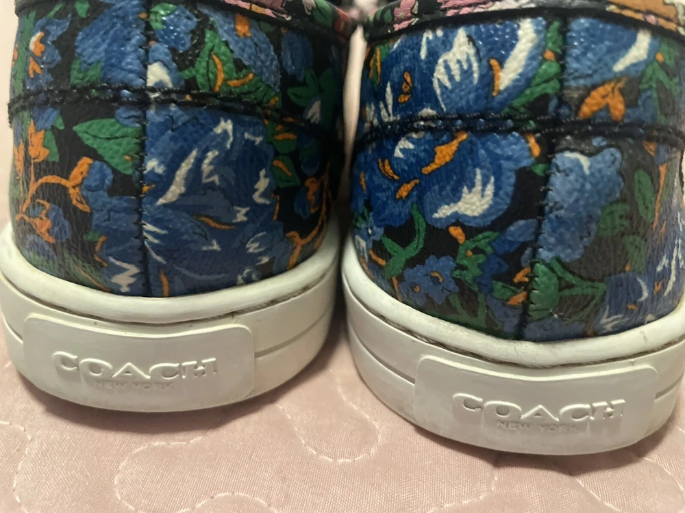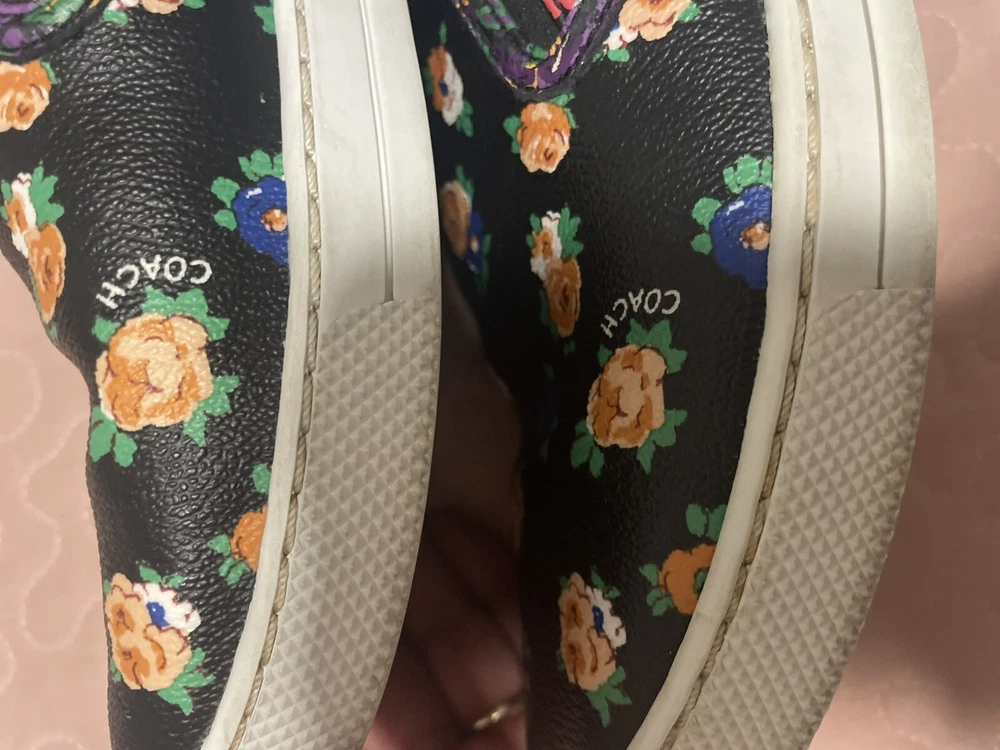 Elevate your style with these beautiful Coach women's loafers. The black floral pattern on the coated canvas upper adds a touch of elegance to any outfit, whether for travel or casual wear. The round toe shape and slip-on closure ensure a comfortable fit, while the rubber outsole provides slip resistance and waterproofing. These loafers come in a size 7.5 US/37.5 EU with a medium width and feature the Coach logo as an accent. They are perfect for any season, whether winter, summer, fall, or spring. The padded features and Coach signature product line make them a must-have for any fashion-forward woman.Good condition