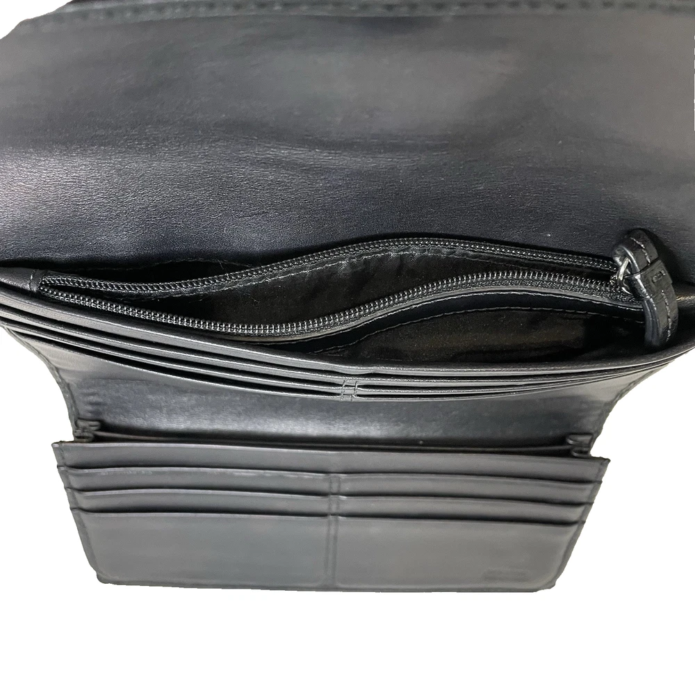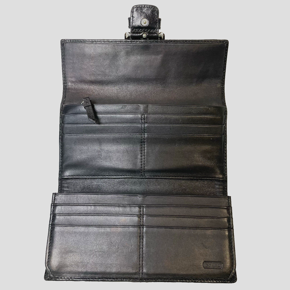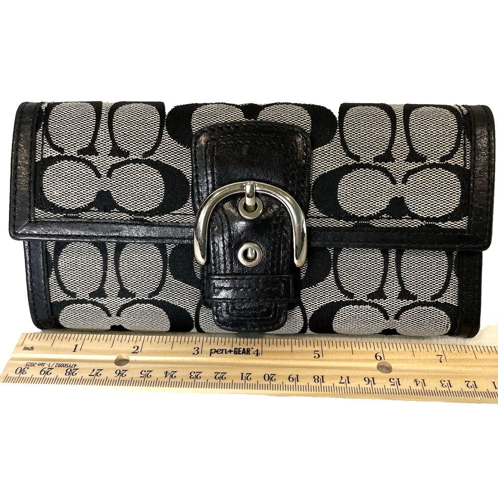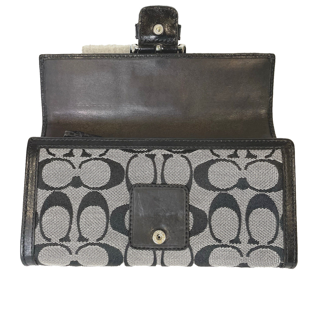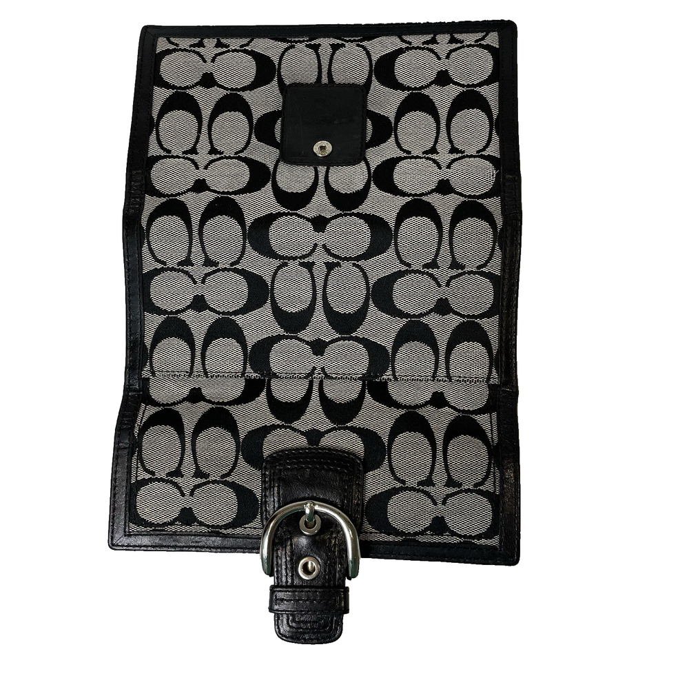 This vintage Coach black & gray signature jacquard fabric with buckle trifold wallet is in very good condition. Made with a combination of jacquard fabric and leather, this wallet features the signature "C" pattern. The trifold design makes it easy to carry all your essentials. The interior is made of high-quality black leather. Contains a zippered coin pouch, 12 slots for cards, three slots for paper and receipts, one checkbook slot, and one slot on the back exterior.