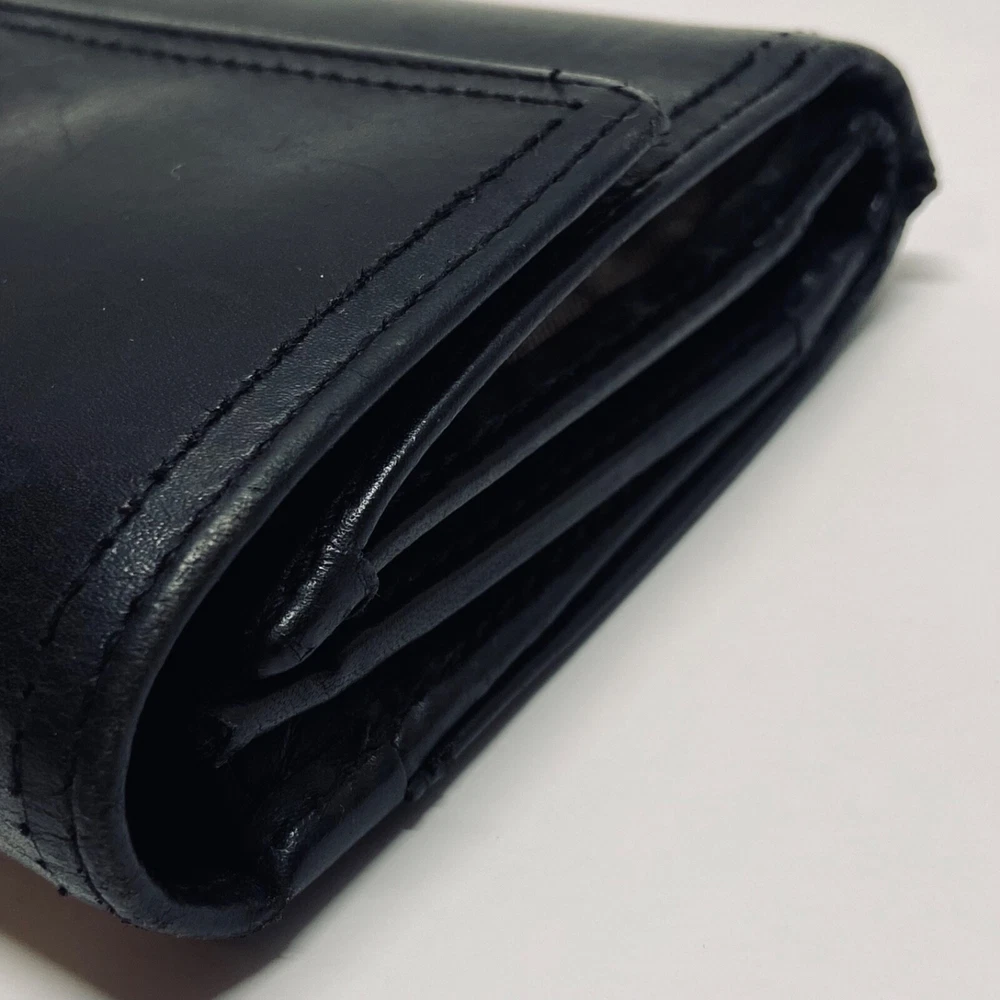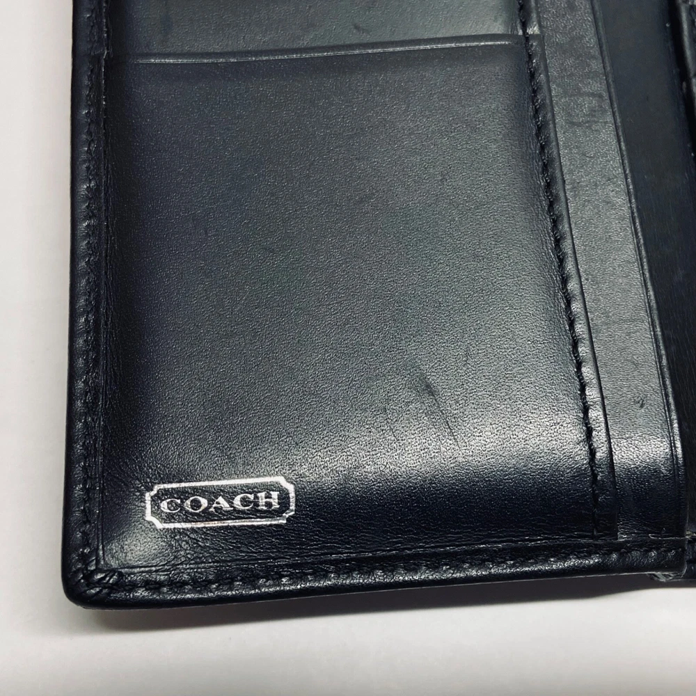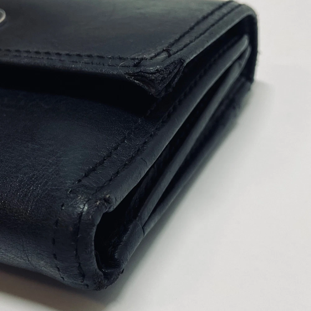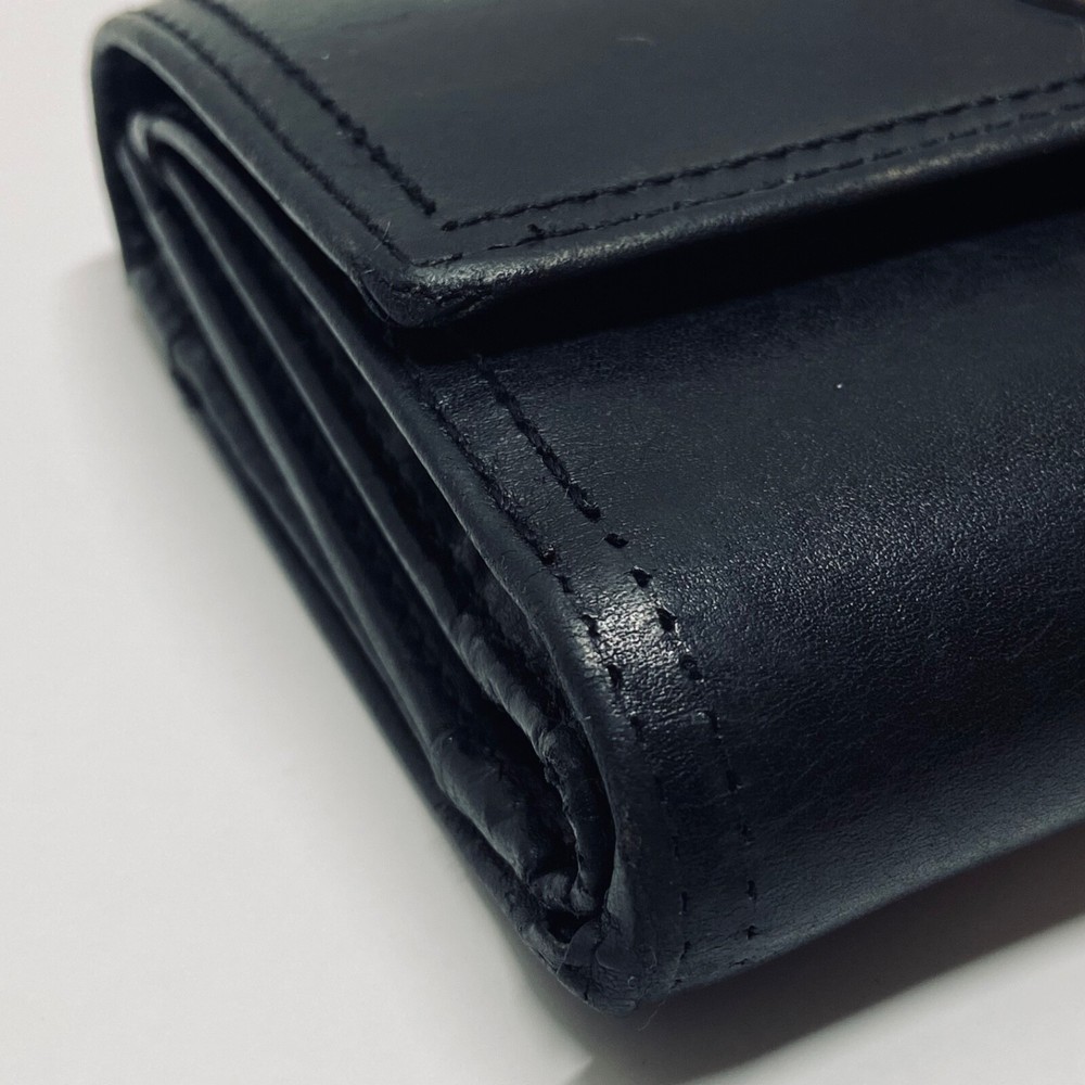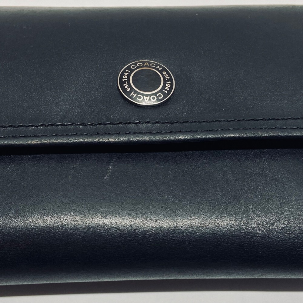 Coach Women's Black Leather Trifold Wallet Snap Front Medium Size Good Condition Item is pre-owned with moderate signs of use. There is signs of wear on the edges. Please see all photos as this is the exact item you will receive. Features 8 card slots and a zippered coin area. Dimensions of wallet are 5.5" w and 3.5" h. Thanks for looking!