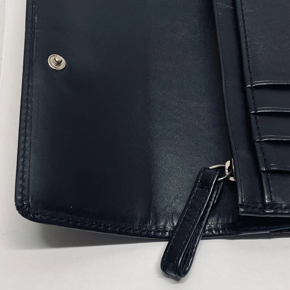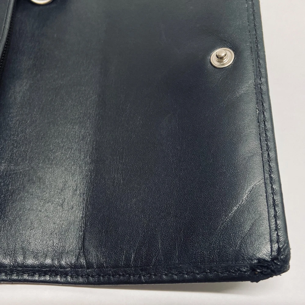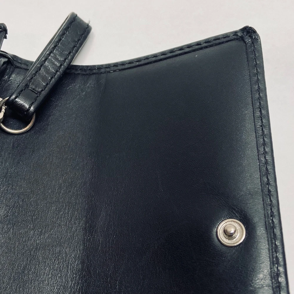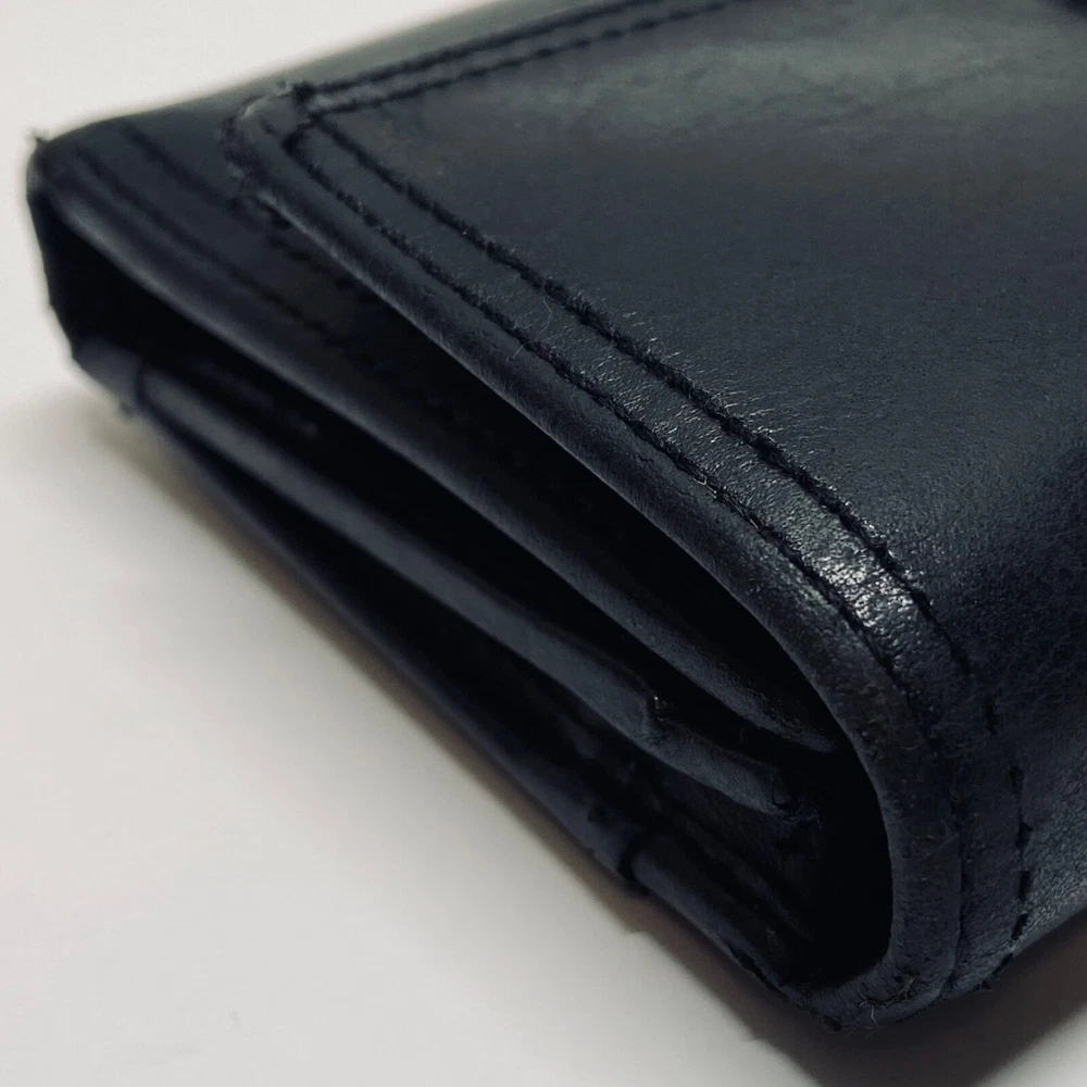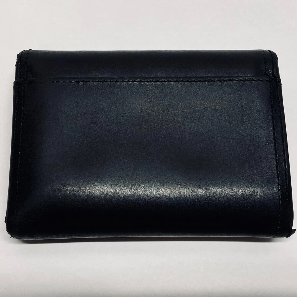 Coach Women's Black Leather Trifold Wallet Snap Front Medium Size Good Condition Item is pre-owned with moderate signs of use. There is signs of wear on the edges. Please see all photos as this is the exact item you will receive. Features 8 card slots and a zippered coin area. Dimensions of wallet are 5.5" w and 3.5" h. Thanks for looking!