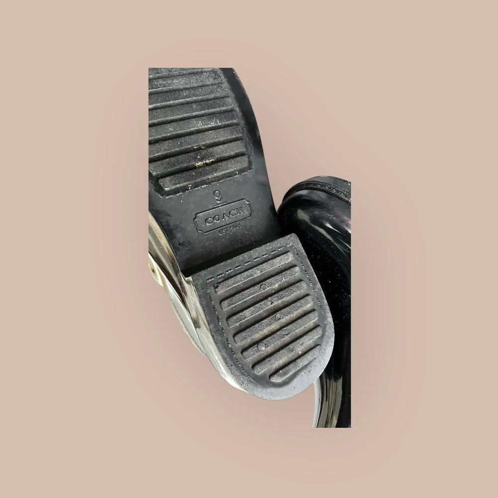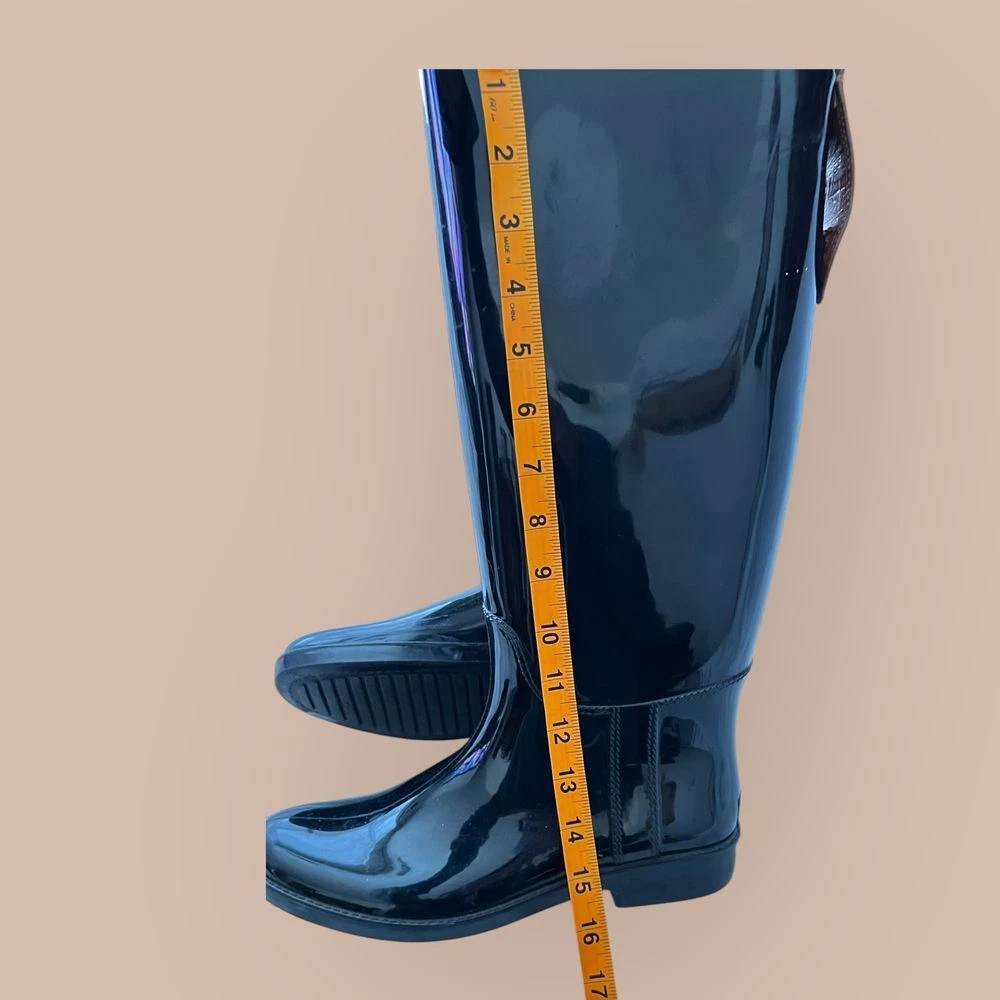 Elevate your rainy day style with these sleek patent leather rain boots. Featuring a classic riding boot silhouette with brown leather pull tabs, these waterproof boots combine fashion with function. Perfect for wet weather, festivals, or garden activities while maintaining a polished look. The sturdy rubber sole provides excellent traction, making these boots both practical and stylish. Style: Rain Boot Color: Black Department: Women Upper Material: Patent Leather Shoe Shaft Style: Knee High Lining Material: Synthetic Insole Material: Synthetic Outsole Material: Rubber Heel Height: Flat (Under 1 in) Heel Style: Flat Occasion: Casual, Travel, Activewear Keywords: coach boots, rain boots, patent leather, waterproof boots, riding boots, tall boots, rubber sole, designer rain boots, wet weather, festival boots, garden boots, pull on boots